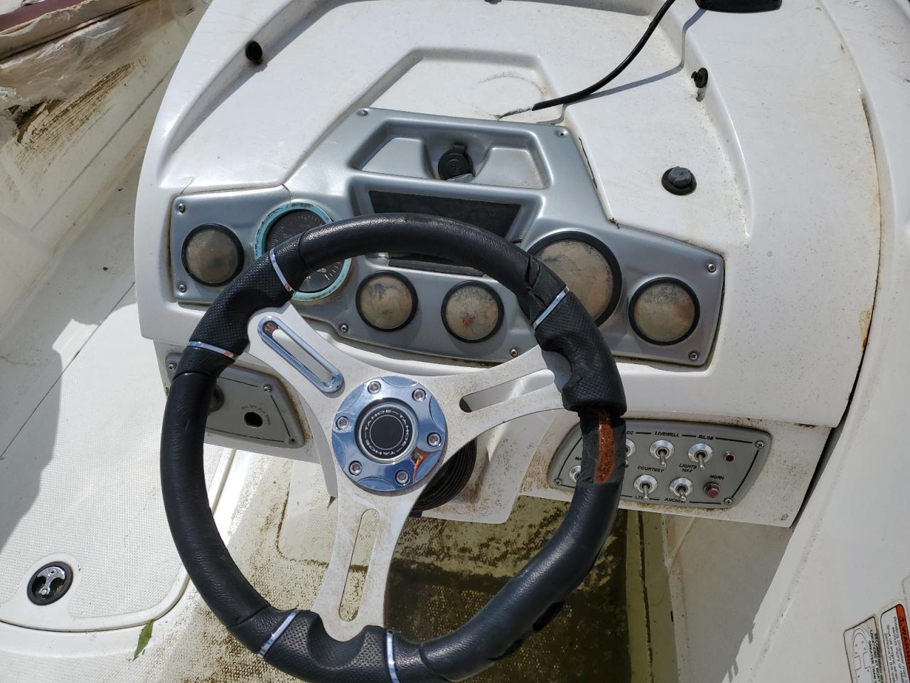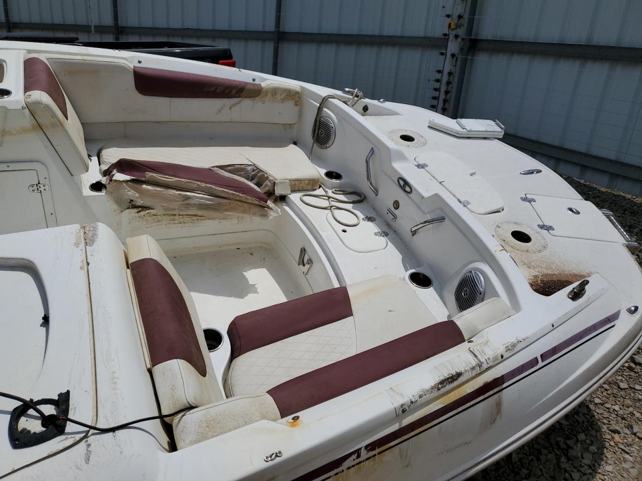 The boat has extensive water damage, with signs of flooding. The hull shows visible wear and tear. There is evidence of interior damage, likely due to water exposure. The engine and mechanical components may have been affected by the water. Interior components show staining and damage.