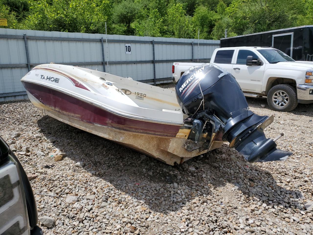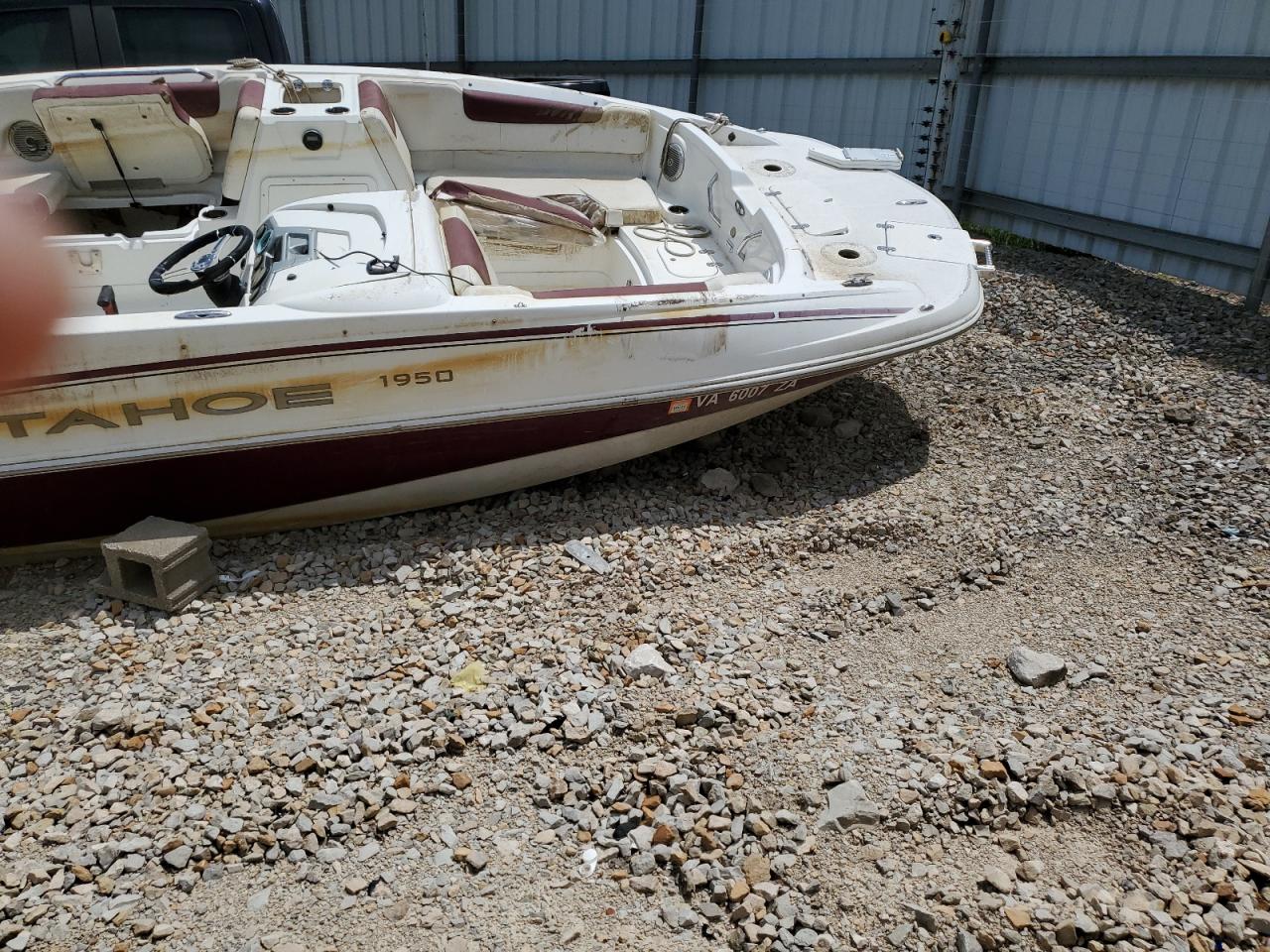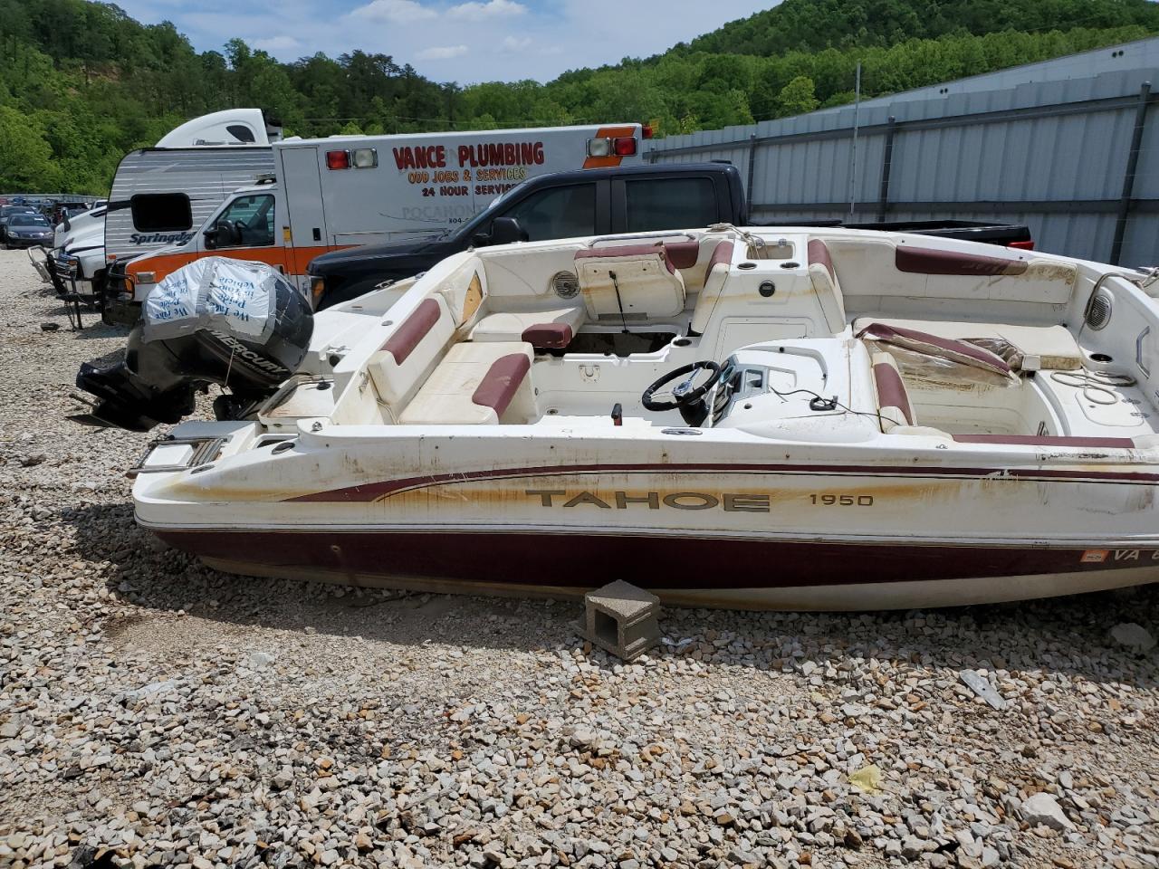 The 2019 TAHOE BOAT exhibits signs of significant water damage and flooding, impacting both its exterior and interior. The boat's two-tone color scheme shows wear. The vehicle has experienced substantial damage. It's condition requires considerable repair and is not drivable, with evident deterioration in multiple areas.