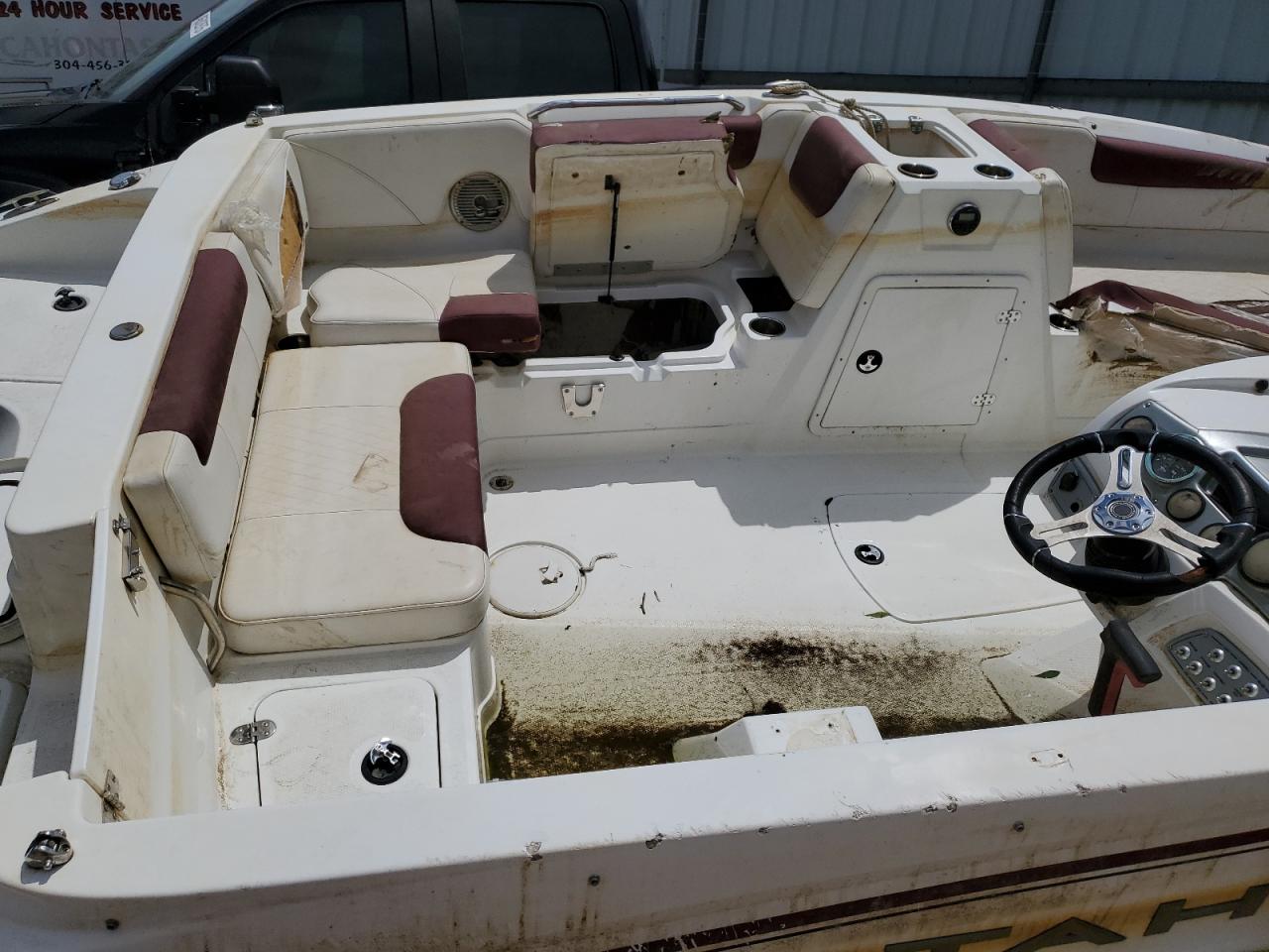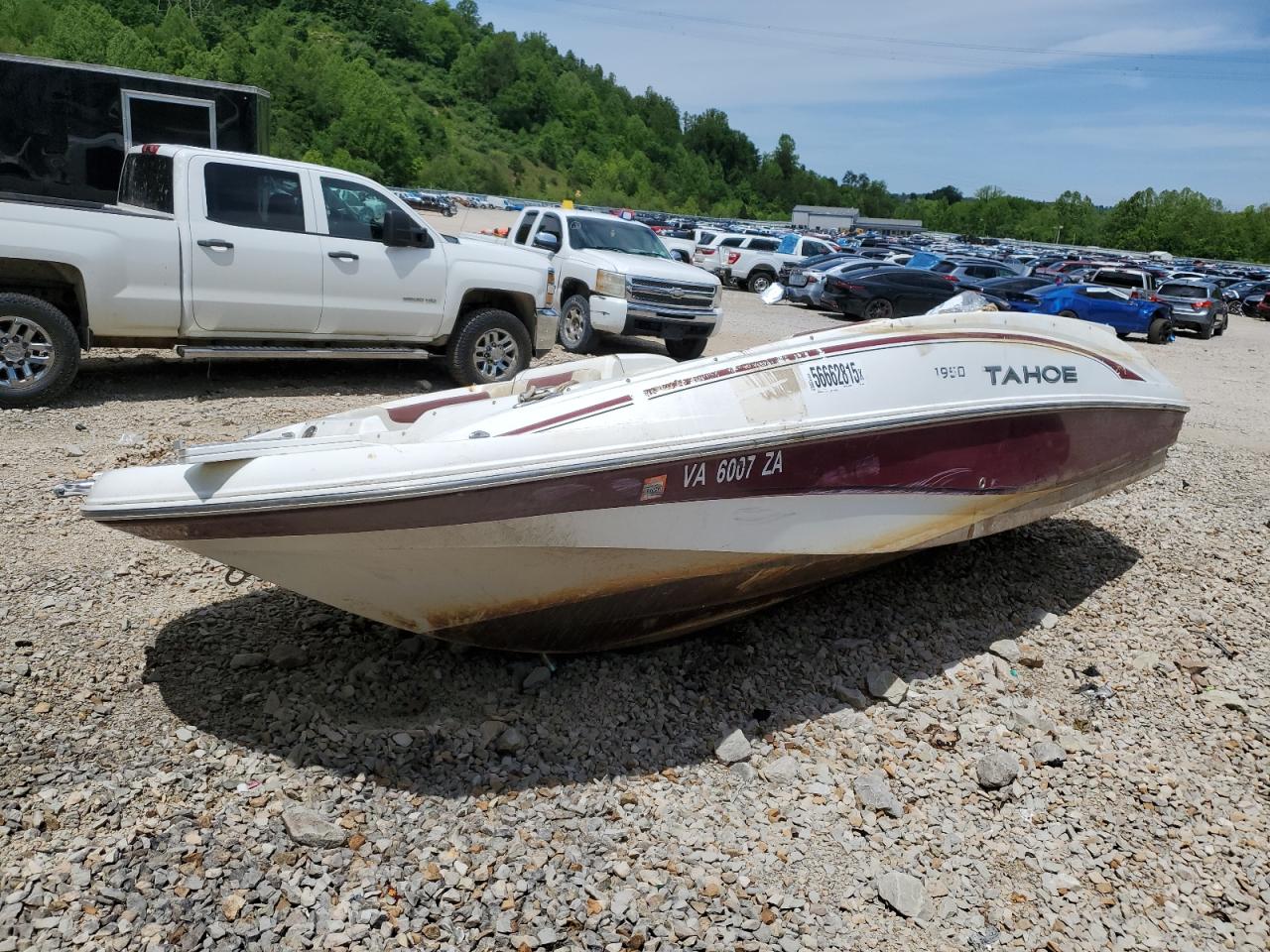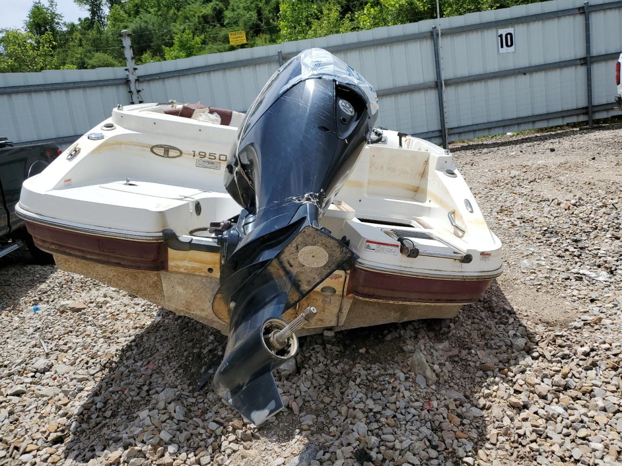 The 2019 TAHOE BOAT exhibits signs of significant water damage and flooding, impacting both its exterior and interior. The boat's two-tone color scheme shows wear. The vehicle has experienced substantial damage. It's condition requires considerable repair and is not drivable, with evident deterioration in multiple areas.