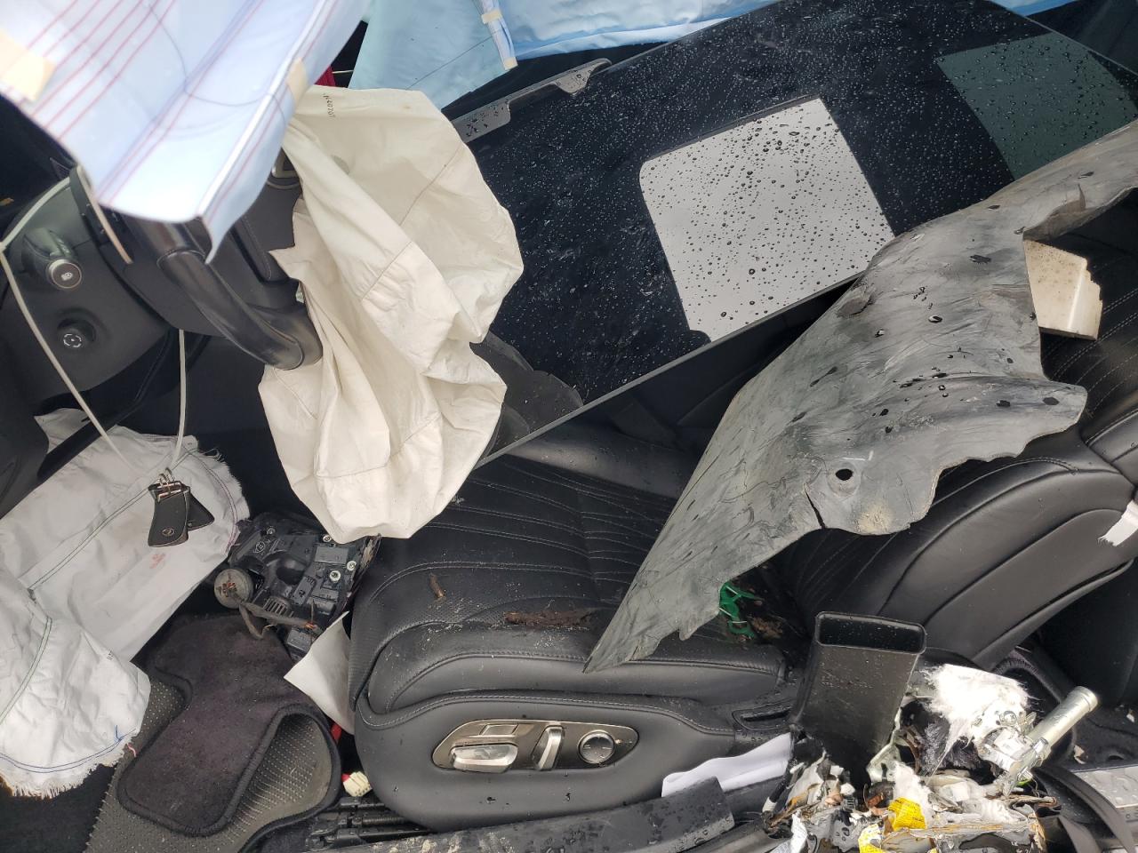 Extensive body damage with deployed airbags, significant structural and interior damage.