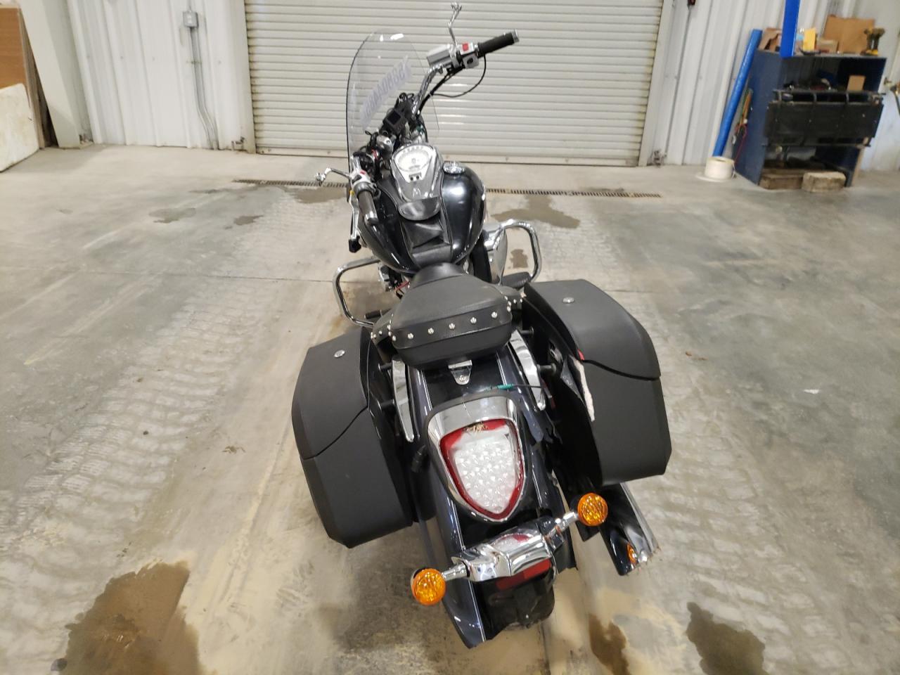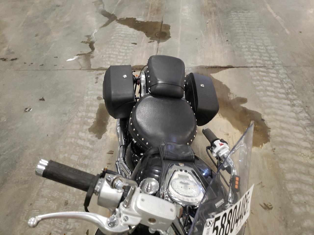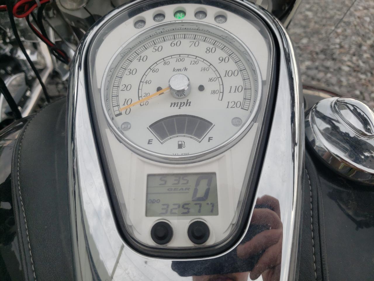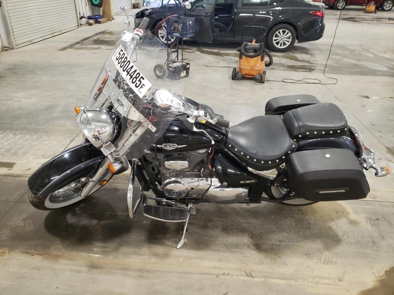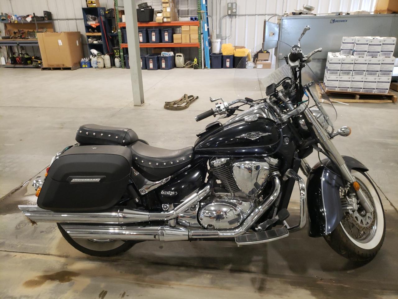 Fair2011 Suzuki VL800 with front end and side damage. The black motorcycle shows signs of moderate damage to the body panels. Despite the cosmetic issues, the vehicle is drivable, the interior shows minimal wear and tear.