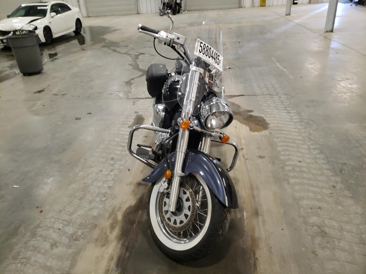 The motorcycle has damage to the front and side. Potential damage includes the front fairing, headlight, side panels, and possible frame alignment issues.