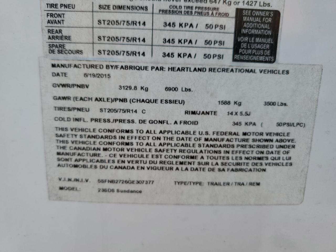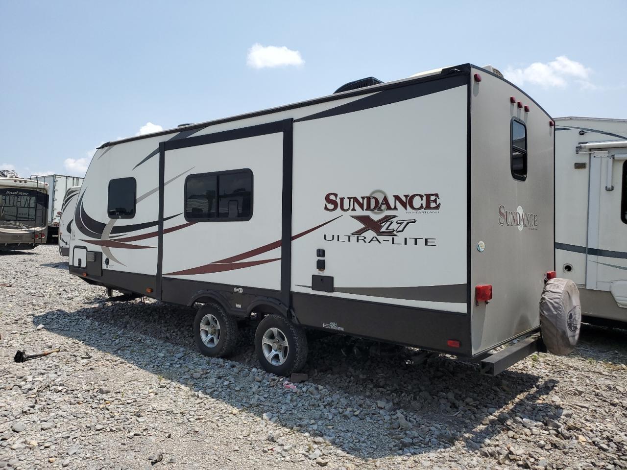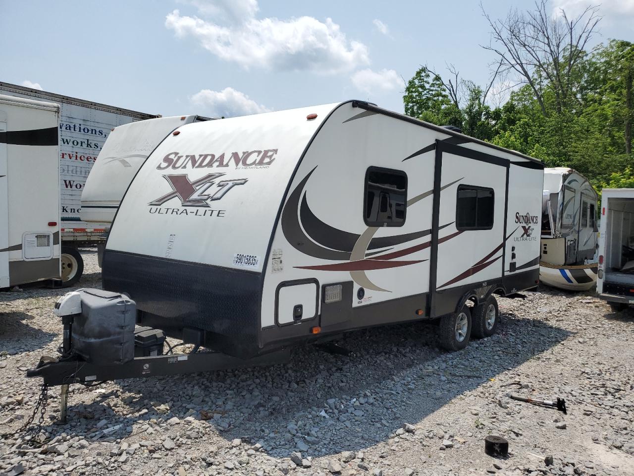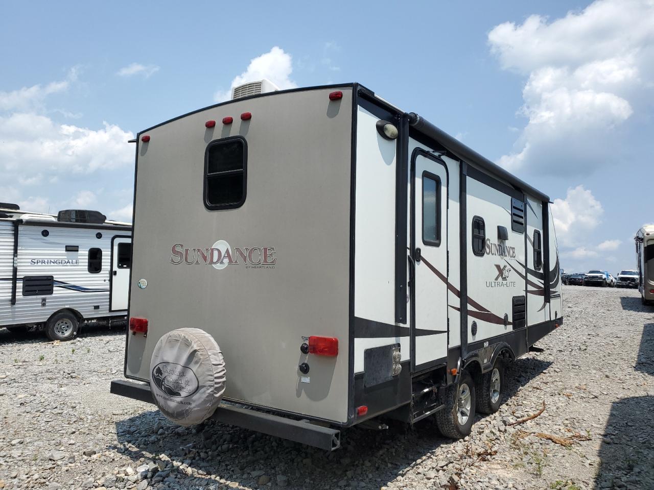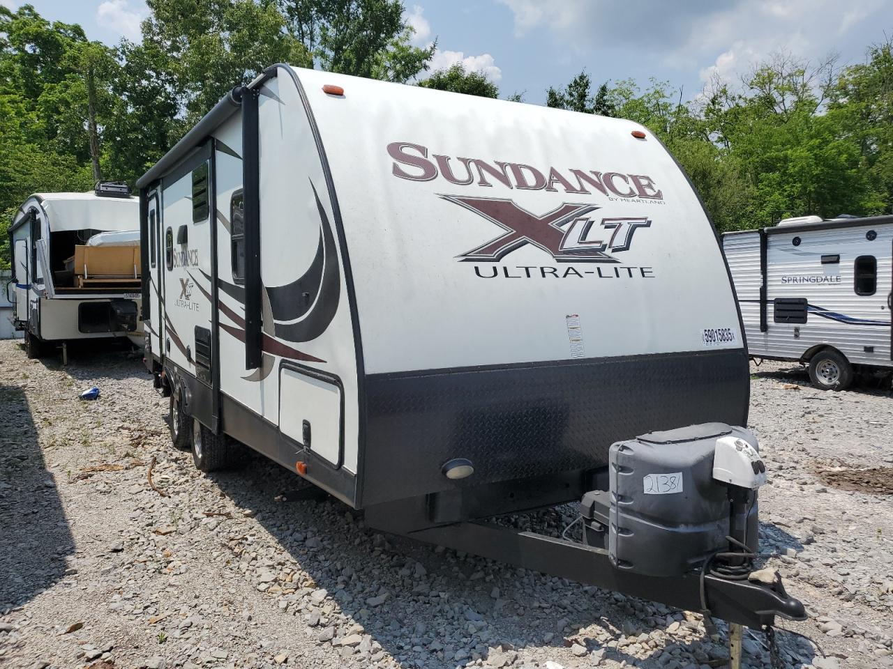 FairThis is a 2016 HEART LAND SUNDANCE, a two-tone RV. The primary damage is to the top/roof. Secondary damage is not present. Wheels, lights, and glasses appear to be in good condition. The vehicle's exterior shows moderate damage, and it may require repair, but it is drivable.