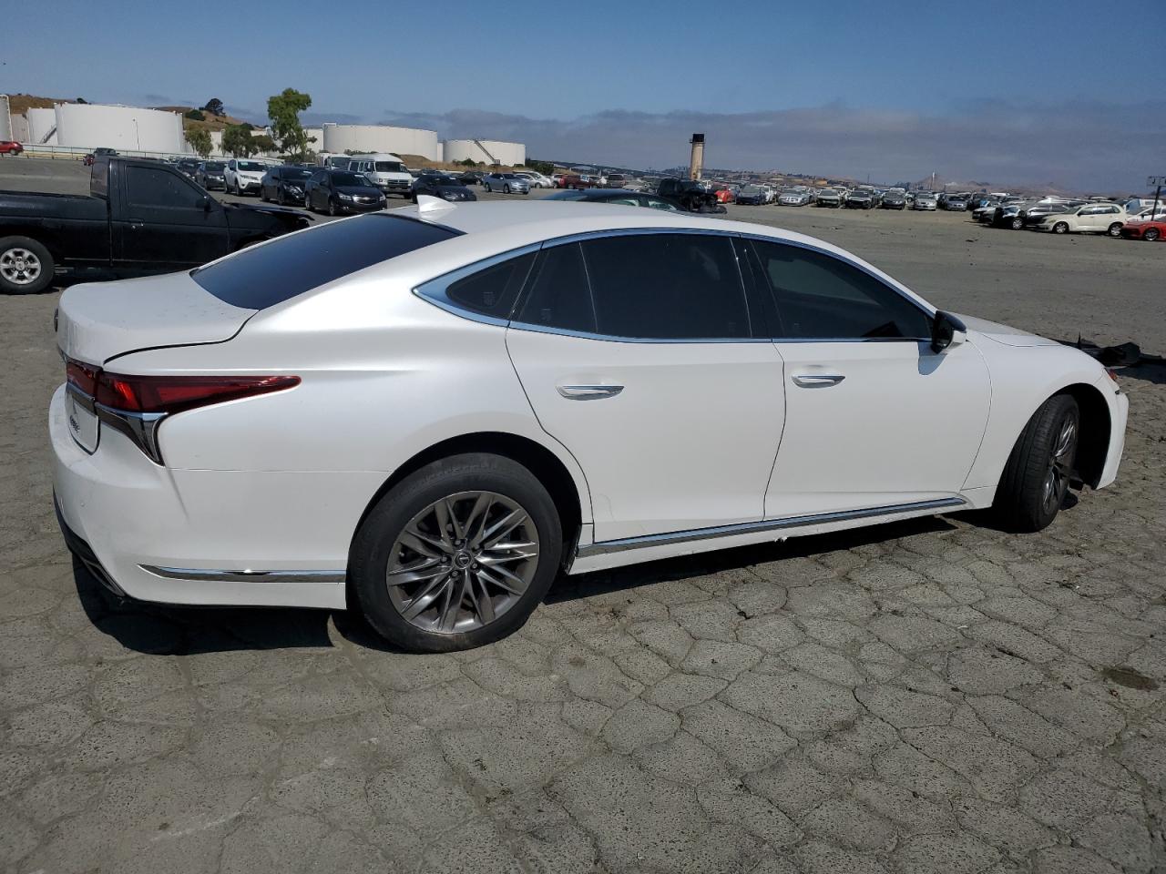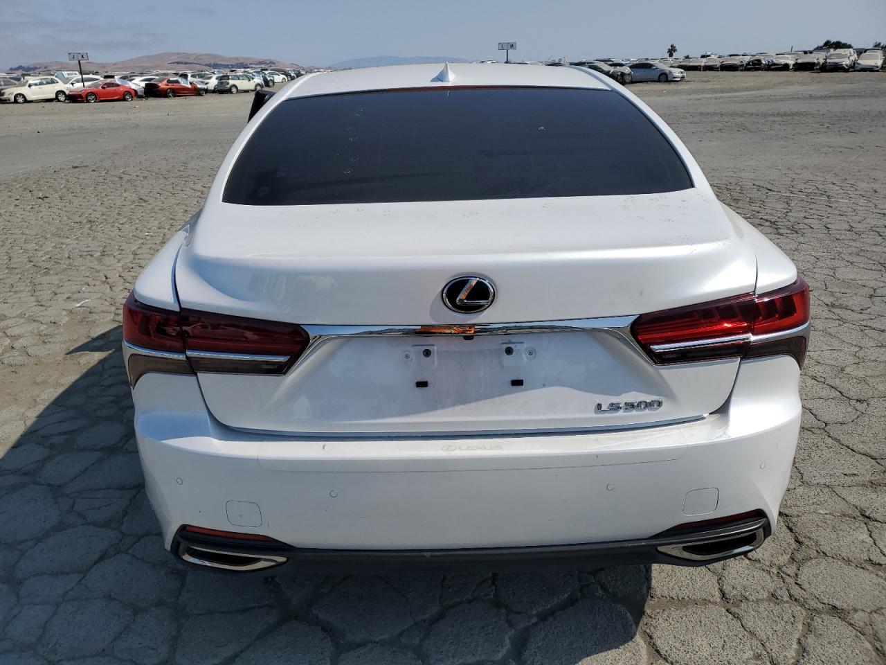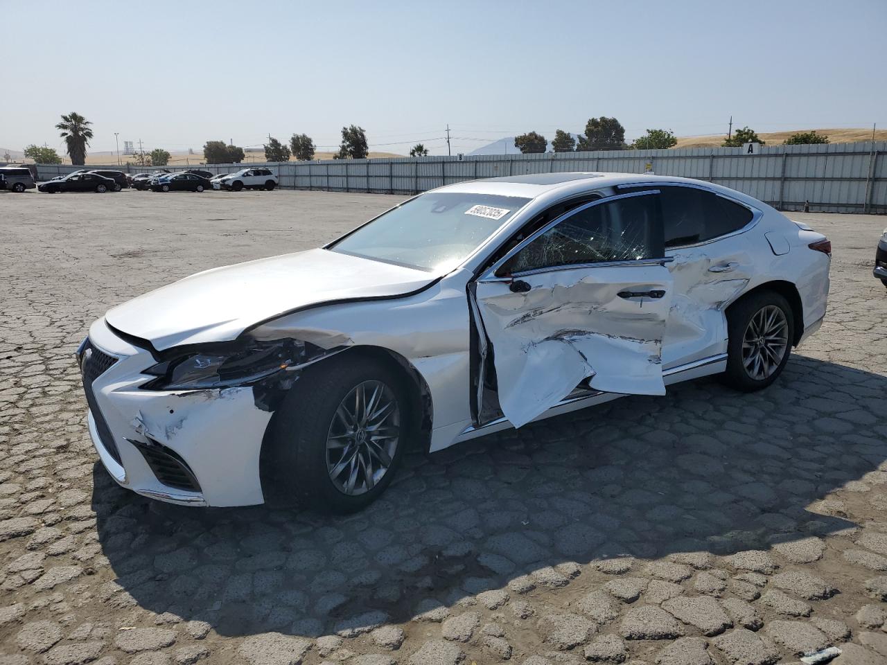 The white Lexus LS 500 has extensive damage across the body, with significant impact on multiple panels. The undercarriage also sustained damage. The interior shows signs of wear but is intact, with no obvious airbag deployment. The car has a Run & Drive Verified start code.
