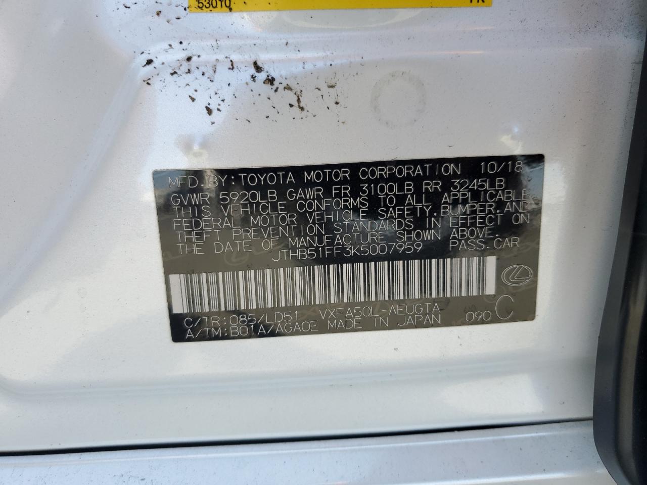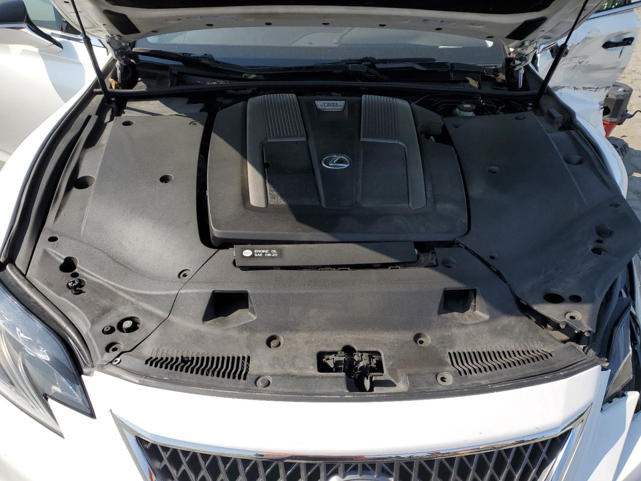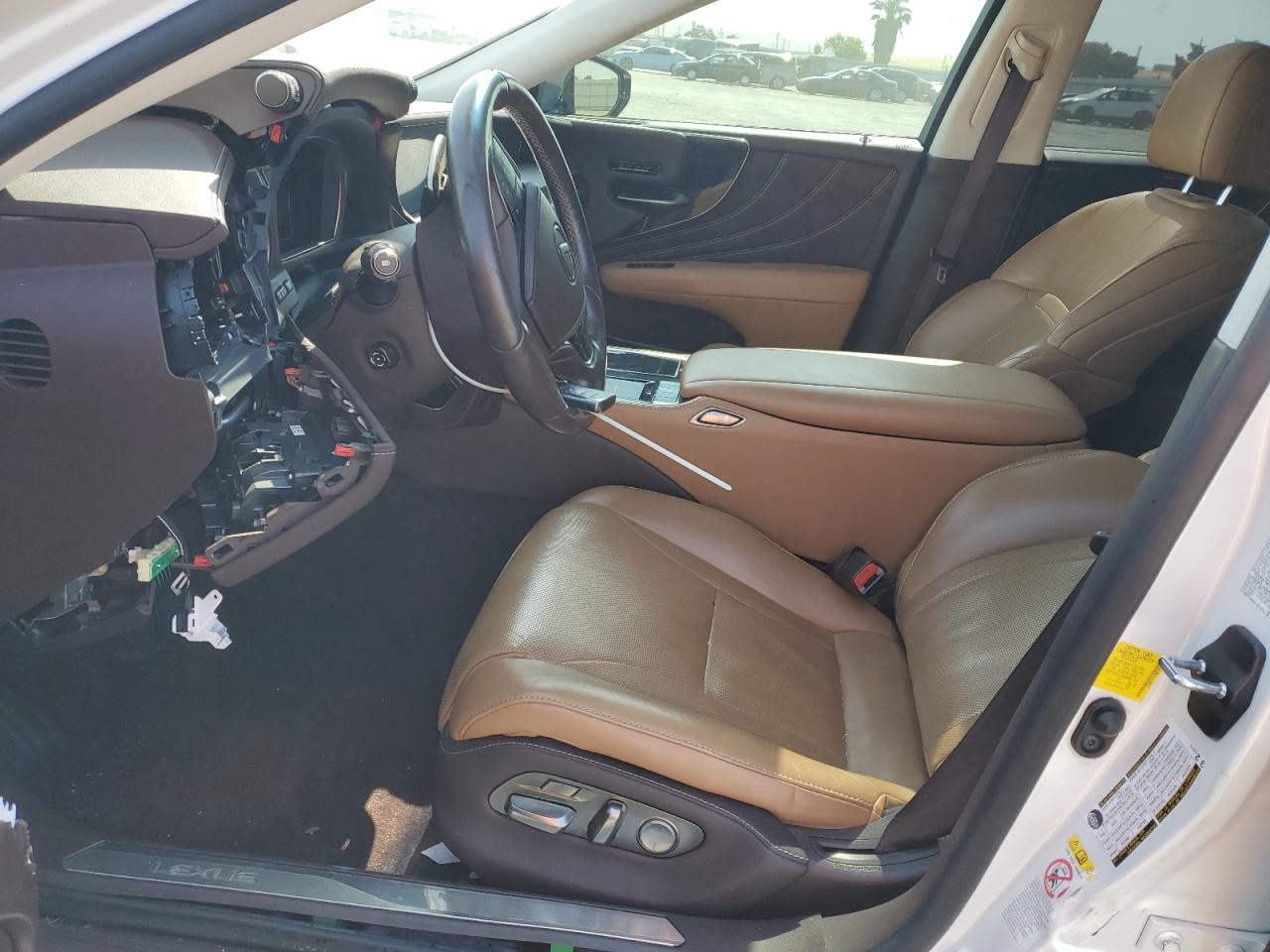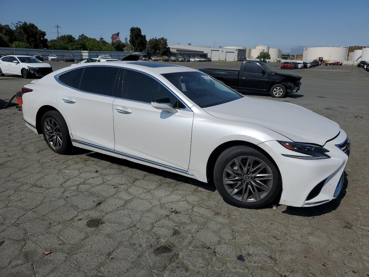 The white Lexus LS 500 has extensive damage across the body, with significant impact on multiple panels. The undercarriage also sustained damage. The interior shows signs of wear but is intact, with no obvious airbag deployment. The car has a Run & Drive Verified start code.