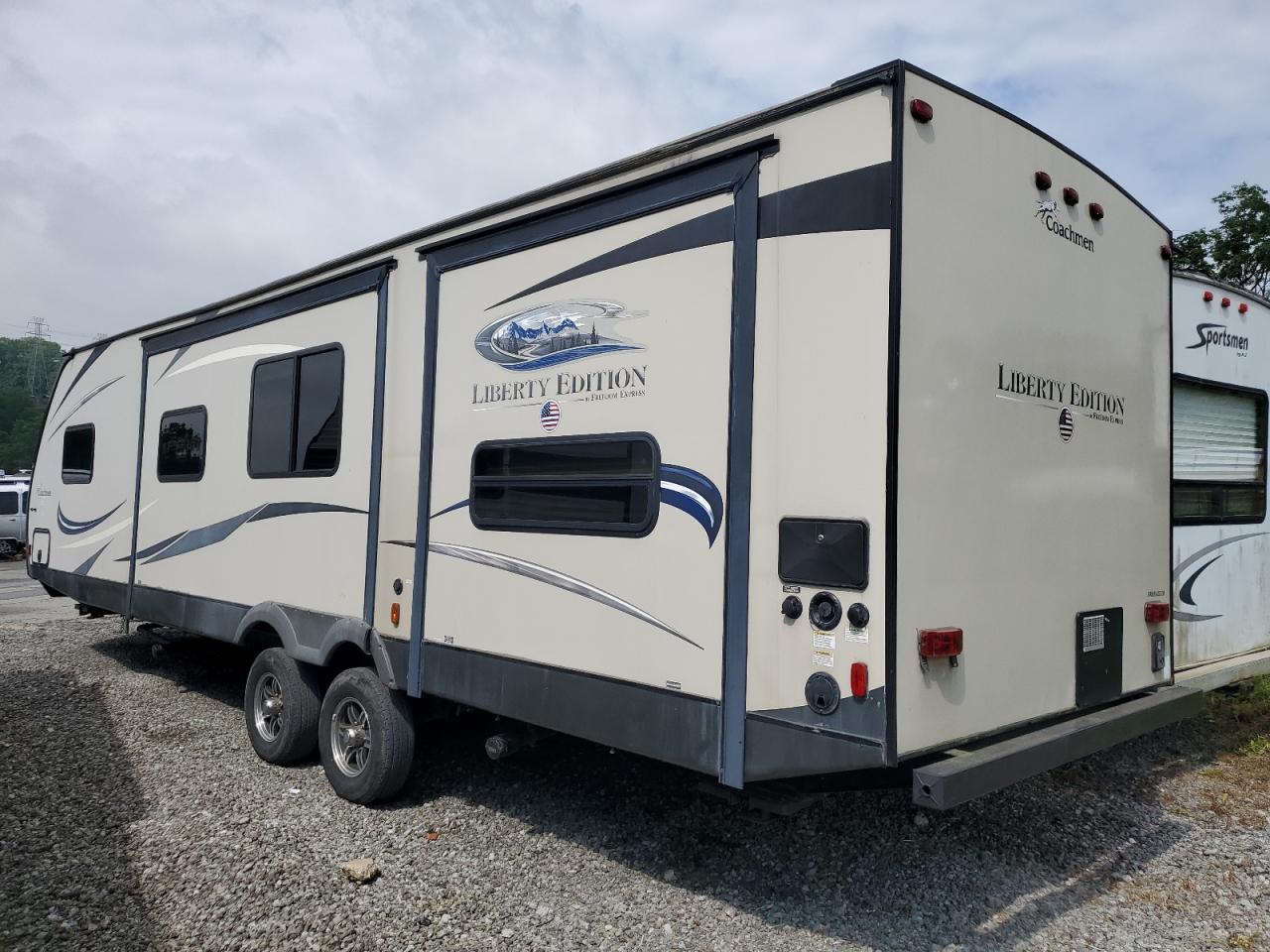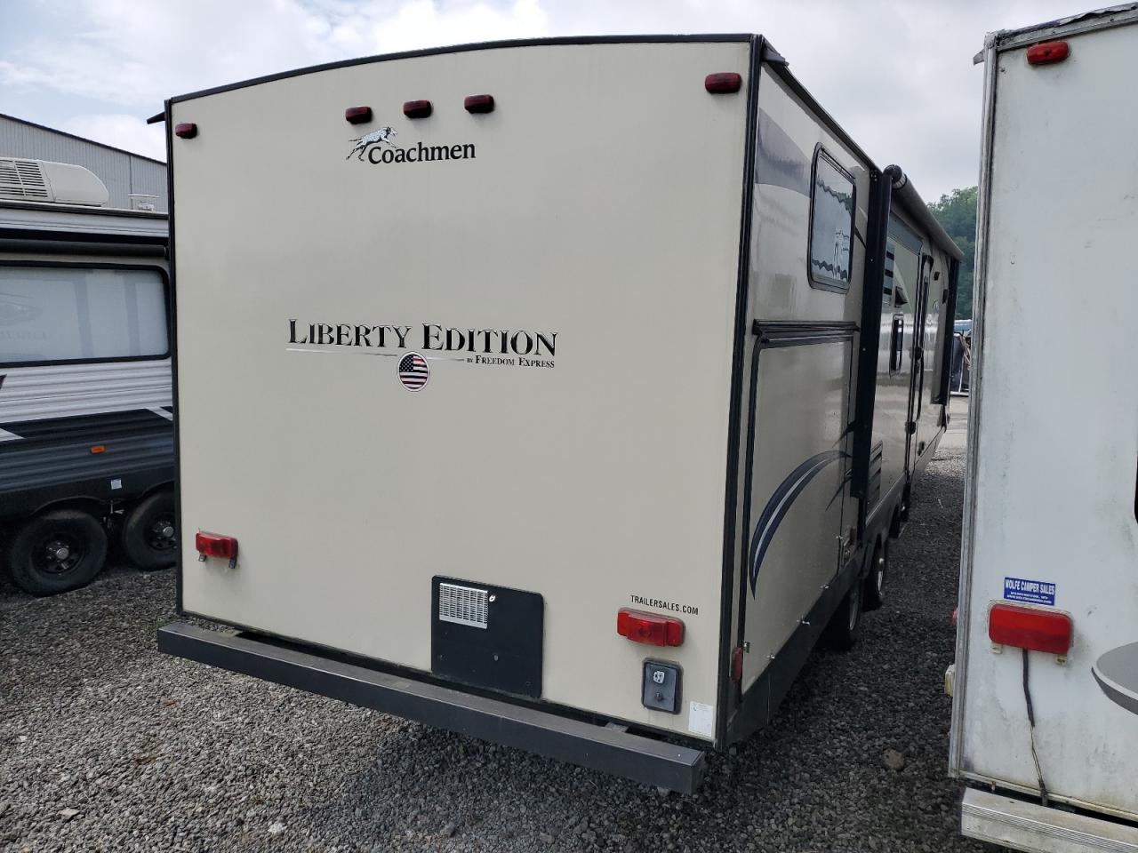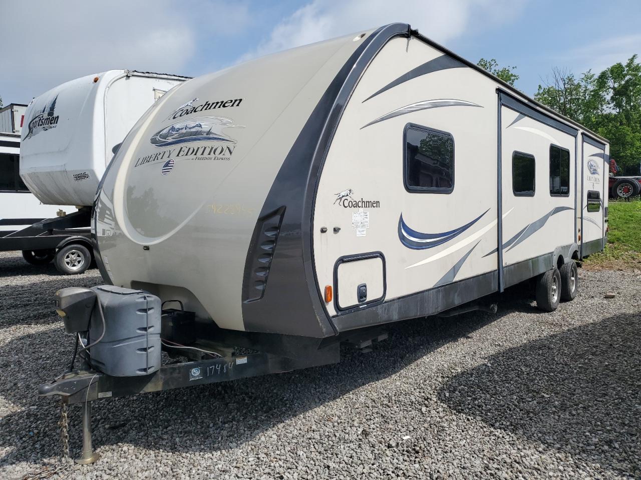 GoodThe RV appears to be a 2015 Coachmen Liberty Edition. The exterior is primarily white with blue and gray accents. There's some wear and tear visible, but the overall condition seems decent. The interior shows signs of use, with some minor damage.