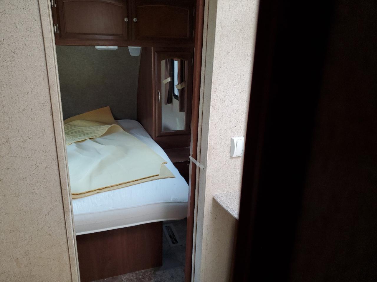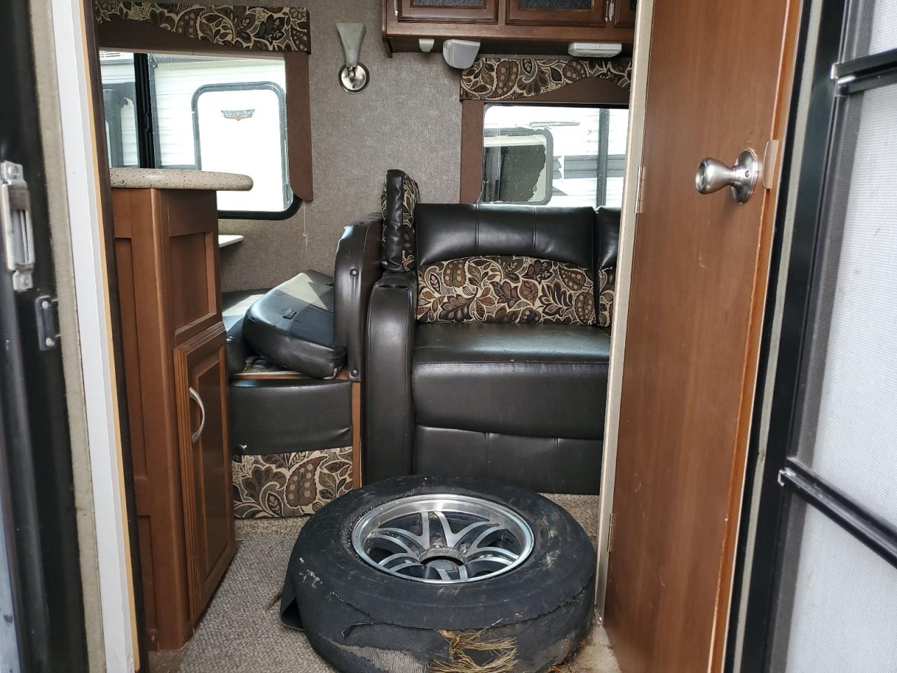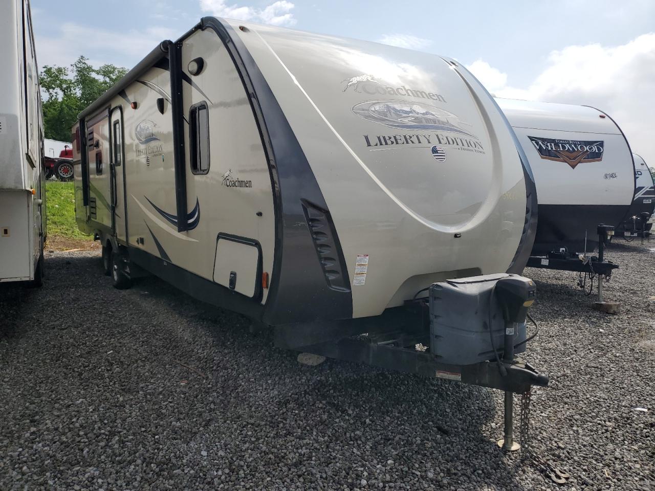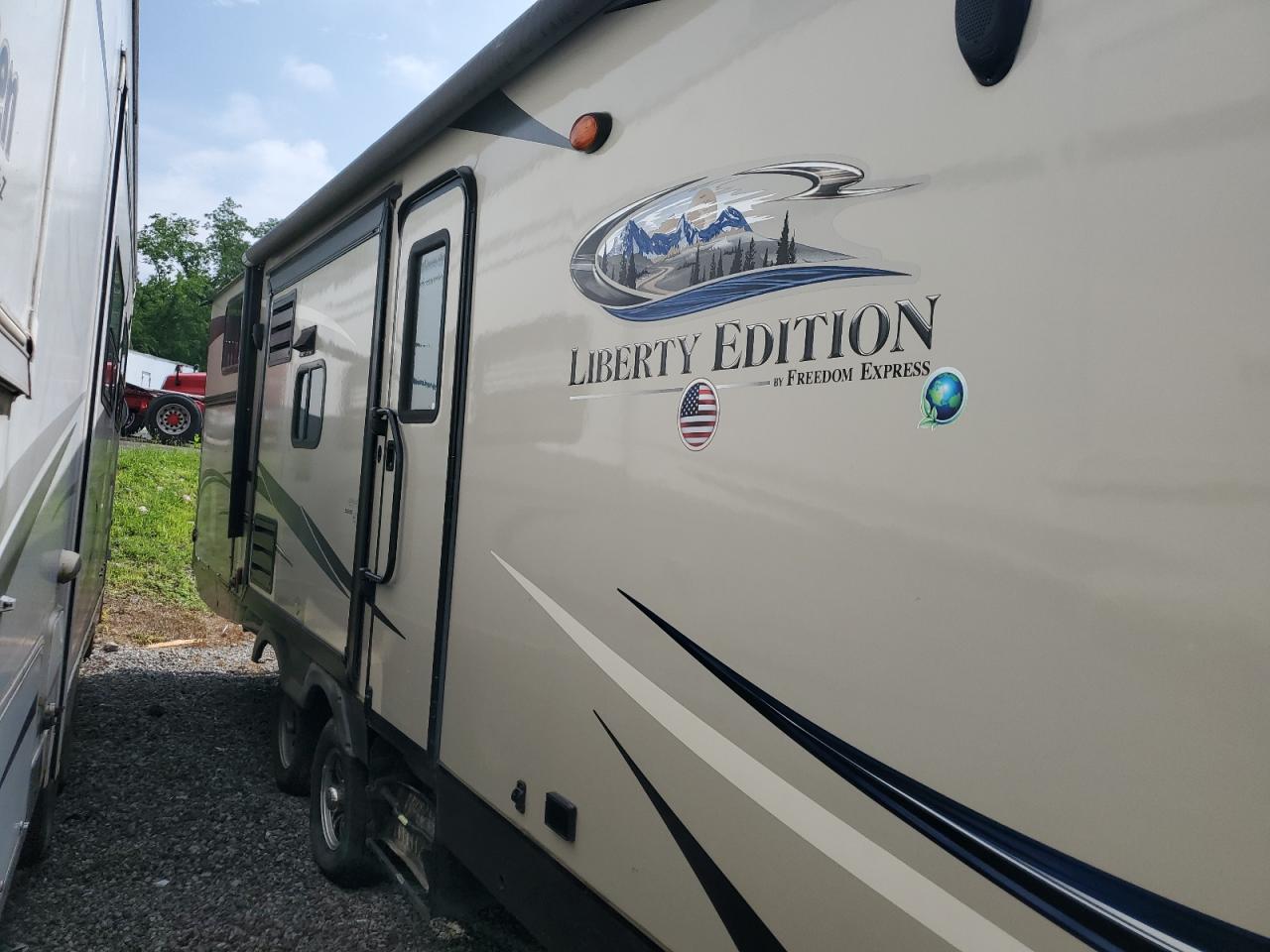GoodThe RV appears to be a 2015 Coachmen Liberty Edition. The exterior is primarily white with blue and gray accents. There's some wear and tear visible, but the overall condition seems decent. The interior shows signs of use, with some minor damage.