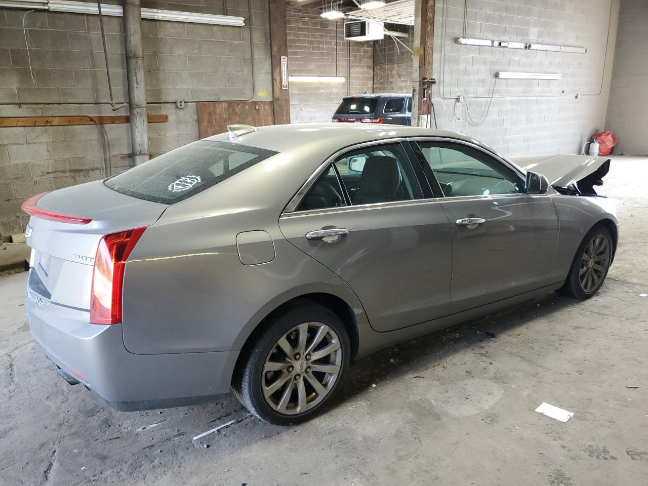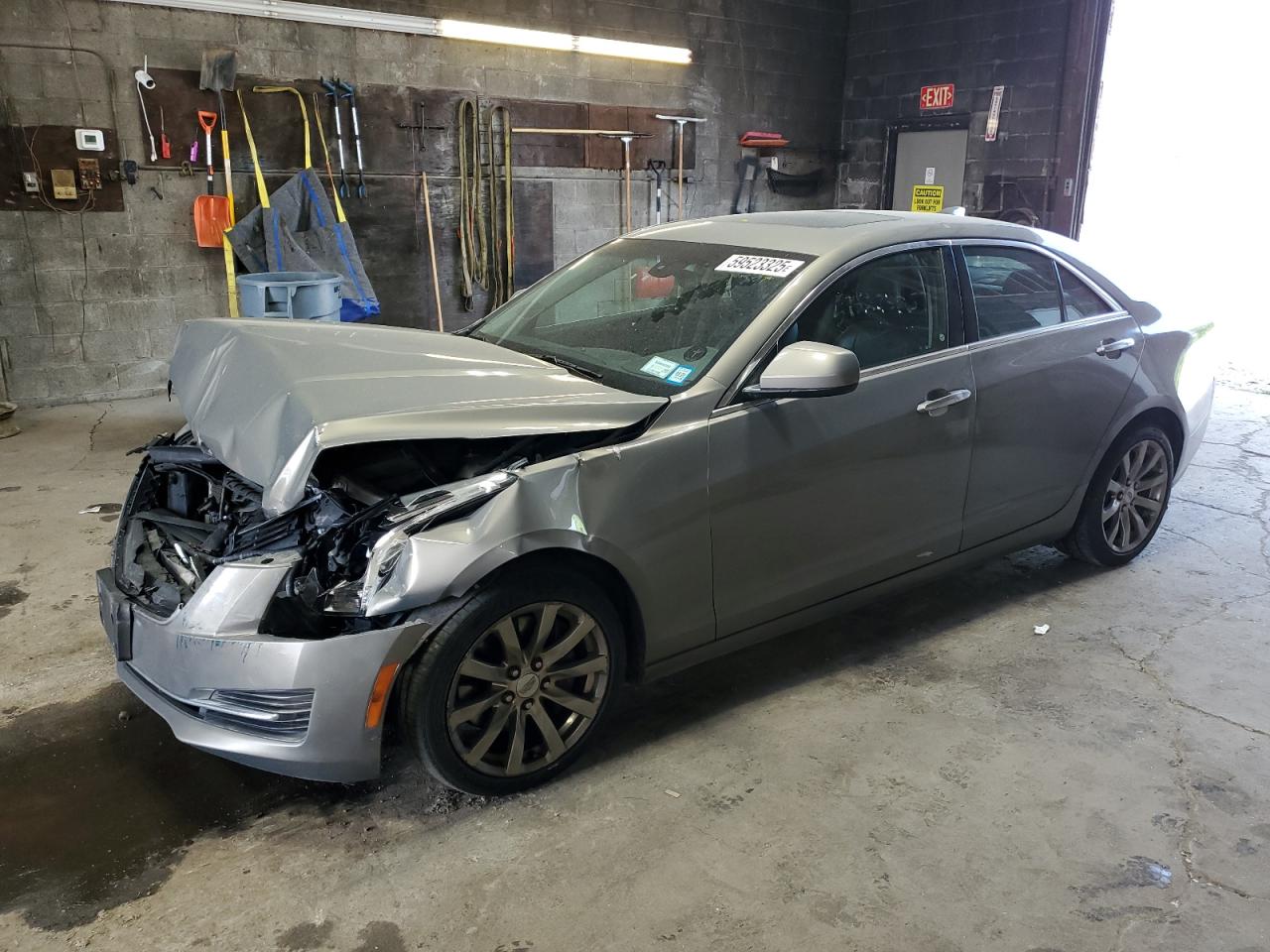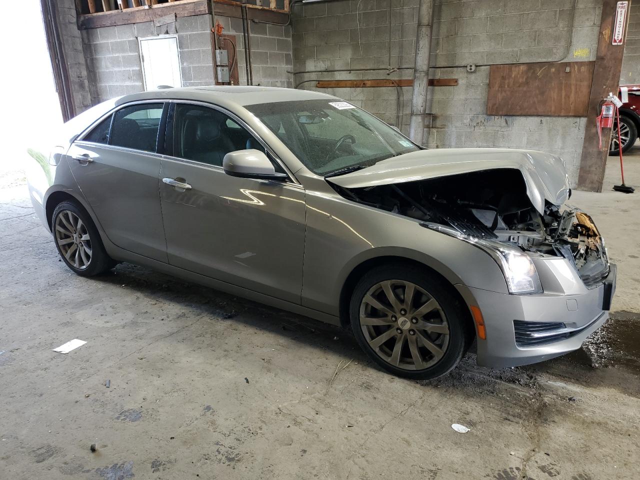 FairThe 2017 Cadillac ATS is presented with significant front-end damage. The primary damage is focused on the front end, with a notable impact to the hood, bumper, and surrounding body panels. The tan-colored exterior shows signs of impact, with deformation visible in multiple views. Wheels appear to be intact, and the vehicle starts. The interior shows moderate wear and tear consistent with its age and mileage. Airbags were not deployed.