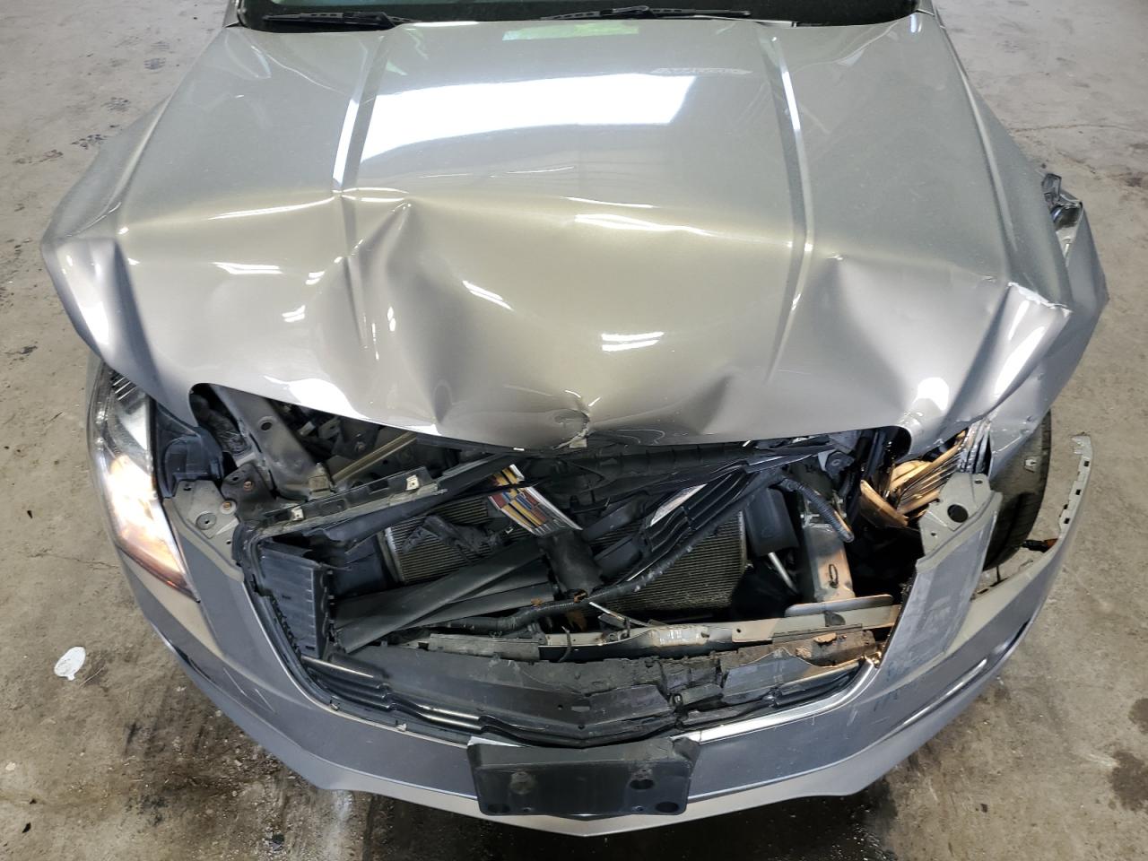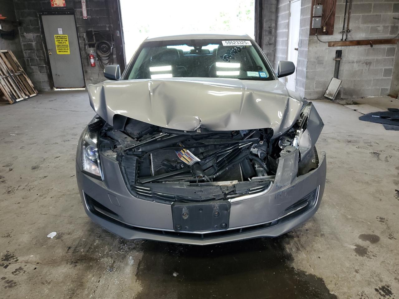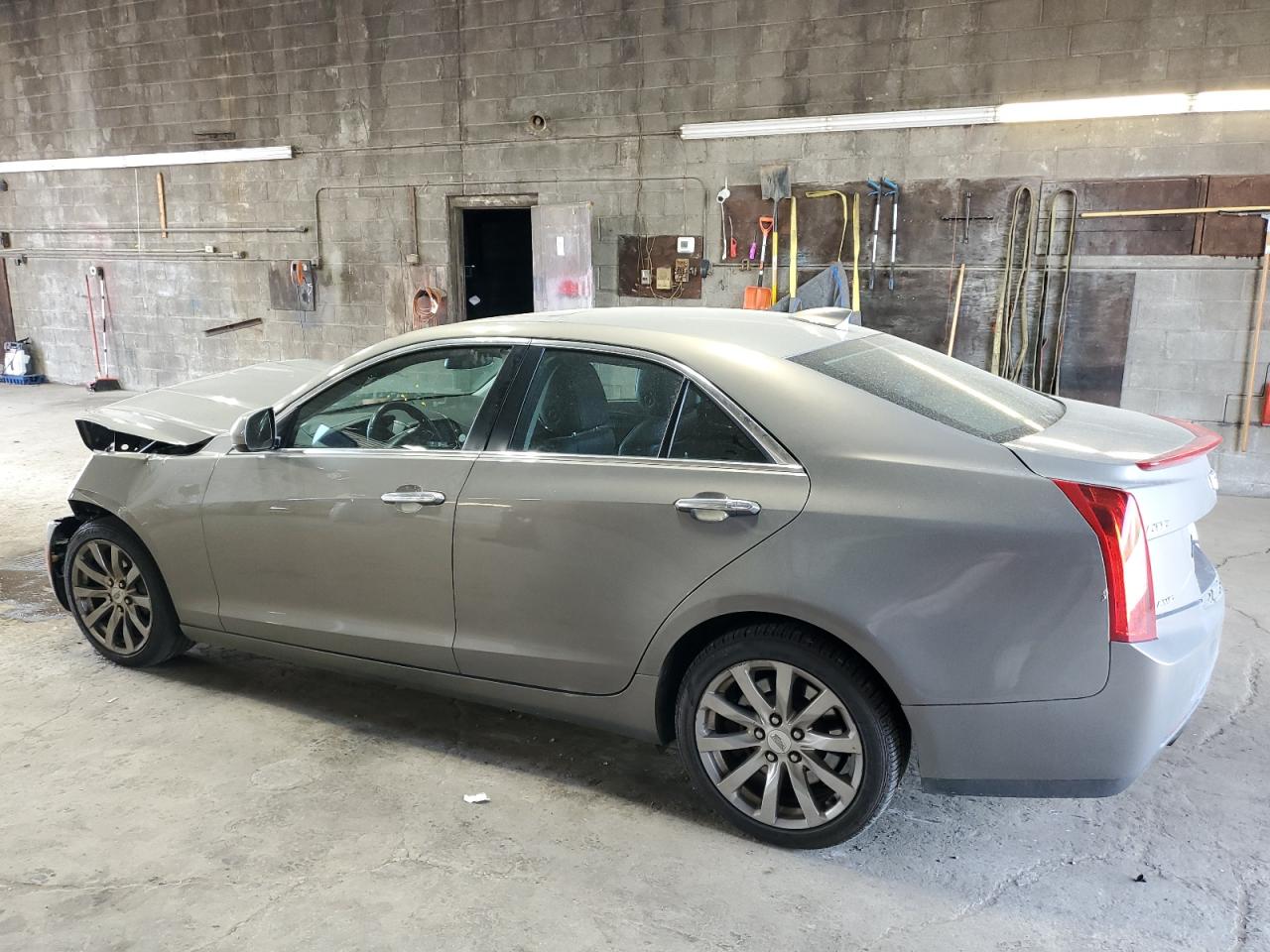 FairThe 2017 Cadillac ATS is presented with significant front-end damage. The primary damage is focused on the front end, with a notable impact to the hood, bumper, and surrounding body panels. The tan-colored exterior shows signs of impact, with deformation visible in multiple views. Wheels appear to be intact, and the vehicle starts. The interior shows moderate wear and tear consistent with its age and mileage. Airbags were not deployed.
