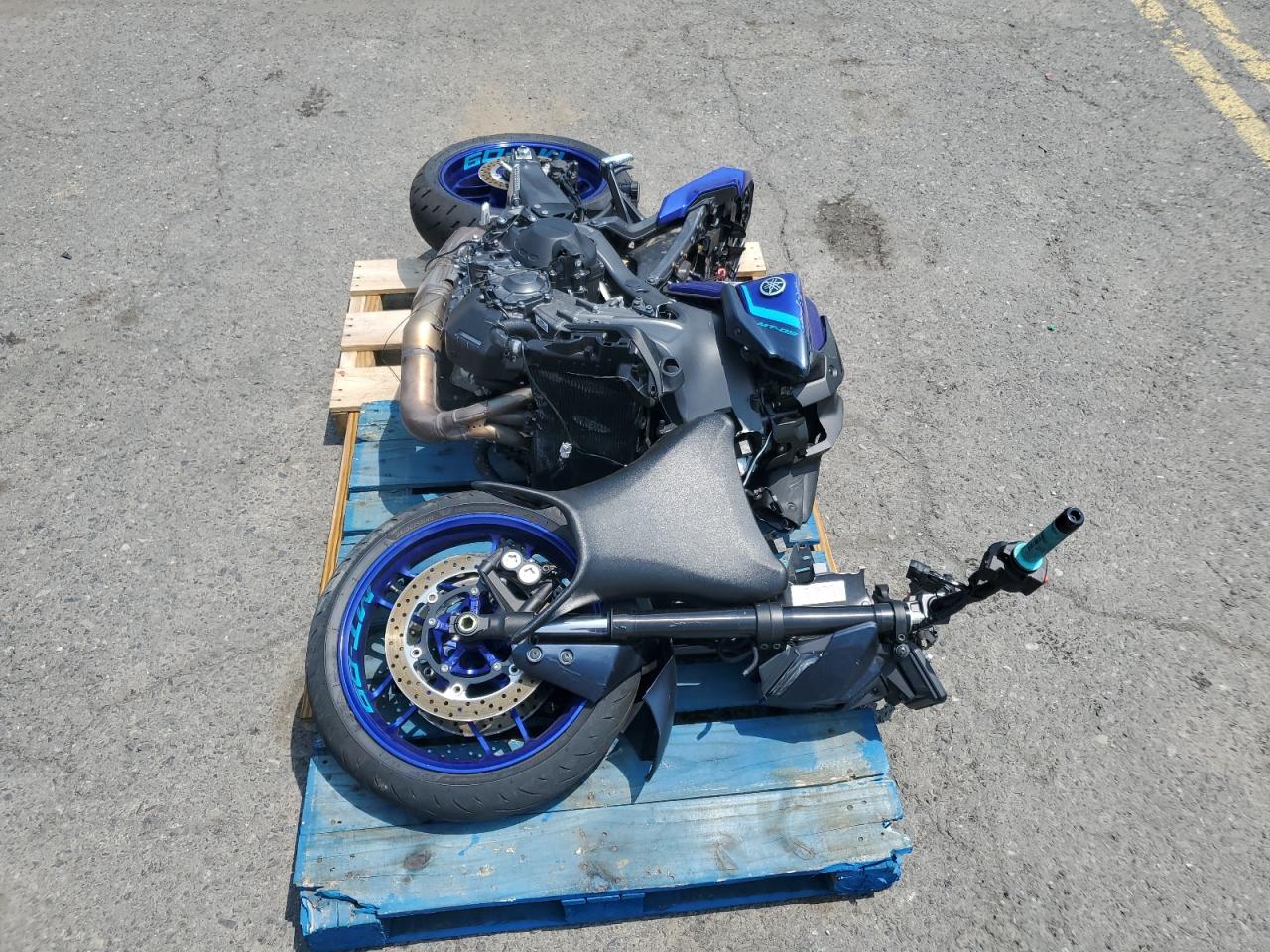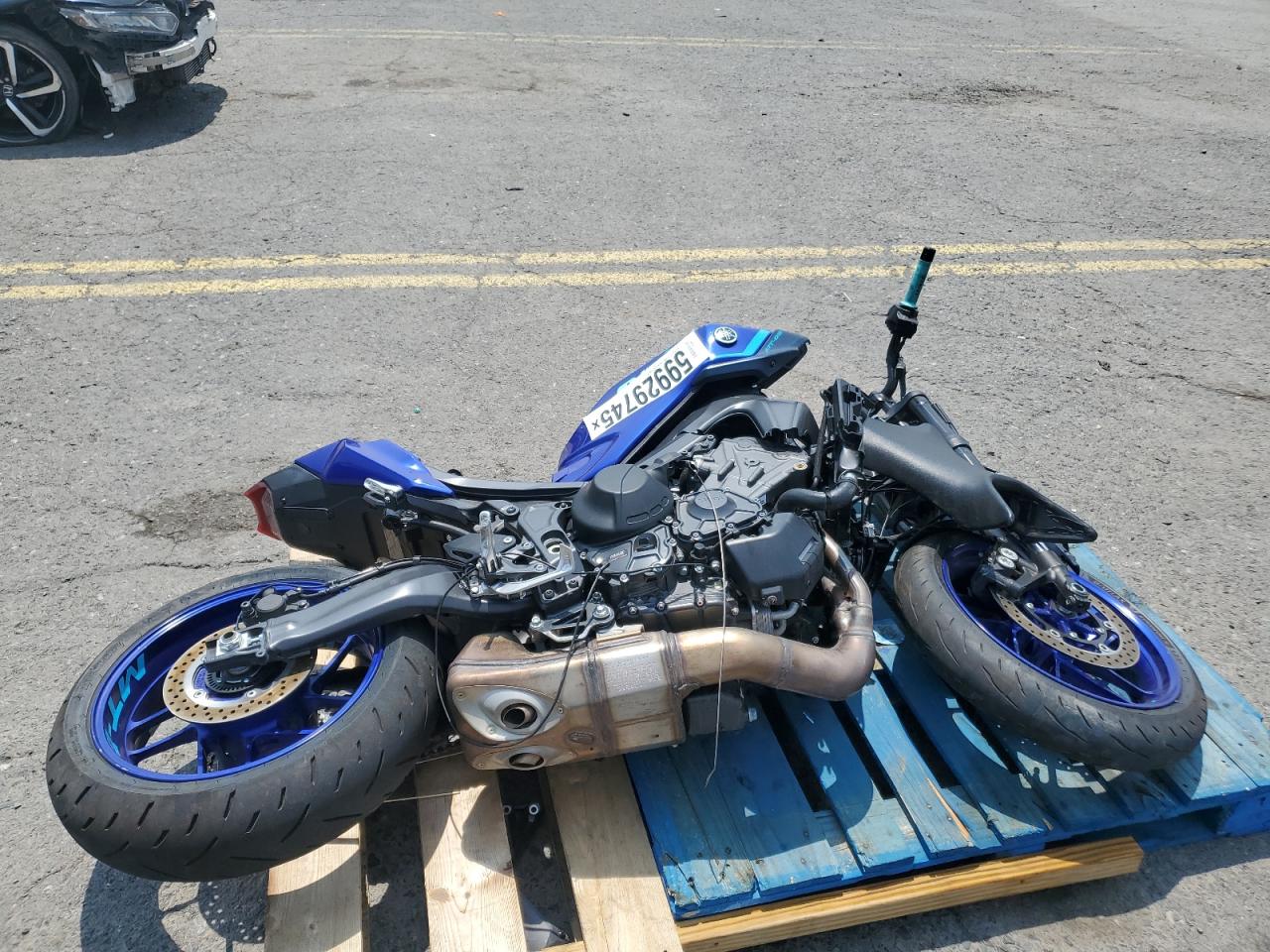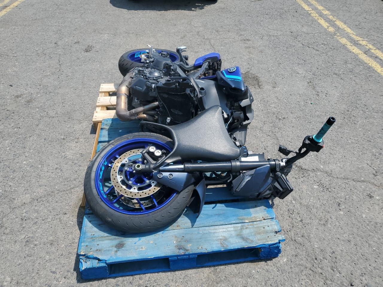 FairThe 2024 Yamaha MT-09 is a blue motorcycle with significant front-end damage. The motorcycle is severely damaged, particularly at the front. The frame is visibly compromised. The front wheel, lights, and windshield are damaged. There is no damage in the interior. Airbags are not visible and condition is unknown. The motorcycle appears to be non-operational.
