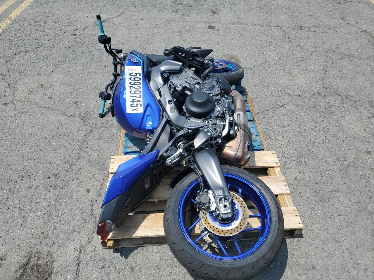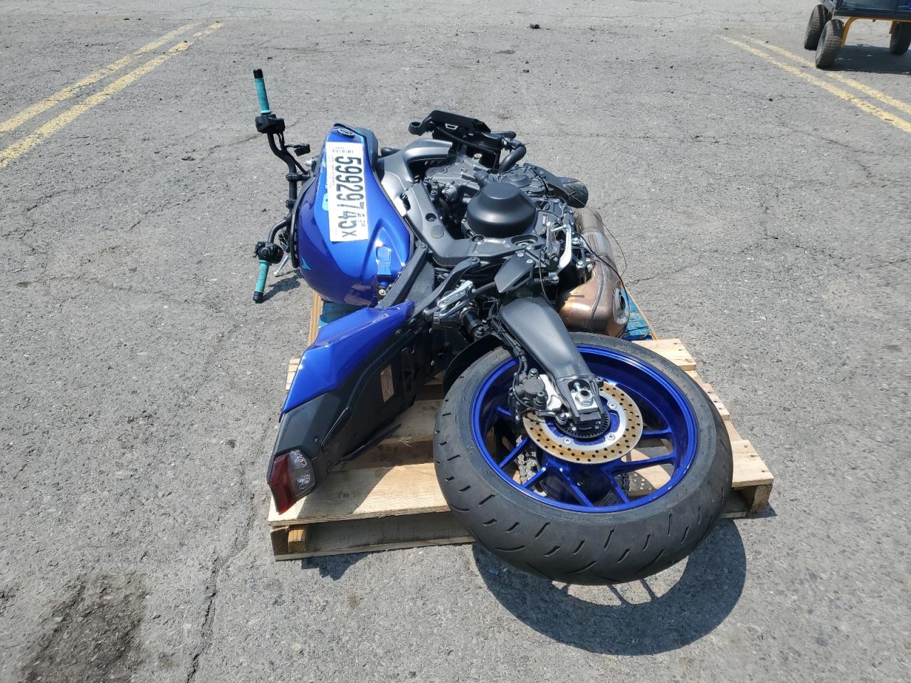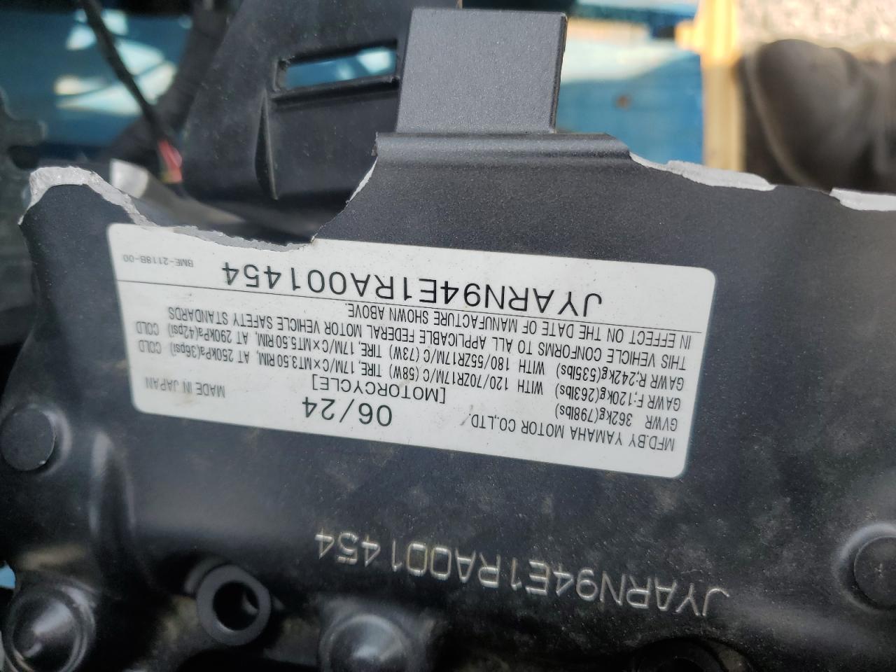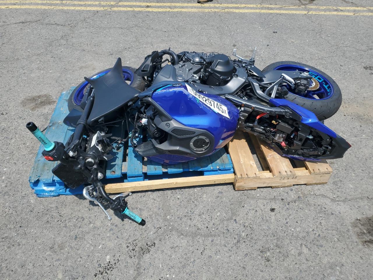 FairThe 2024 Yamaha MT-09 is a blue motorcycle with significant front-end damage. The motorcycle is severely damaged, particularly at the front. The frame is visibly compromised. The front wheel, lights, and windshield are damaged. There is no damage in the interior. Airbags are not visible and condition is unknown. The motorcycle appears to be non-operational.
