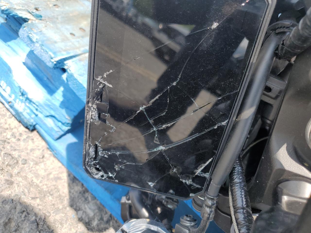 Extensive front-end damage, including frame damage, broken windshield, and possible mechanical issues. The motorcycle is not drivable.