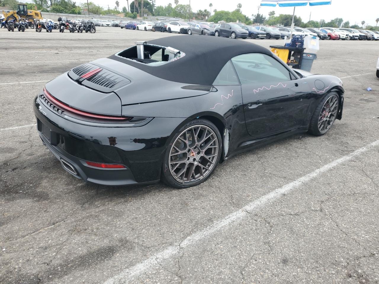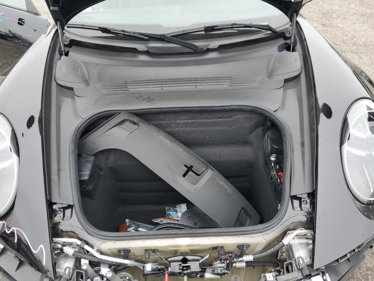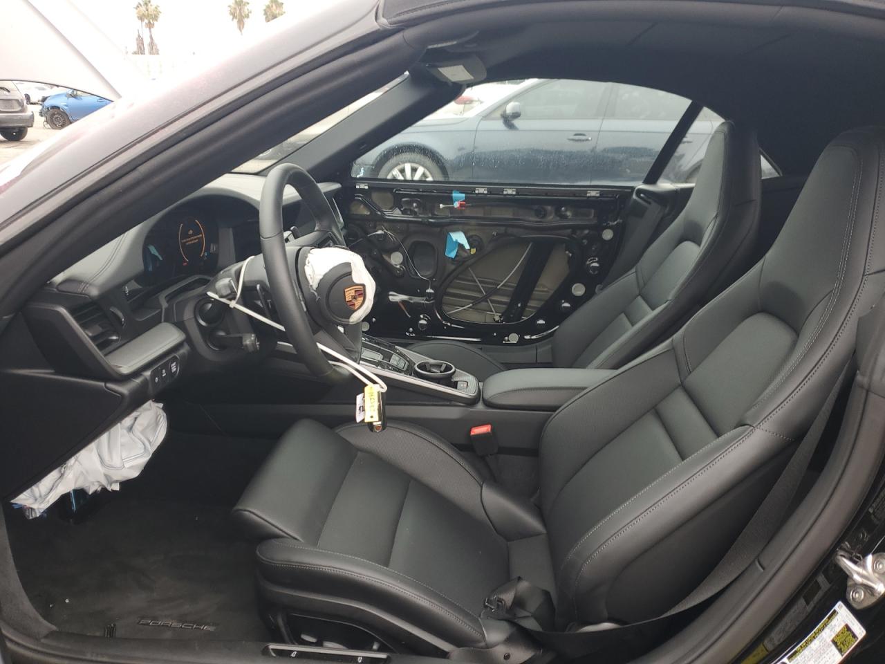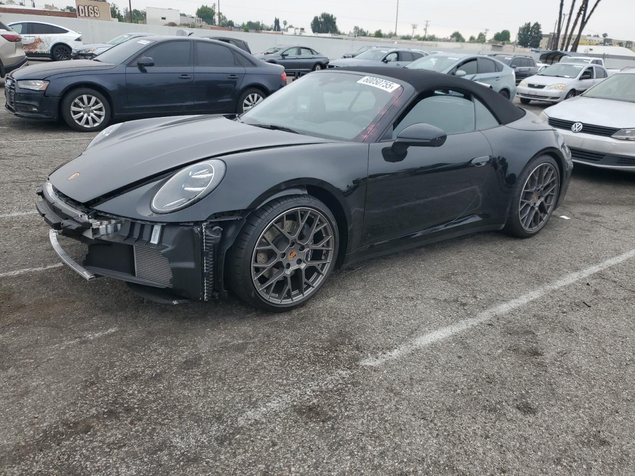 FairThis is a black PORSCHE 911 CARRER 2025. The car has sustained significant damage. The front end has extensive damage, and there's also damage to the side. The convertible top is present, but the vehicle's overall condition is poor. The damage is extensive, likely requiring considerable repair and a parts replacement. Airbags have deployed, and the interior shows signs of damage. The wheels appear to be intact, but the lights and glasses may have damage. The car is not drivable, and the dashboard displays an error message regarding the electrical system.