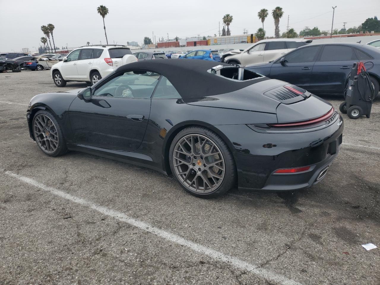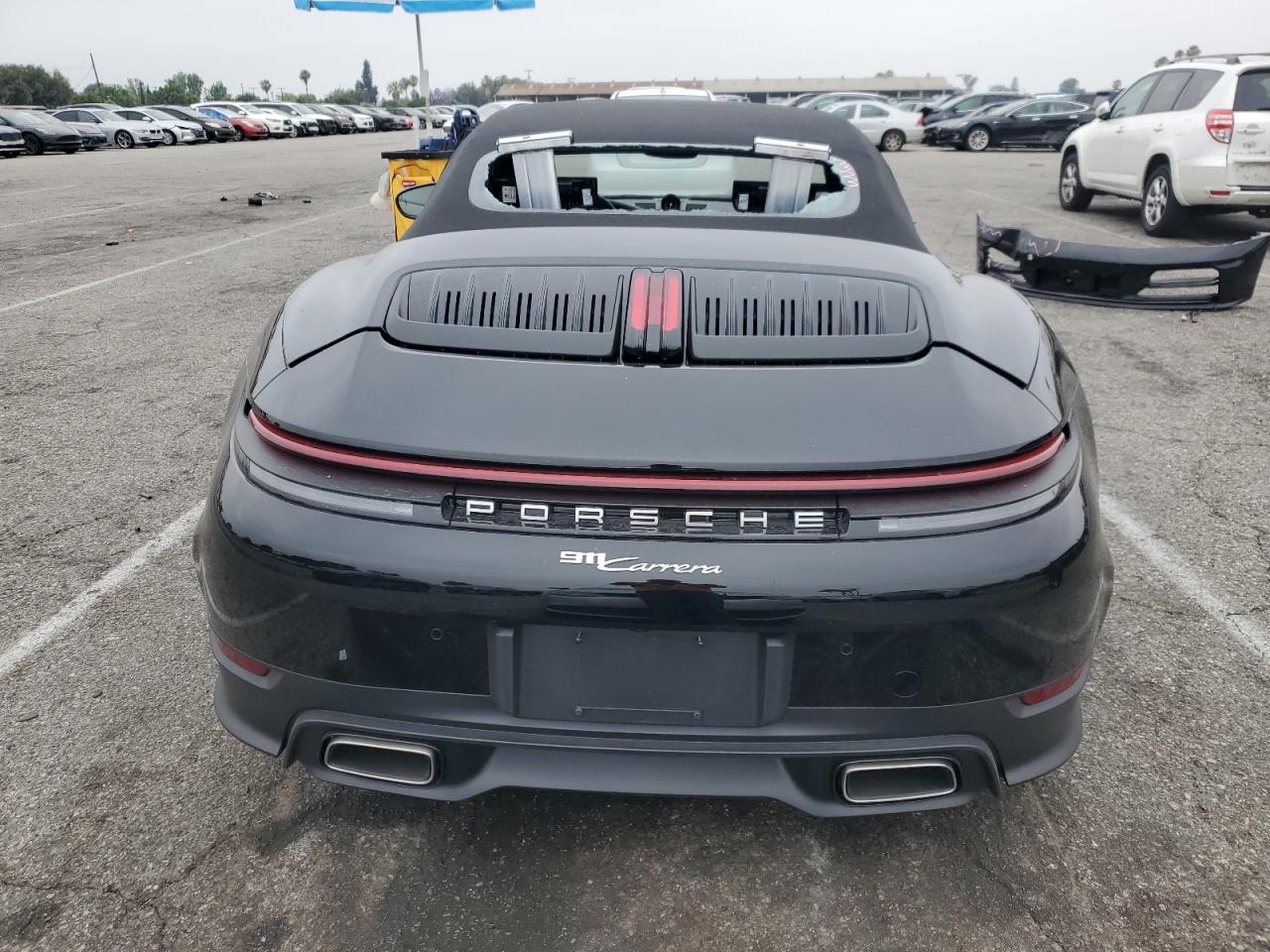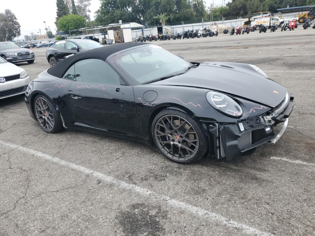 FairThis is a black PORSCHE 911 CARRER 2025. The car has sustained significant damage. The front end has extensive damage, and there's also damage to the side. The convertible top is present, but the vehicle's overall condition is poor. The damage is extensive, likely requiring considerable repair and a parts replacement. Airbags have deployed, and the interior shows signs of damage. The wheels appear to be intact, but the lights and glasses may have damage. The car is not drivable, and the dashboard displays an error message regarding the electrical system.