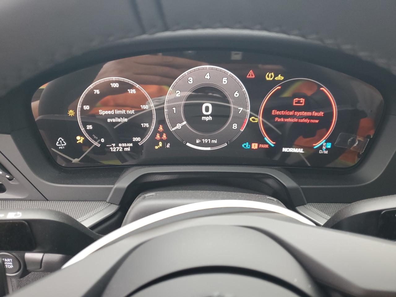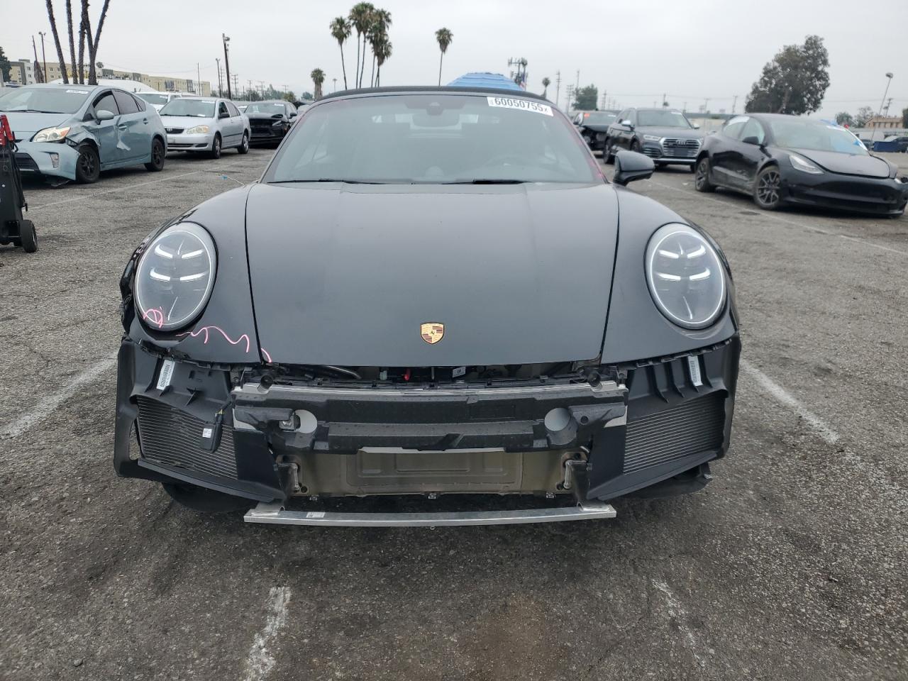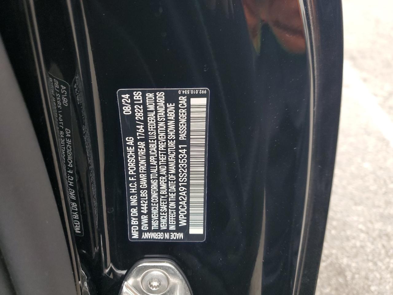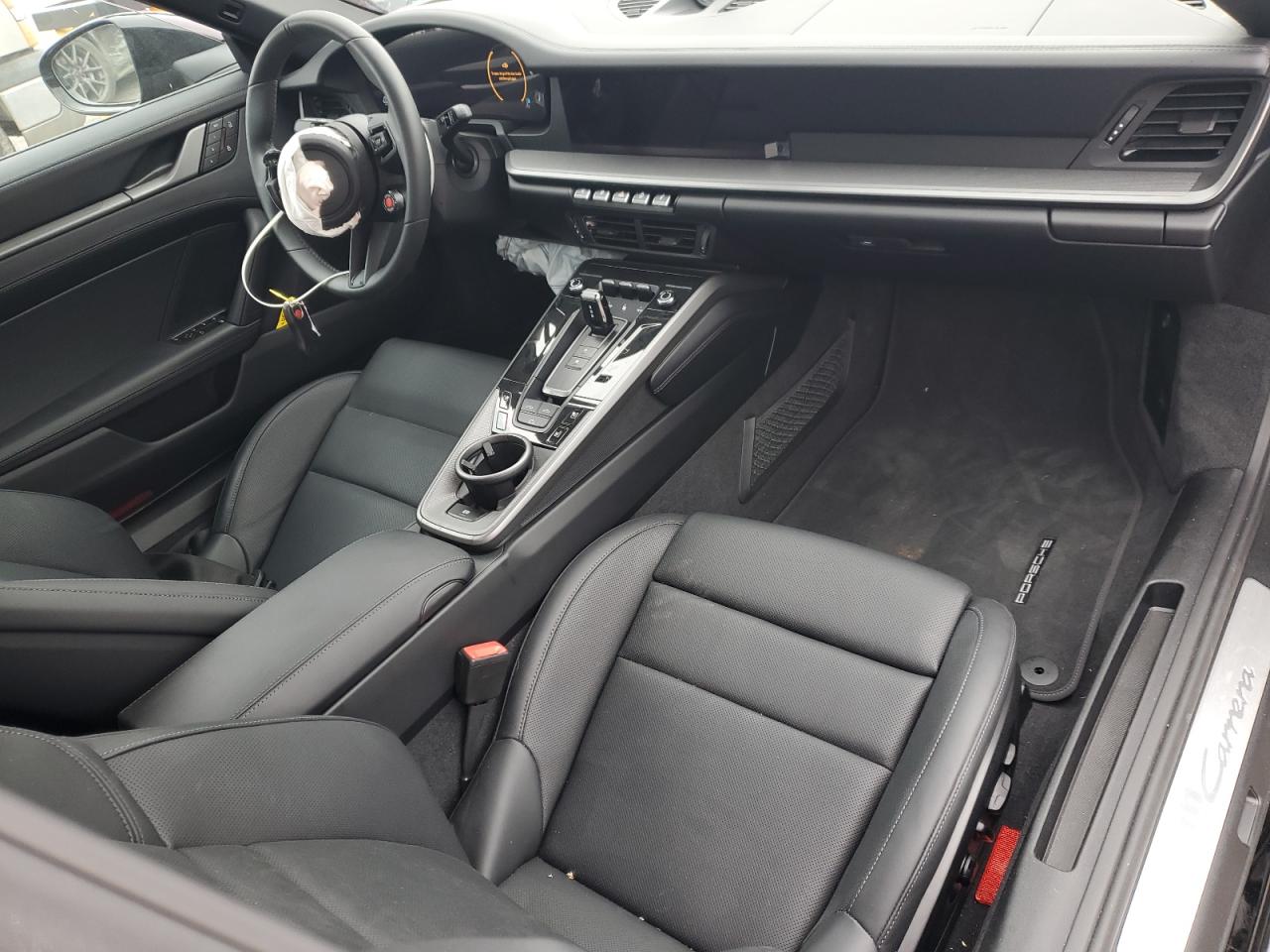 FairThis is a black PORSCHE 911 CARRER 2025. The car has sustained significant damage. The front end has extensive damage, and there's also damage to the side. The convertible top is present, but the vehicle's overall condition is poor. The damage is extensive, likely requiring considerable repair and a parts replacement. Airbags have deployed, and the interior shows signs of damage. The wheels appear to be intact, but the lights and glasses may have damage. The car is not drivable, and the dashboard displays an error message regarding the electrical system.
