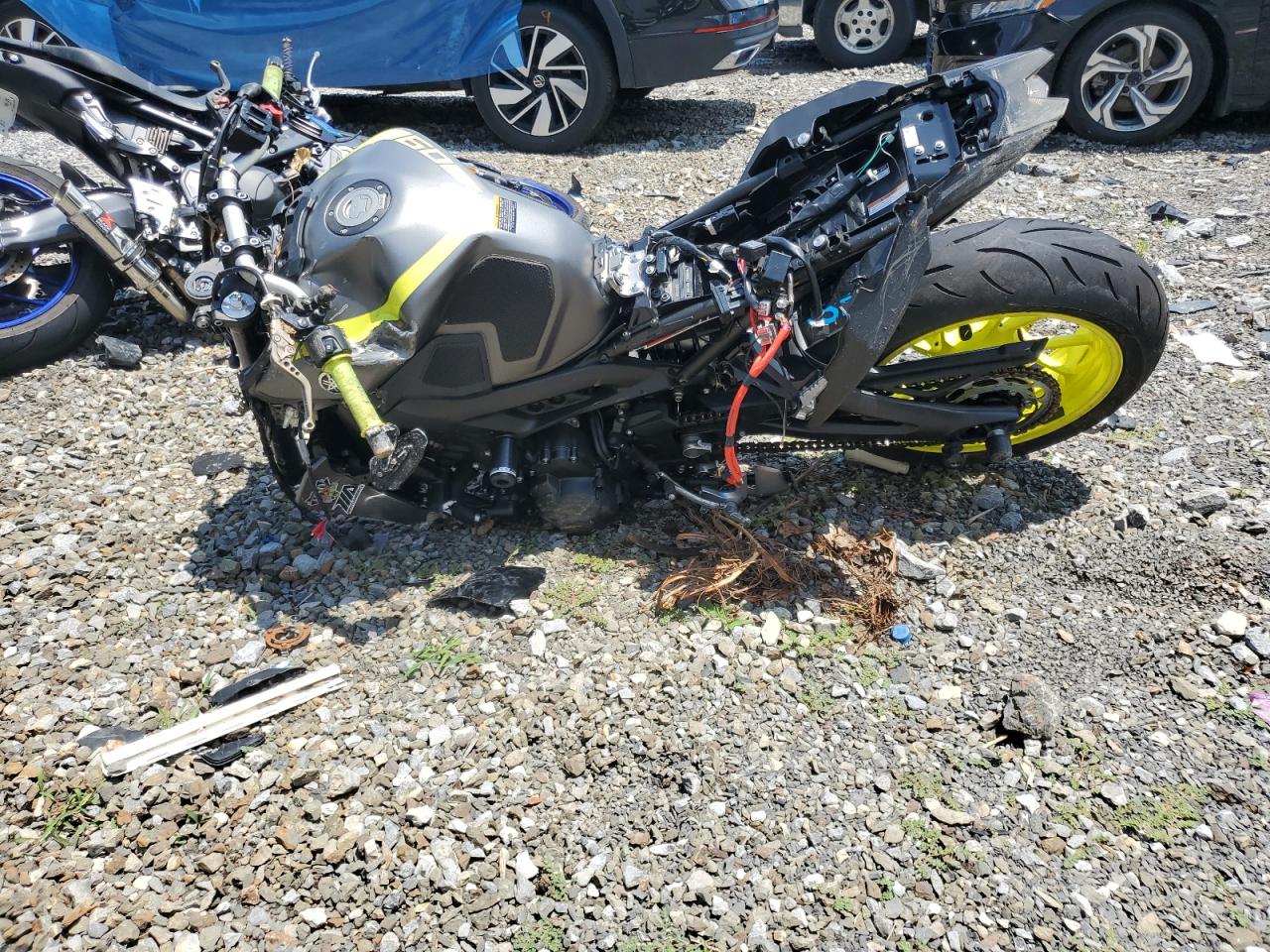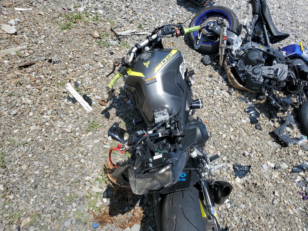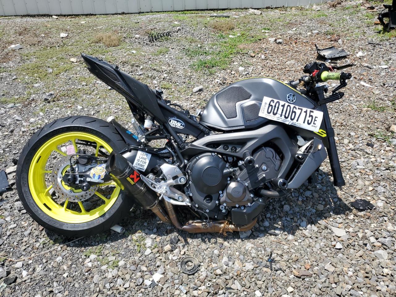 PoorThe Yamaha MT-09 2018 is heavily damaged, with significant front-end and side damage. The two-tone color scheme is apparent, but obscured by the extent of the damage. The front end is severely compromised. The wheels appear damaged. The lights are likely broken. The frame might be bent, and extensive body panel damage is evident. The vehicle is likely not drivable in its current state and would require substantial repairs. Summary: Yamaha MT-09 2018 severely damaged. Keywords: Damaged motorcycle, crashed MT-09, salvage motorcycle, broken Yamaha, scrap MT-09, wrecked motorcycle, damaged front end, side damage, non-drivable.