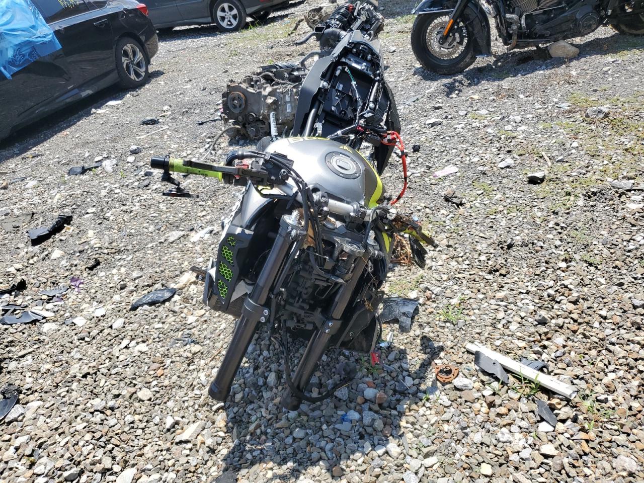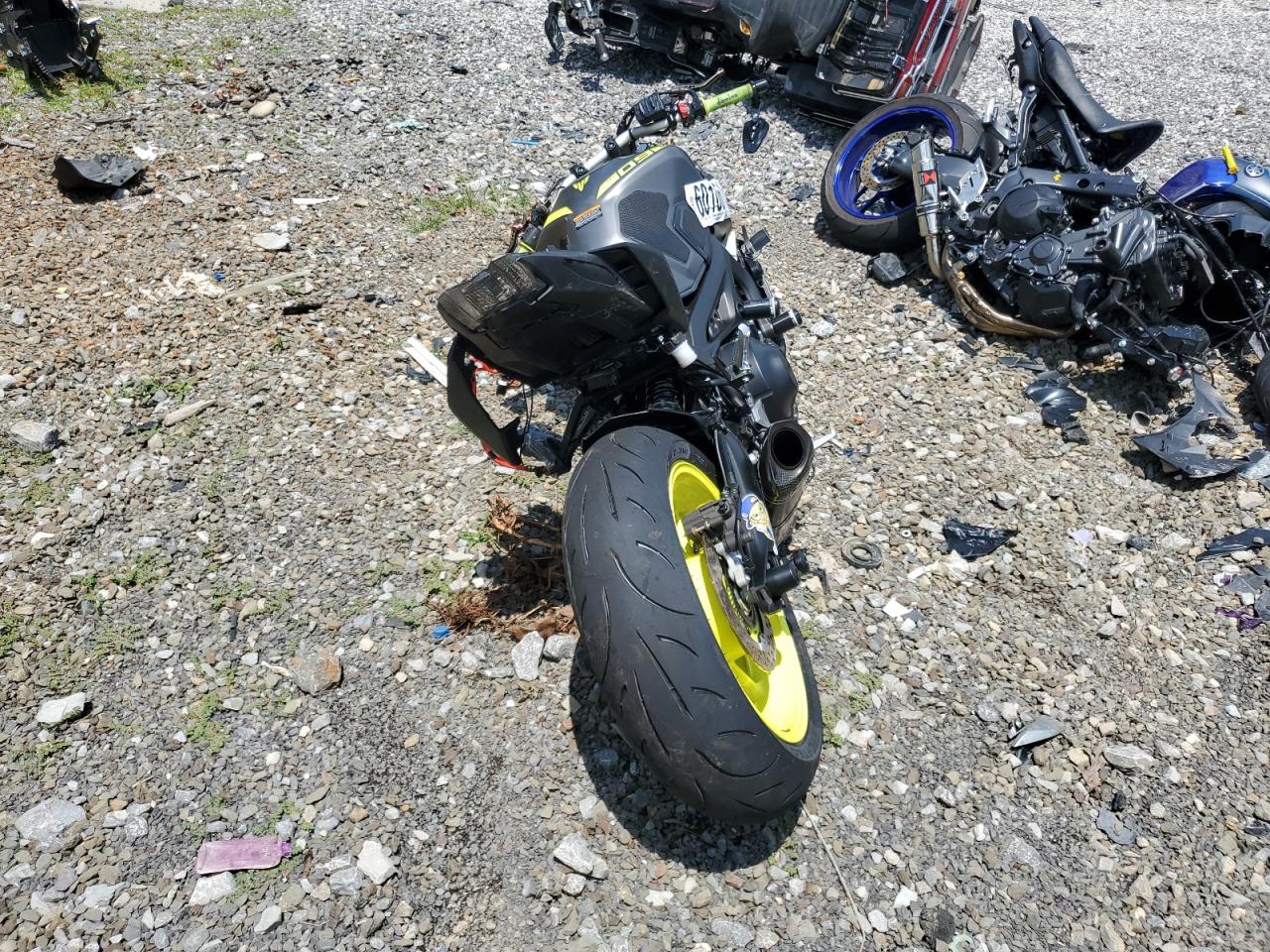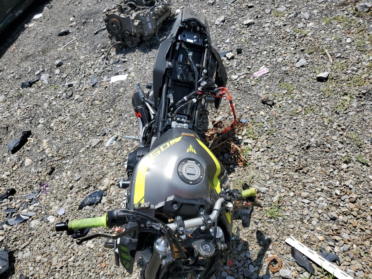 PoorThe Yamaha MT-09 2018 is heavily damaged, with significant front-end and side damage. The two-tone color scheme is apparent, but obscured by the extent of the damage. The front end is severely compromised. The wheels appear damaged. The lights are likely broken. The frame might be bent, and extensive body panel damage is evident. The vehicle is likely not drivable in its current state and would require substantial repairs. Summary: Yamaha MT-09 2018 severely damaged. Keywords: Damaged motorcycle, crashed MT-09, salvage motorcycle, broken Yamaha, scrap MT-09, wrecked motorcycle, damaged front end, side damage, non-drivable.