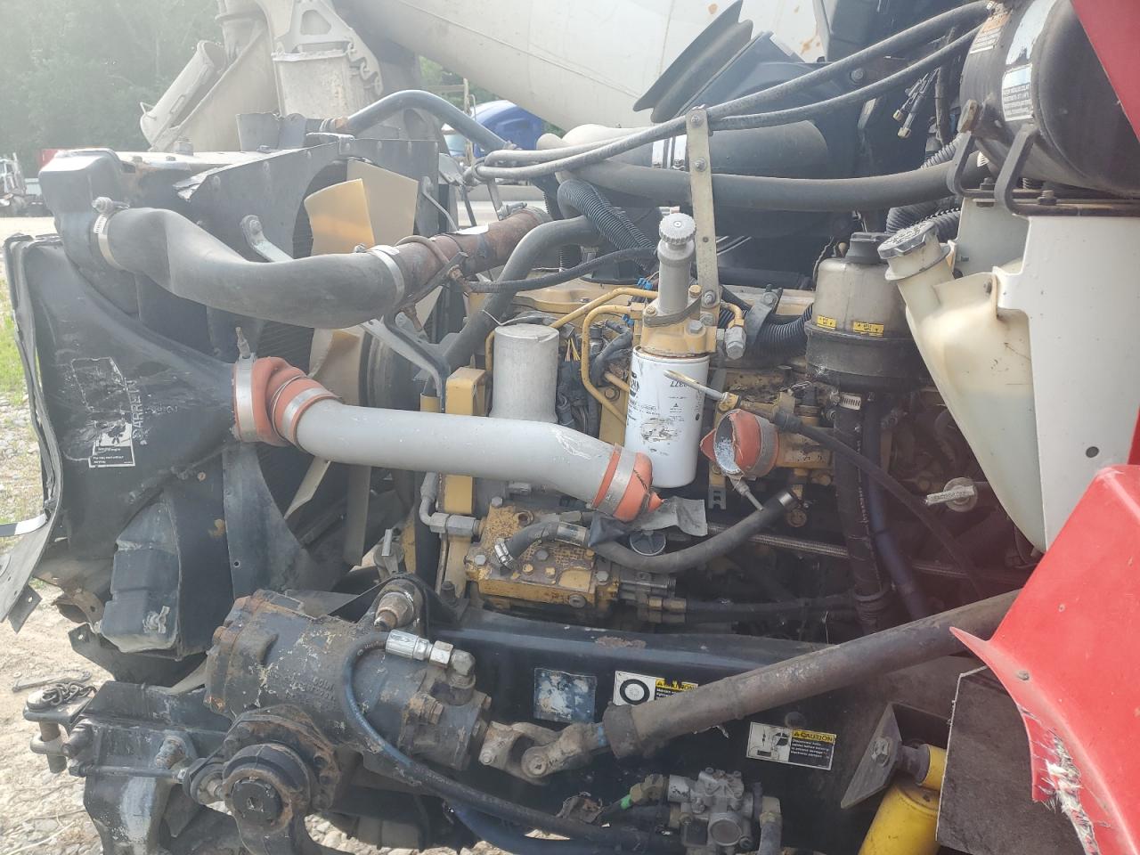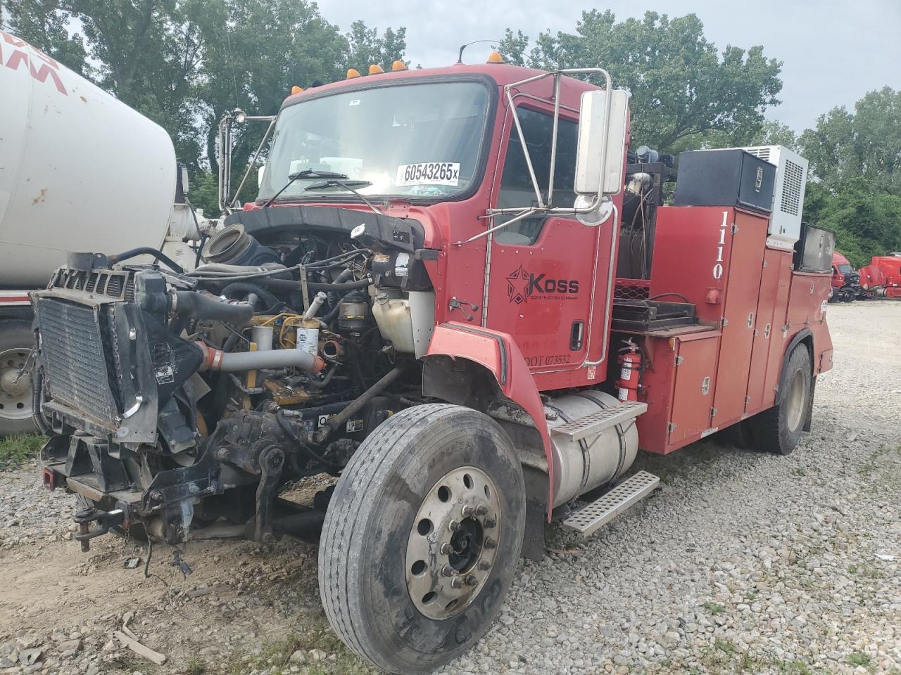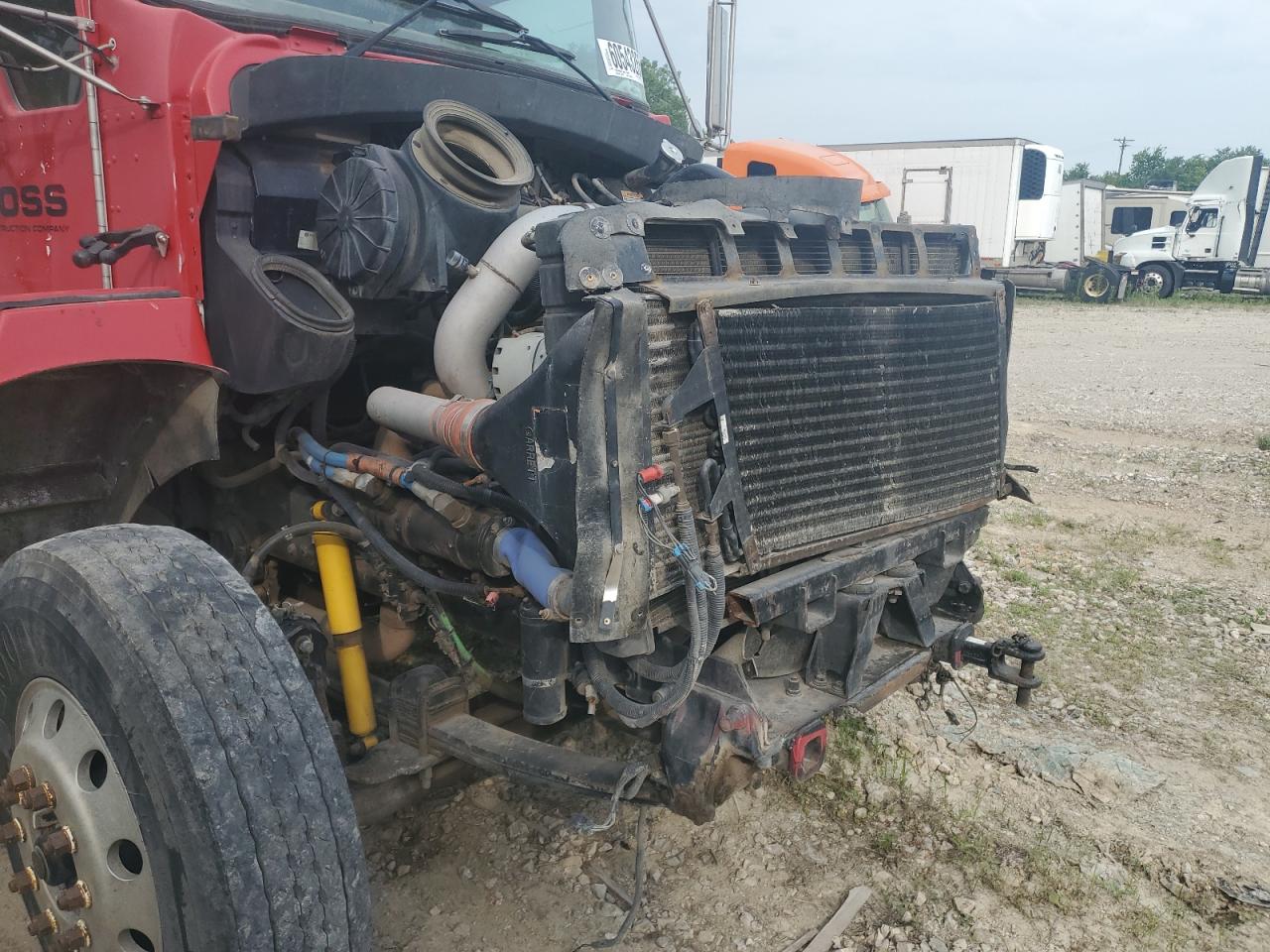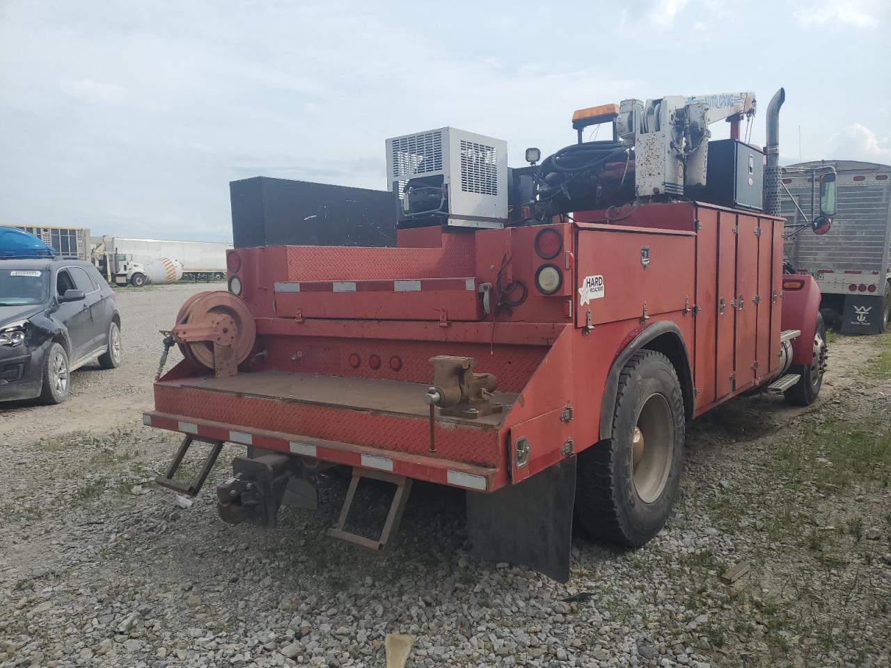The 2003 KENWORTH T300, a robust red tow truck, exhibits significant front-end damage, impacting the body and mechanical components. The interior shows signs of wear, and its overall state is indicative of substantial repair needs. The vehicle's wheels appear to be intact despite the damage.