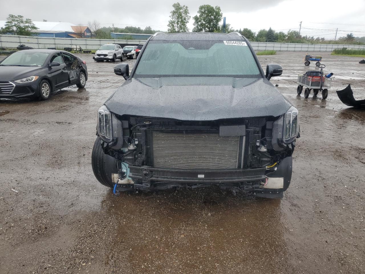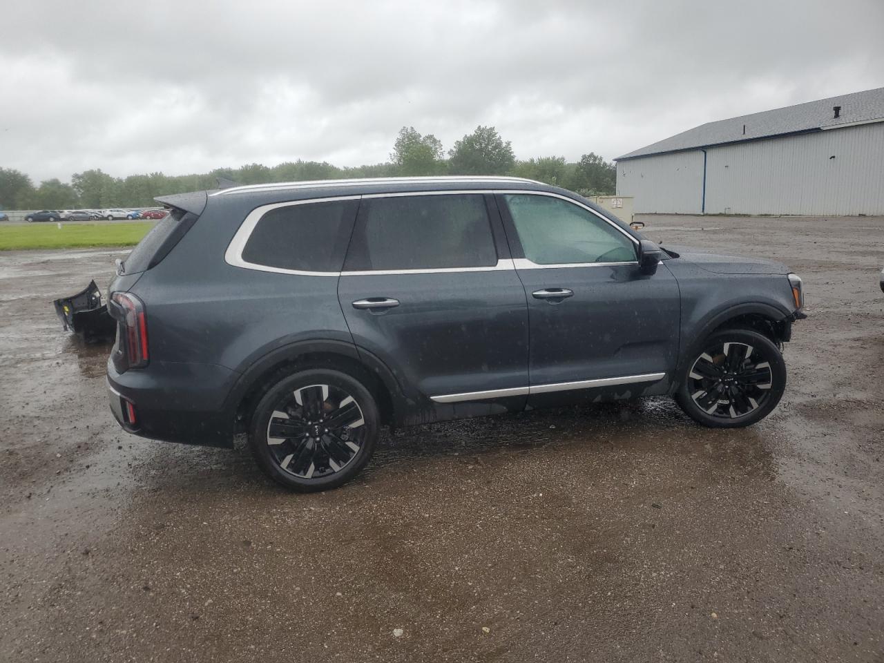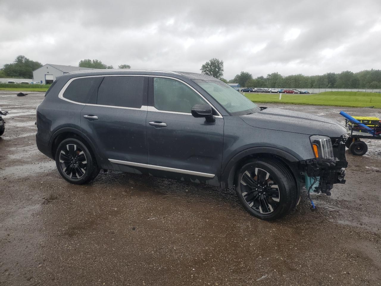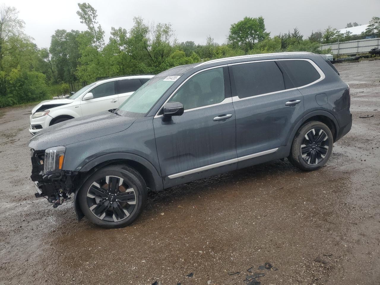 Front-end damage to a blue 2023 KIA TELLURIDE. The vehicle is drivable but needs repairs. Body damage is present, but no mechanical or secondary damage. The interior shows some wear. Overall exterior condition: Fair.