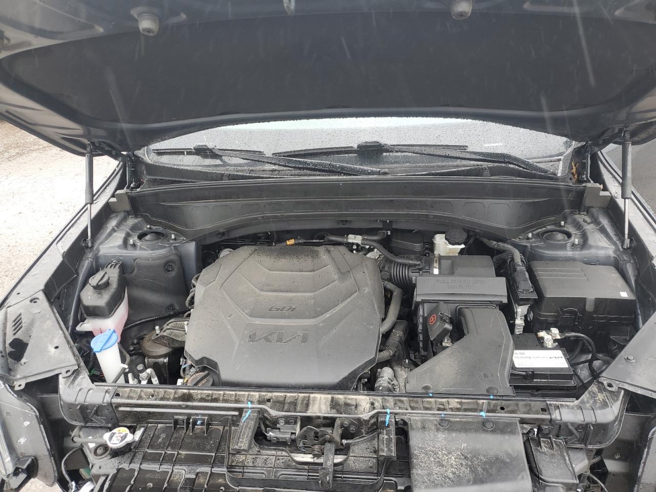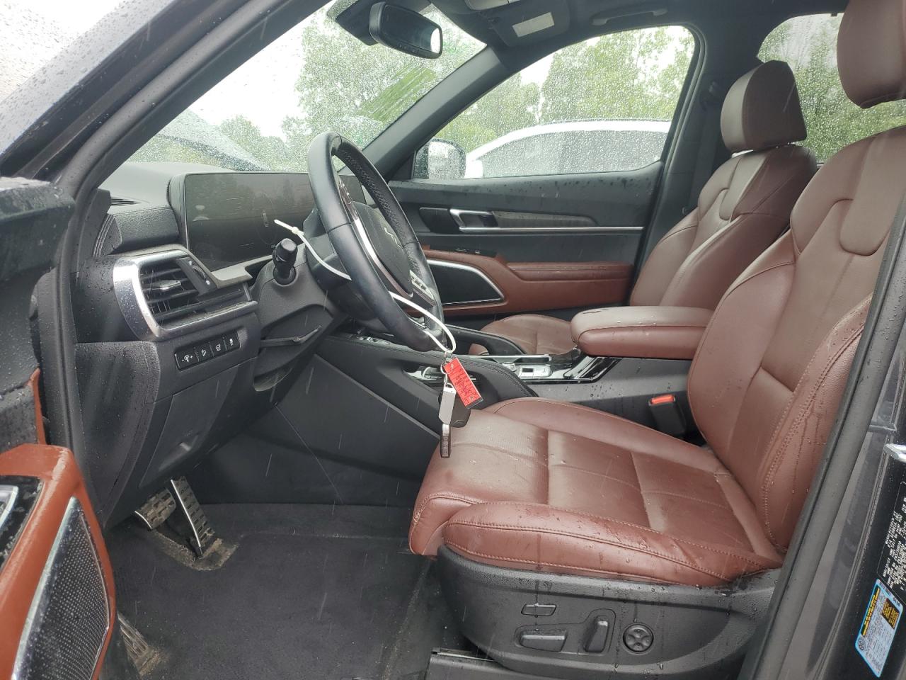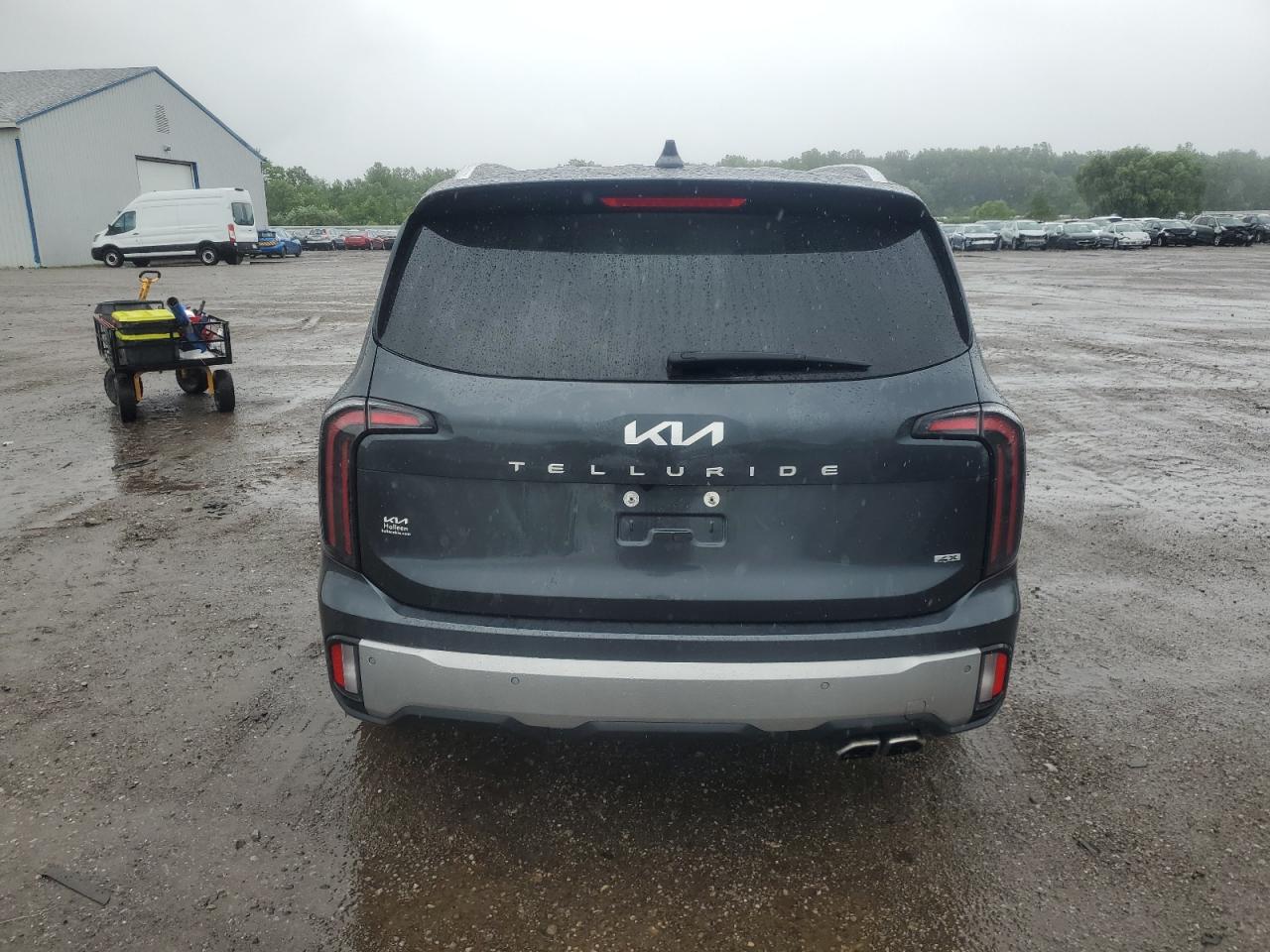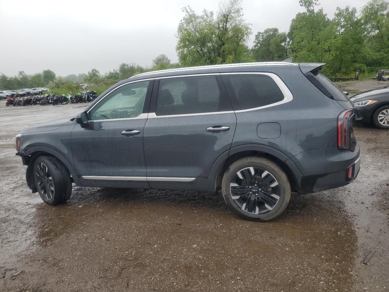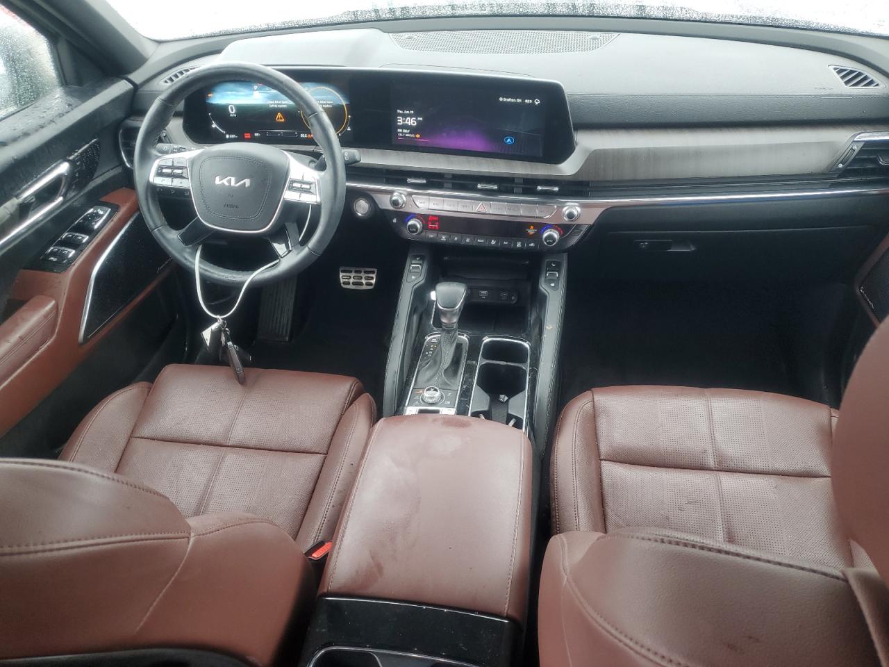 Front-end damage to a blue 2023 KIA TELLURIDE. The vehicle is drivable but needs repairs. Body damage is present, but no mechanical or secondary damage. The interior shows some wear. Overall exterior condition: Fair.