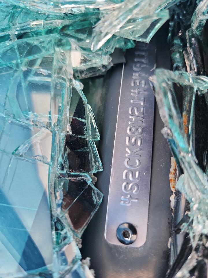 The car has significant body damage including roof, side panels, and front end. The glass is shattered. The interior also shows damage. The vehicle's overall condition is poor. The airbag is possibly deployed.