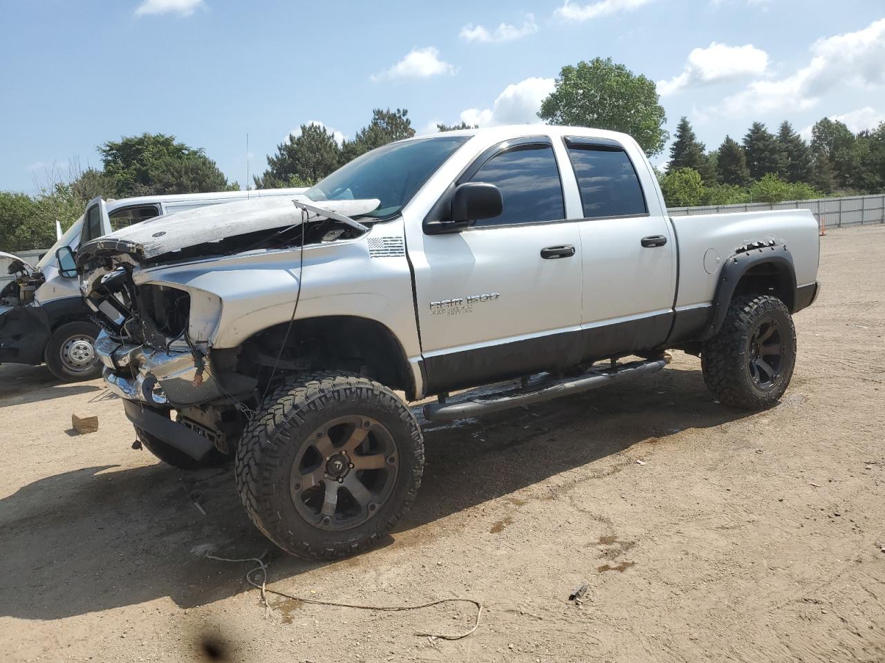 FairThis is a silver 2006 Dodge Ram 1500. The primary damage is to the front end, with secondary damage on the side. The vehicle appears to have been in a collision. The vehicle has significant visible damage. The wheels appear to be in usable condition, the lights appear damaged, and the glass is intact. Inside, the airbags have deployed, and there is damage to the interior.