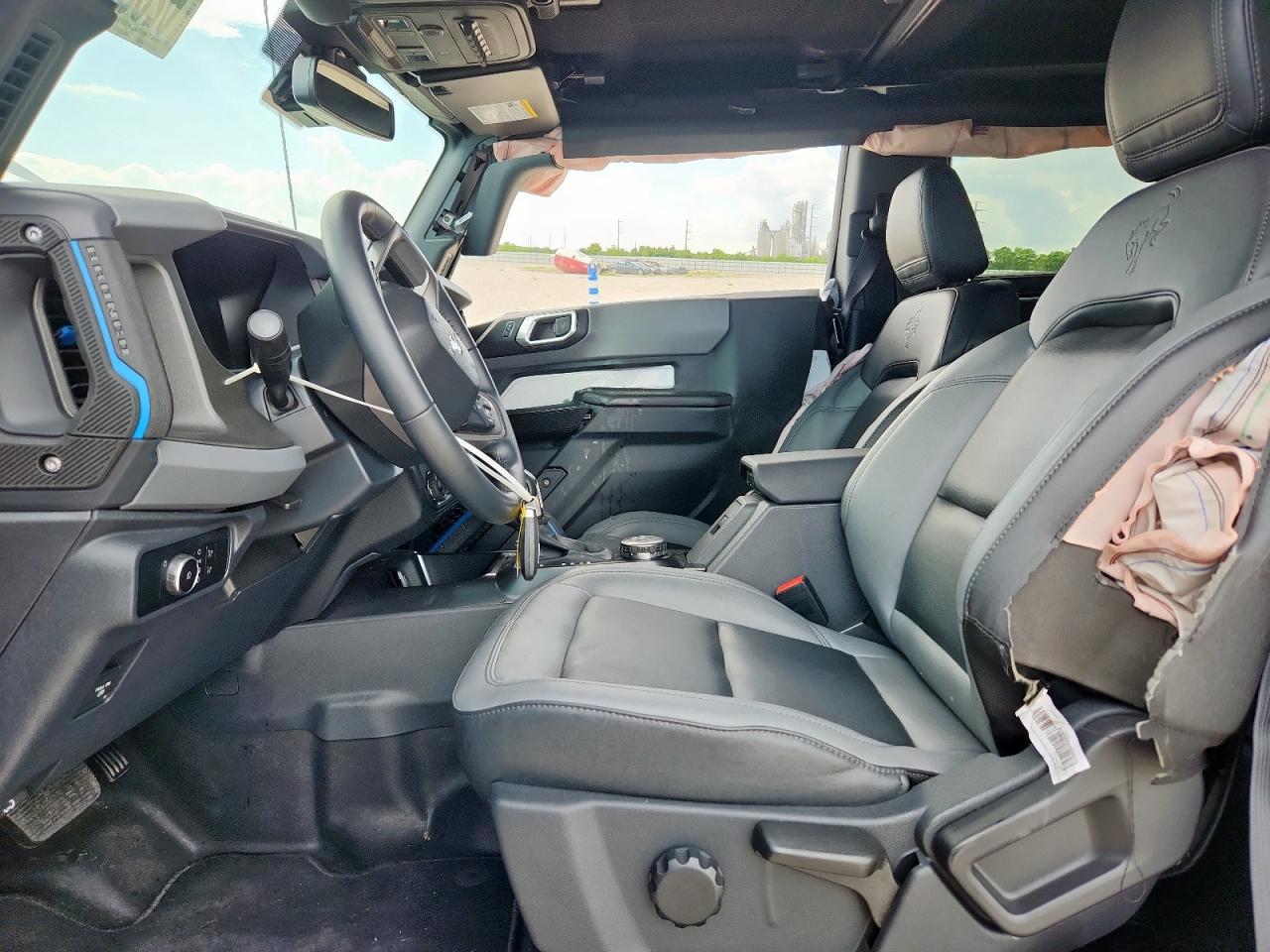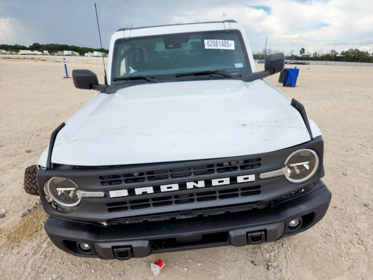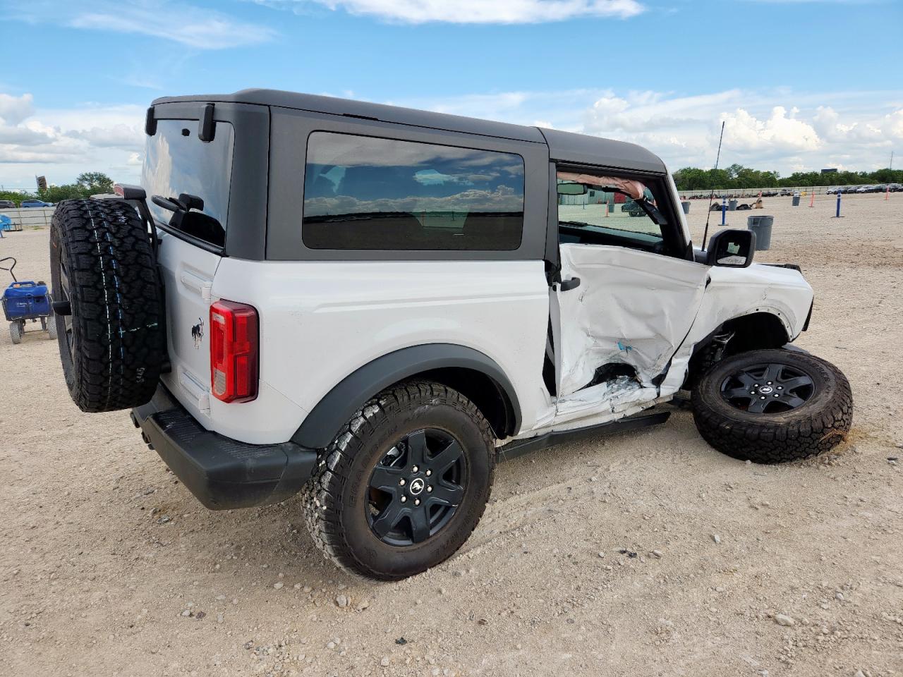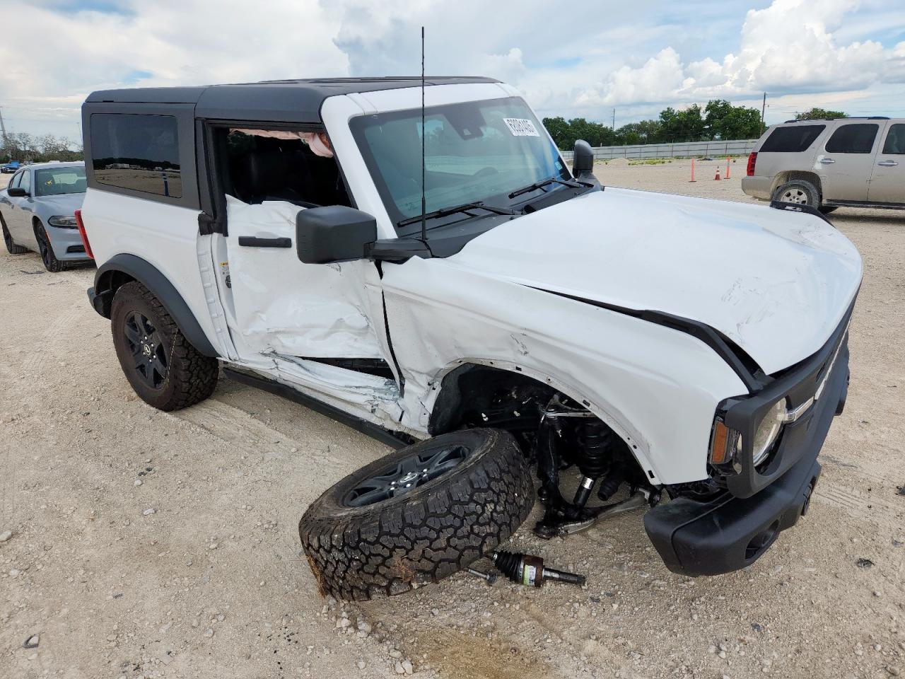 FairThis white 2024 FORD BRONCO BLA sustained significant damage, classified as Body damage. The primary impact is to the SIDE with secondary damage to the FRONT END. The car is listed as Run & Drive Verified, indicating it can start and move. The interior appears to have minor damage, with the airbags not deployed. The wheels are intact.