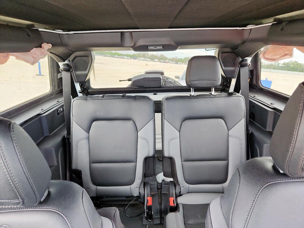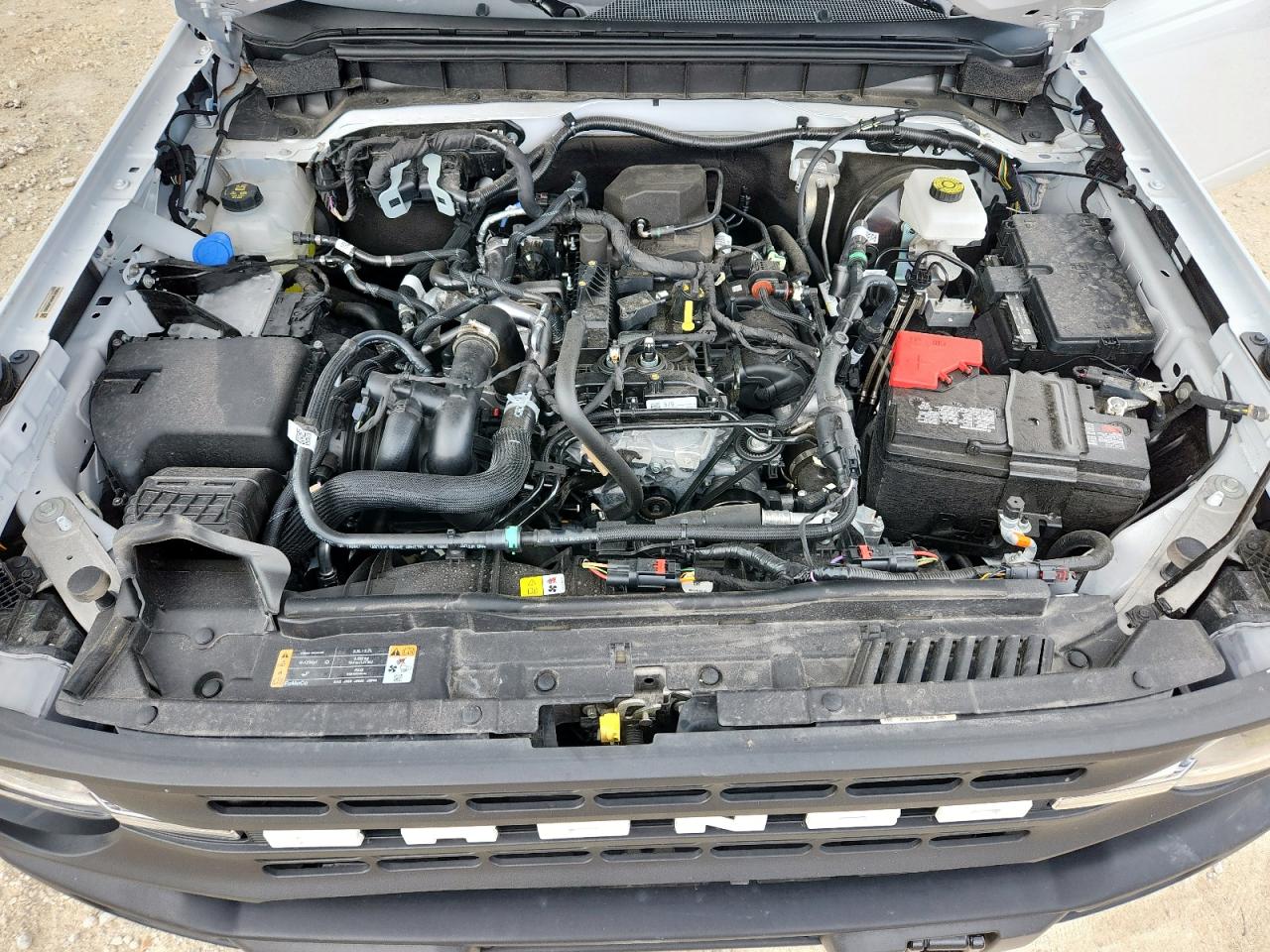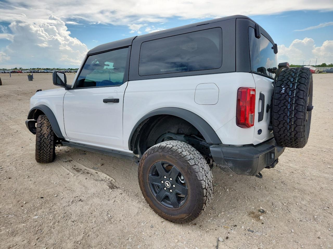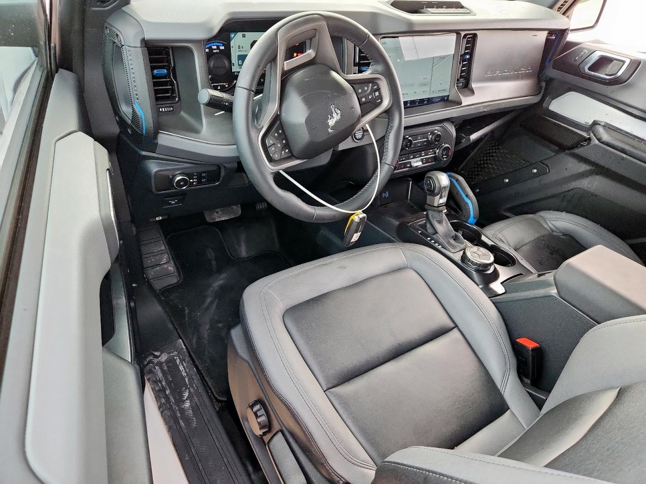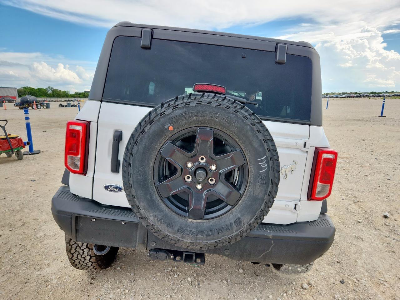 FairThis white 2024 FORD BRONCO BLA sustained significant damage, classified as Body damage. The primary impact is to the SIDE with secondary damage to the FRONT END. The car is listed as Run & Drive Verified, indicating it can start and move. The interior appears to have minor damage, with the airbags not deployed. The wheels are intact.
