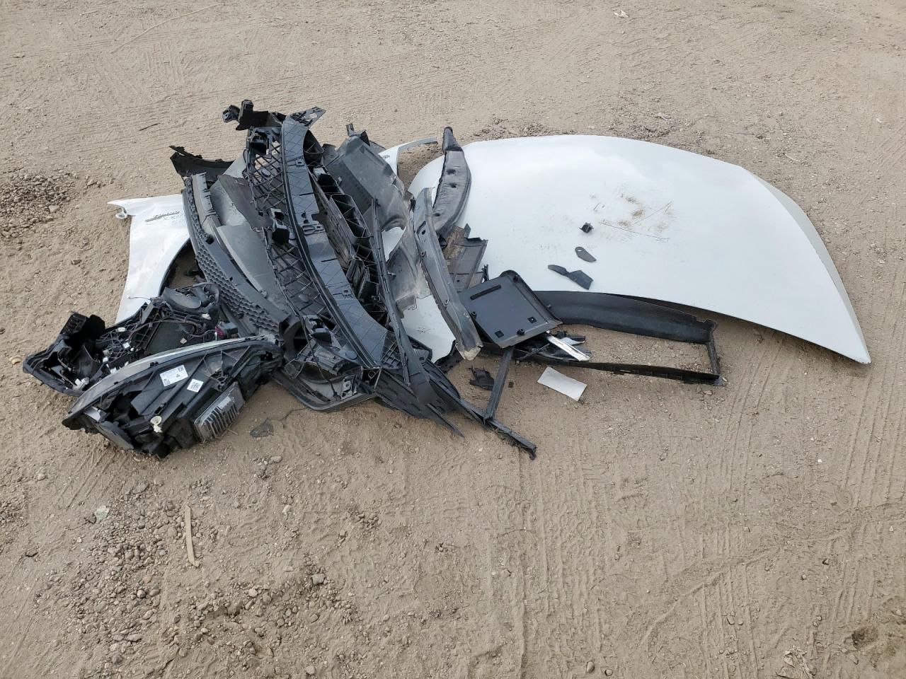 The vehicle has severe front-end damage, including the hood, bumper, and front body panels. Mechanical issues are evident, with the engine and related components likely affected. Interior damage includes deployed airbags and damage to the dashboard and steering wheel. The wheels appear to be in good condition, with no visible damage. The car is not drivable and in poor condition.