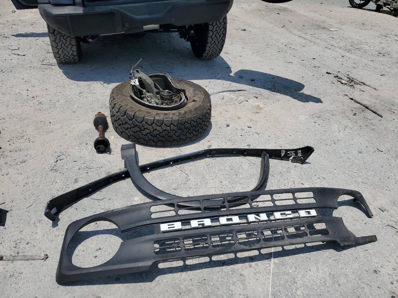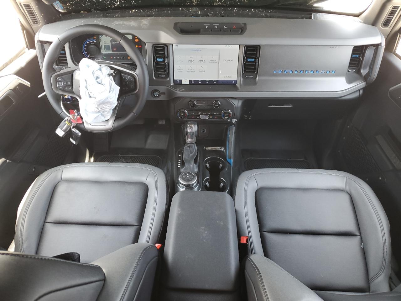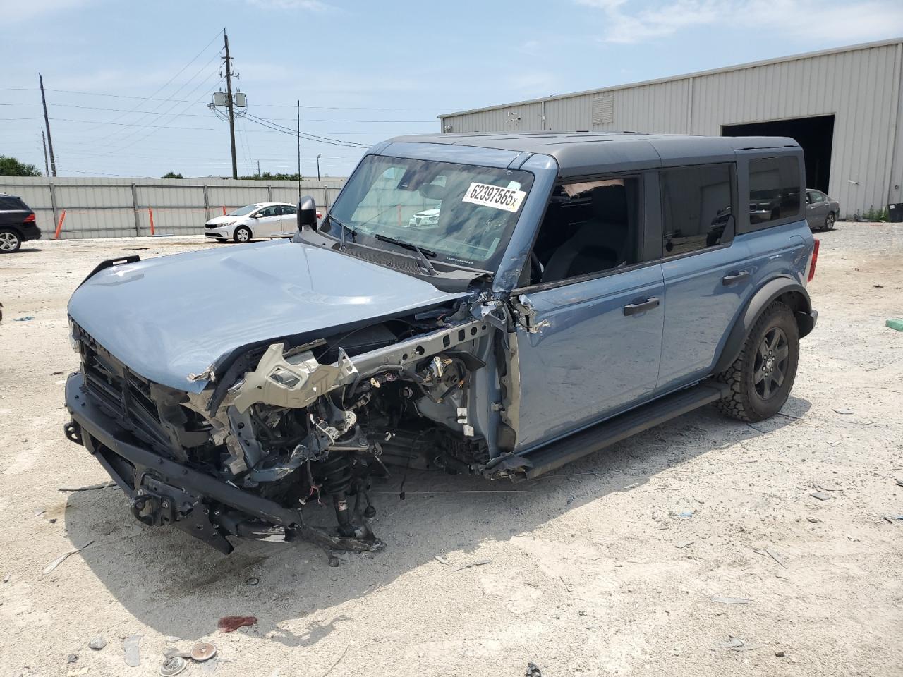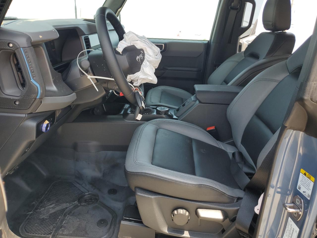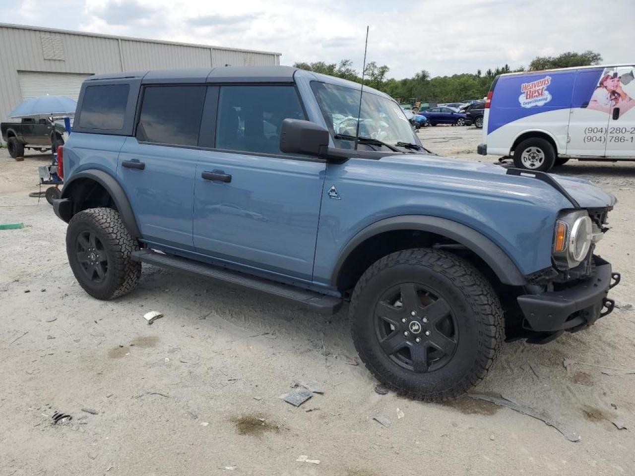 FairThe 2024 Ford Bronco BLA in teal displays significant damage, primarily to the front end and side. The front end is severely compromised, with extensive structural damage. The side panels also show visible damage. The vehicle's wheels appear intact. The interior shows signs of damage, including deployed airbags. The vehicle starts but requires considerable repairs and is likely not drivable.
