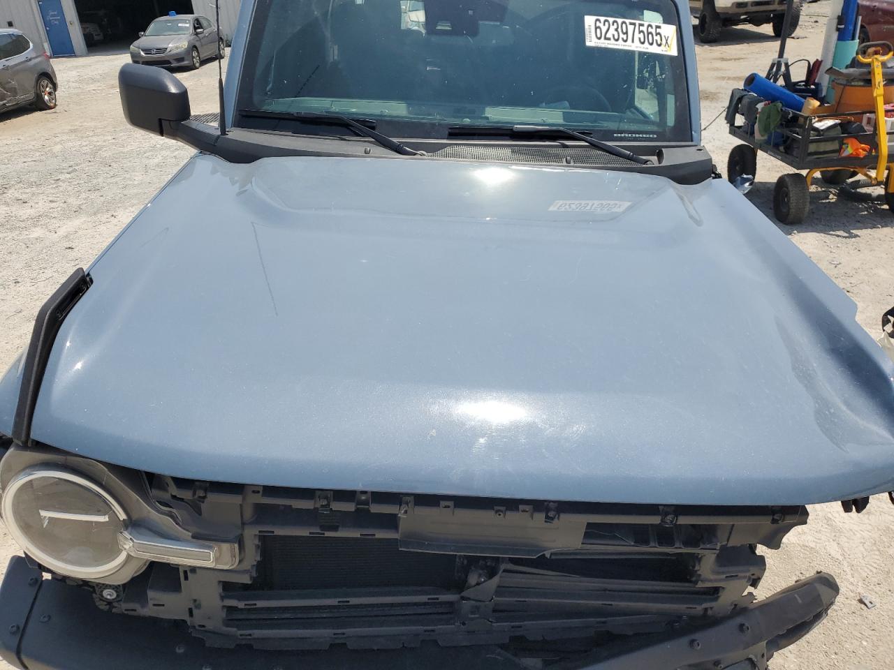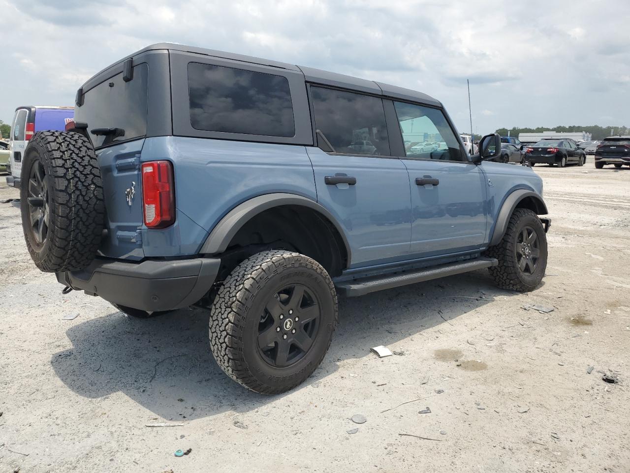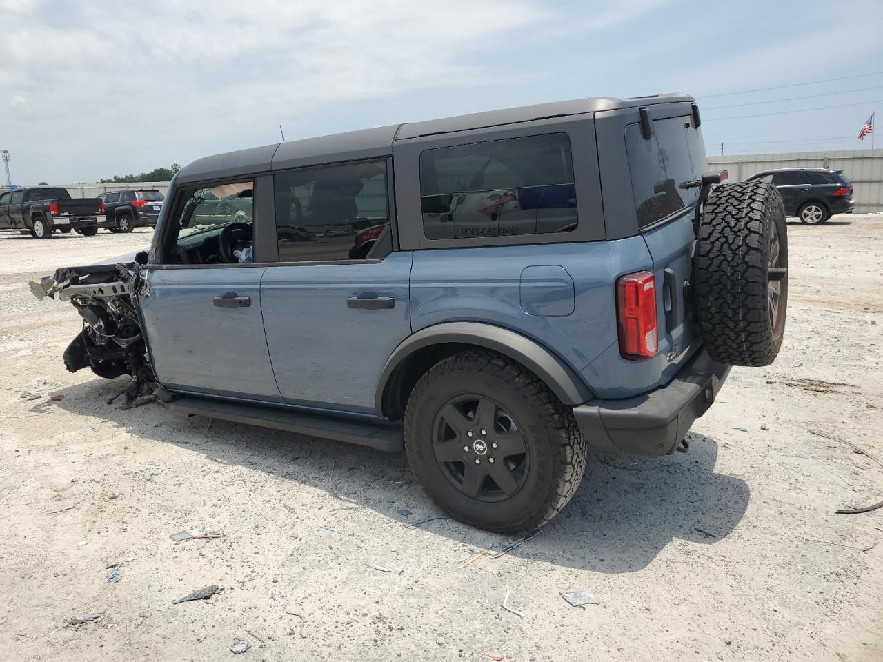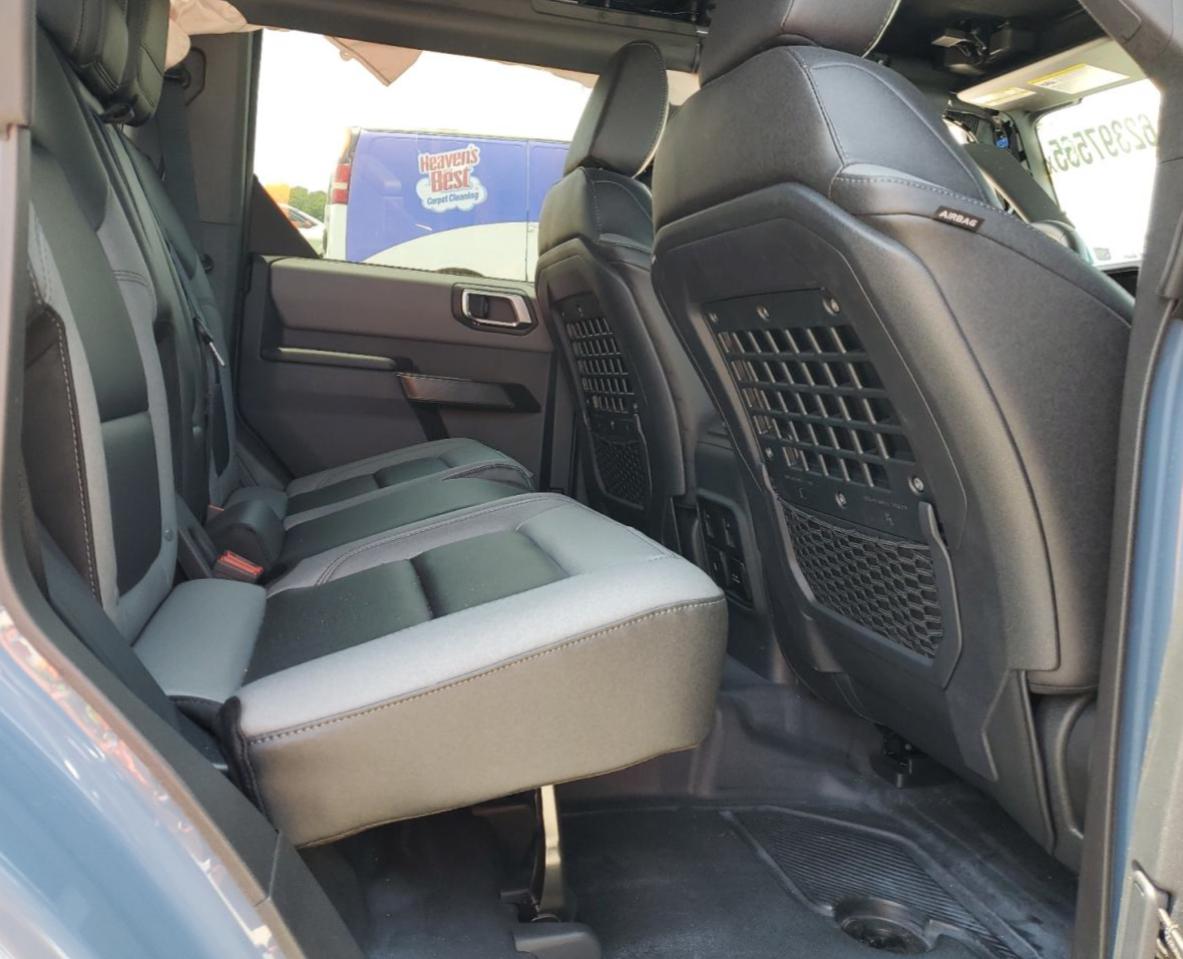 FairThe 2024 Ford Bronco BLA in teal displays significant damage, primarily to the front end and side. The front end is severely compromised, with extensive structural damage. The side panels also show visible damage. The vehicle's wheels appear intact. The interior shows signs of damage, including deployed airbags. The vehicle starts but requires considerable repairs and is likely not drivable.