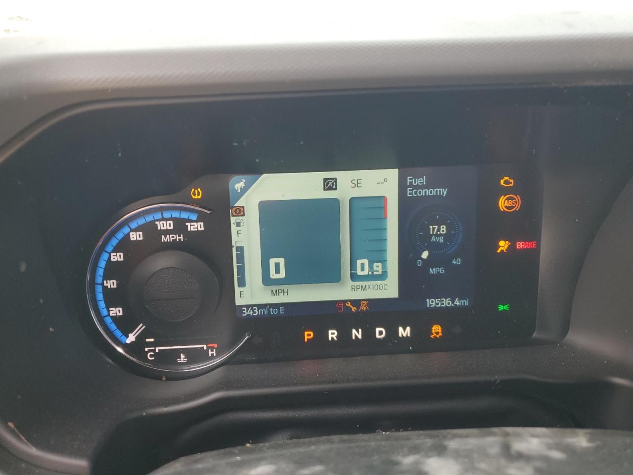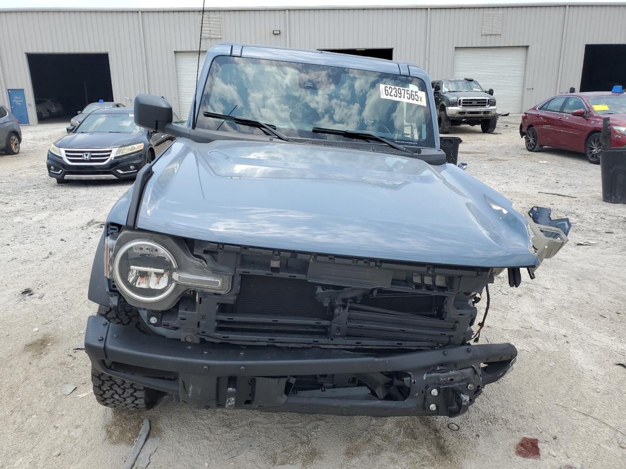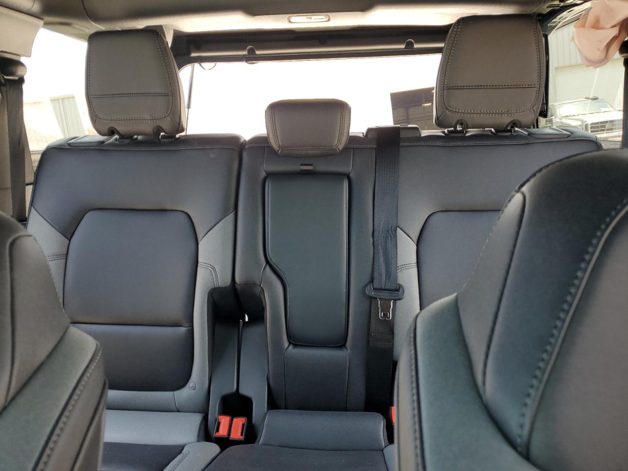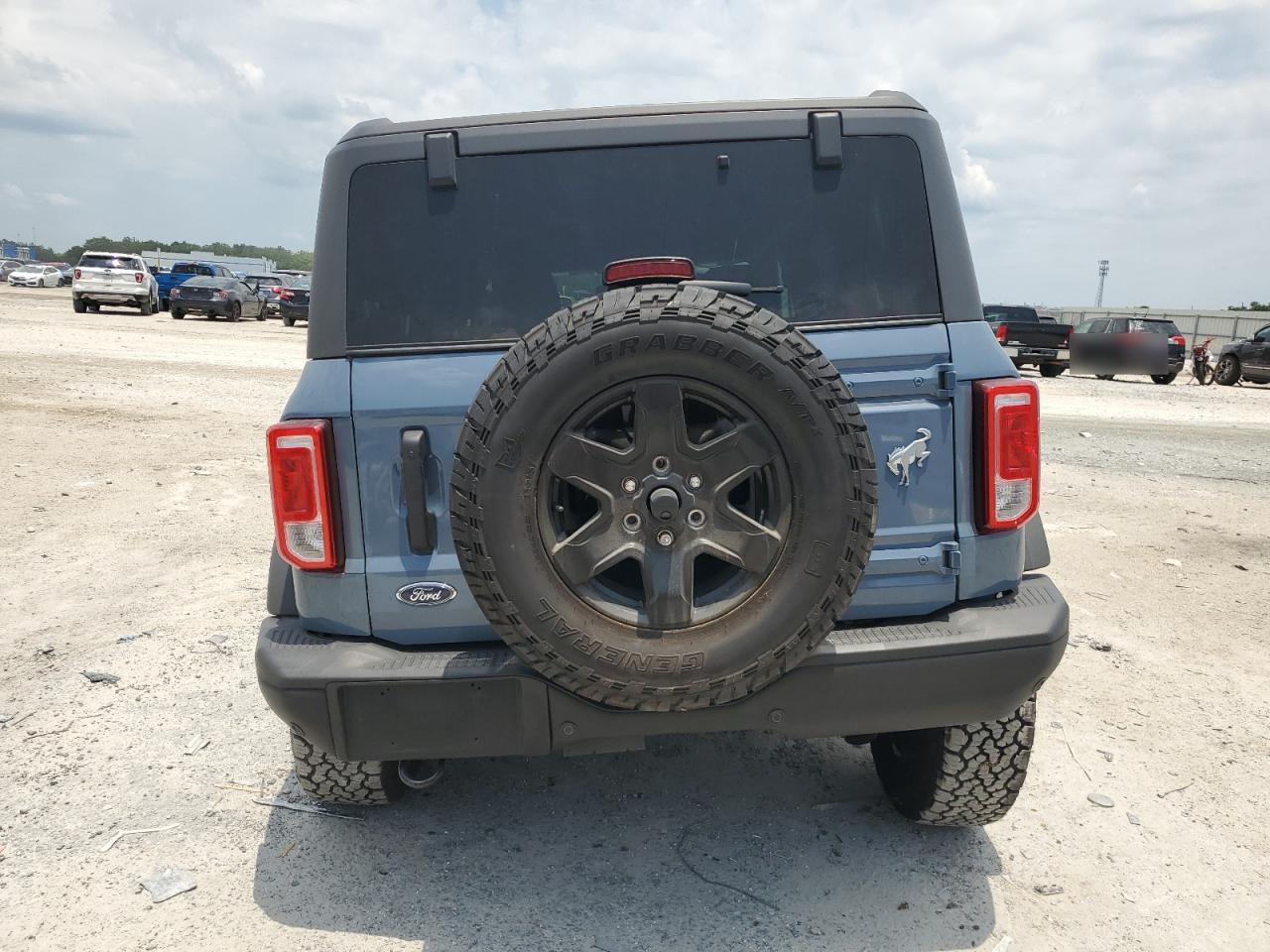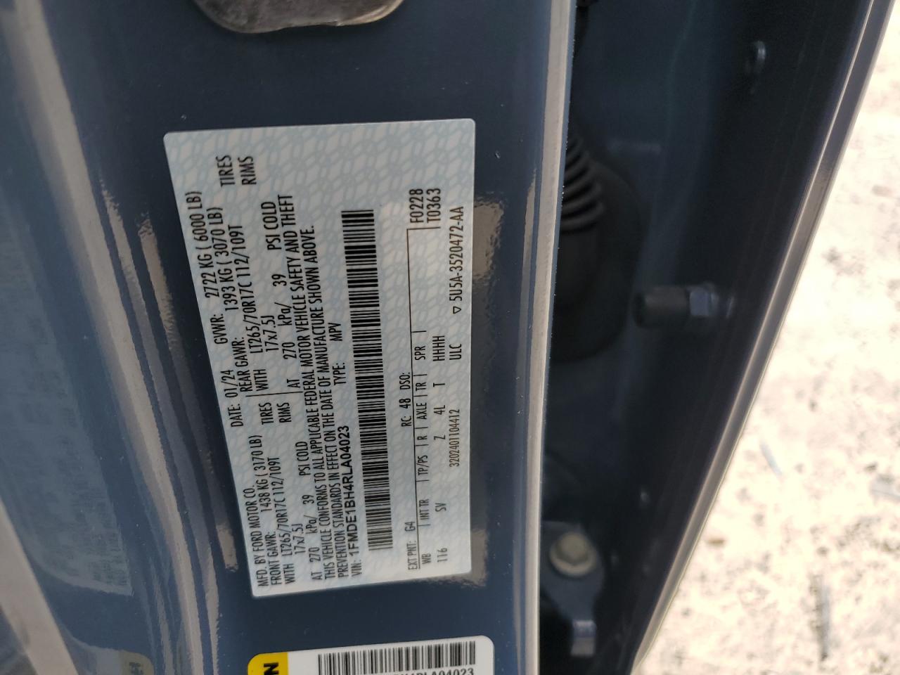 FairThe 2024 Ford Bronco BLA in teal displays significant damage, primarily to the front end and side. The front end is severely compromised, with extensive structural damage. The side panels also show visible damage. The vehicle's wheels appear intact. The interior shows signs of damage, including deployed airbags. The vehicle starts but requires considerable repairs and is likely not drivable.