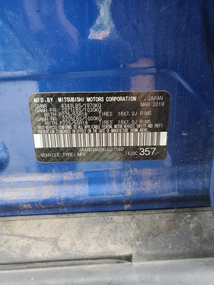 FairThis is a 2019 Mitsubishi Outlander with significant front-end damage. The vehicle is blue. The primary damage is to the front end, with no secondary damage noted. The car starts. The body panels are damaged, and the vehicle appears to be drivable but needs repairs. The interior shows minor wear and tear.