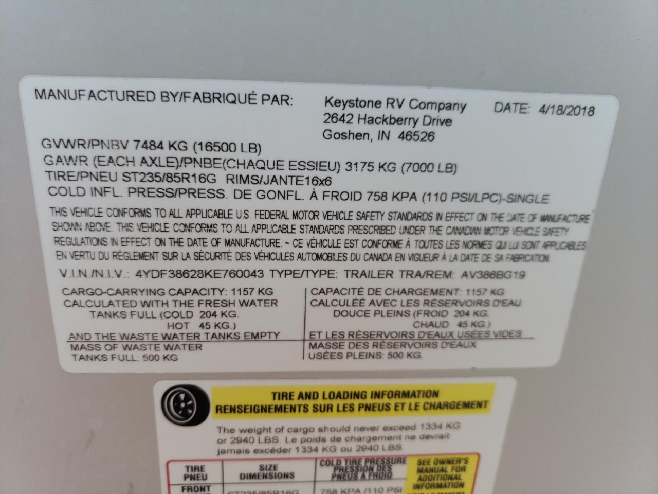 GoodThe 2019 KEYSTONE AVALANCHE is a white RV with partial repair and no secondary damage. The vehicle's exterior shows moderate damage, potentially requiring some repairs, while the interior has minor damage. The overall state is fair. Search terms: KEYSTONE AVALANCHE 2019, RV damage, white RV, partial repair, drivable RV, moderate damage, interior damage.