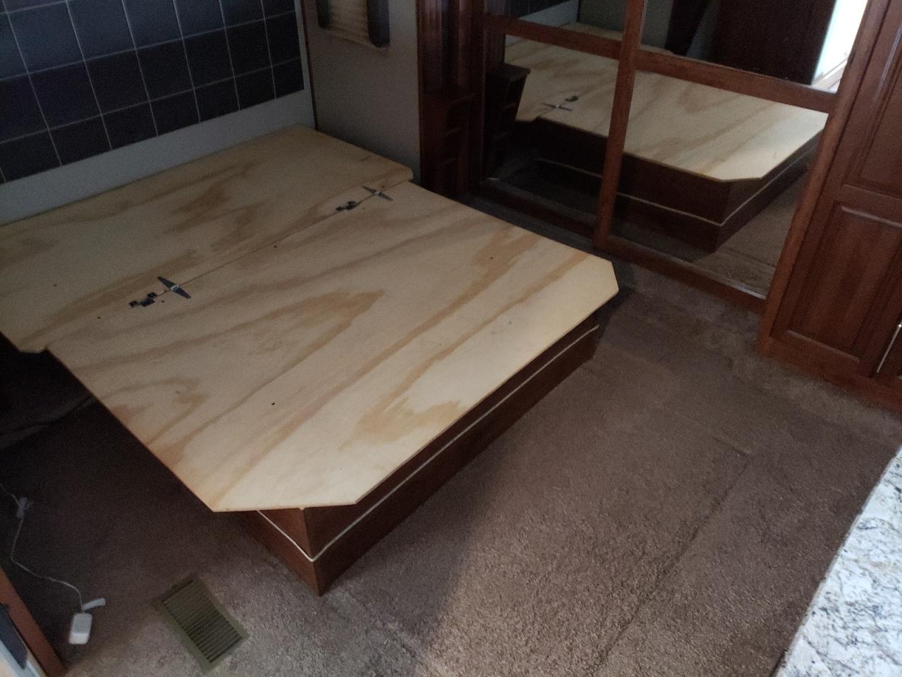 The RV has damage to the body, with some areas requiring repair. The interior shows signs of wear and tear.