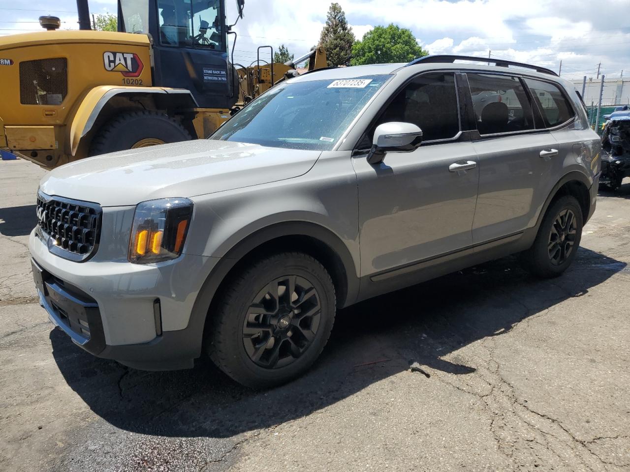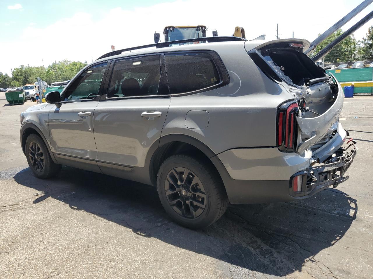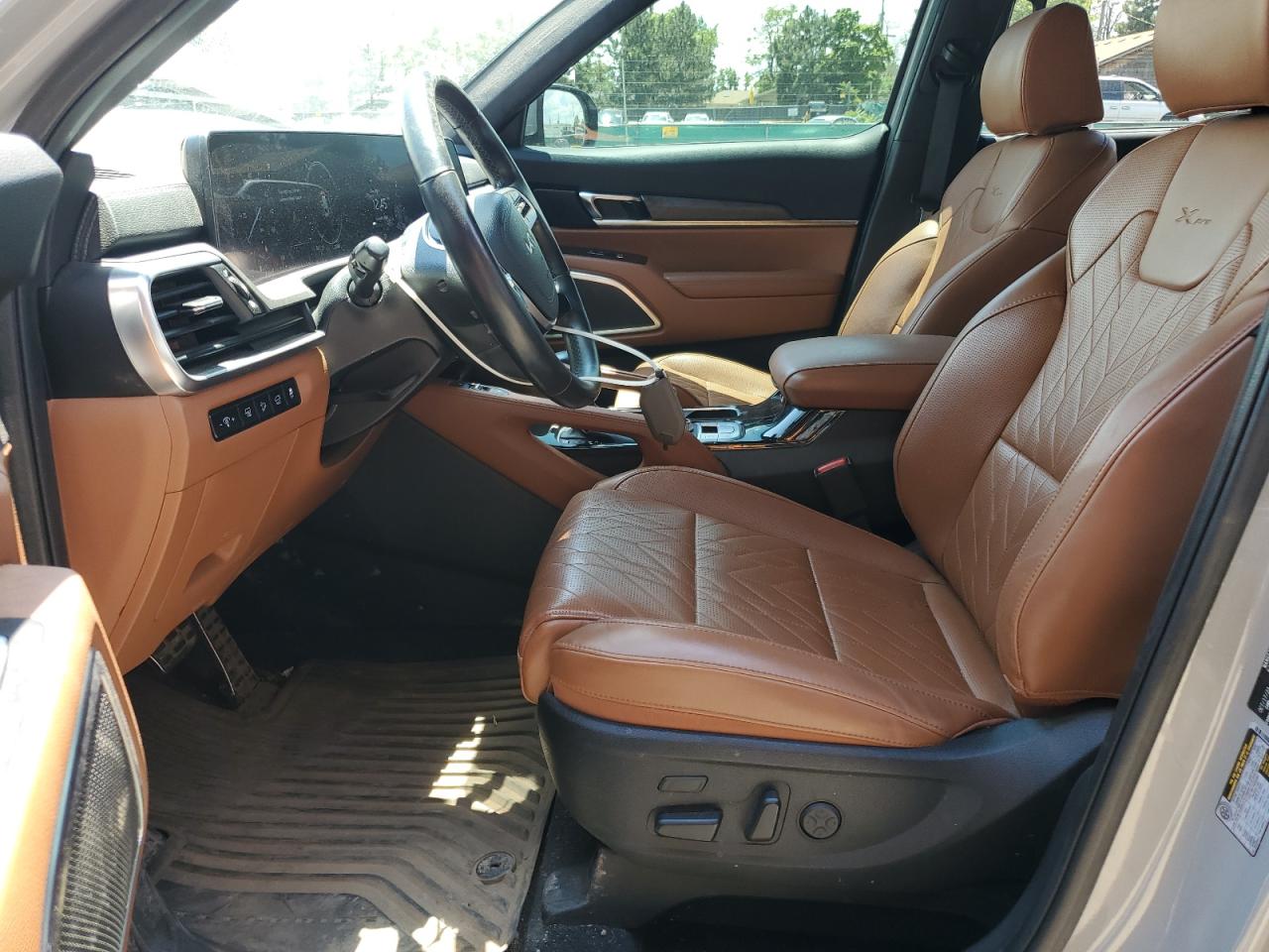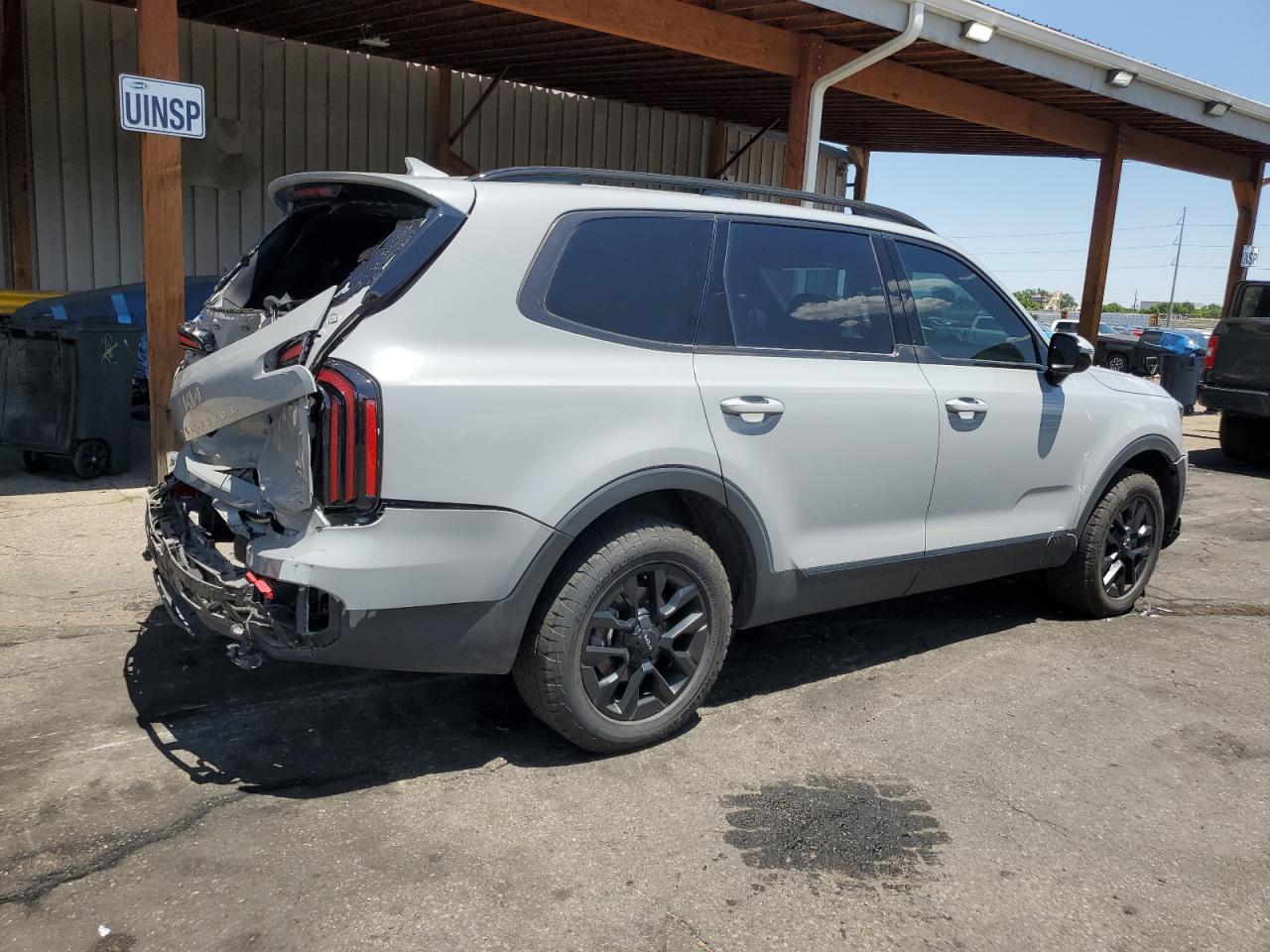 The Kia Telluride has been involved in a rear-end collision, resulting in extensive damage to the rear of the vehicle. The rear bumper, tailgate, and surrounding body panels show significant signs of impact. The rear window is shattered, and the lights may be damaged. The front of the car appears to be in good condition. The interior, while showing signs of use, appears intact.
