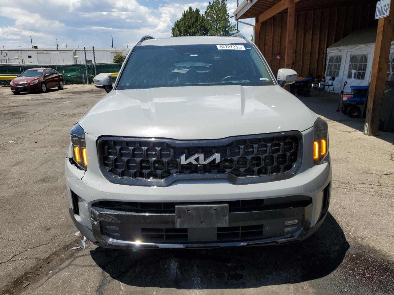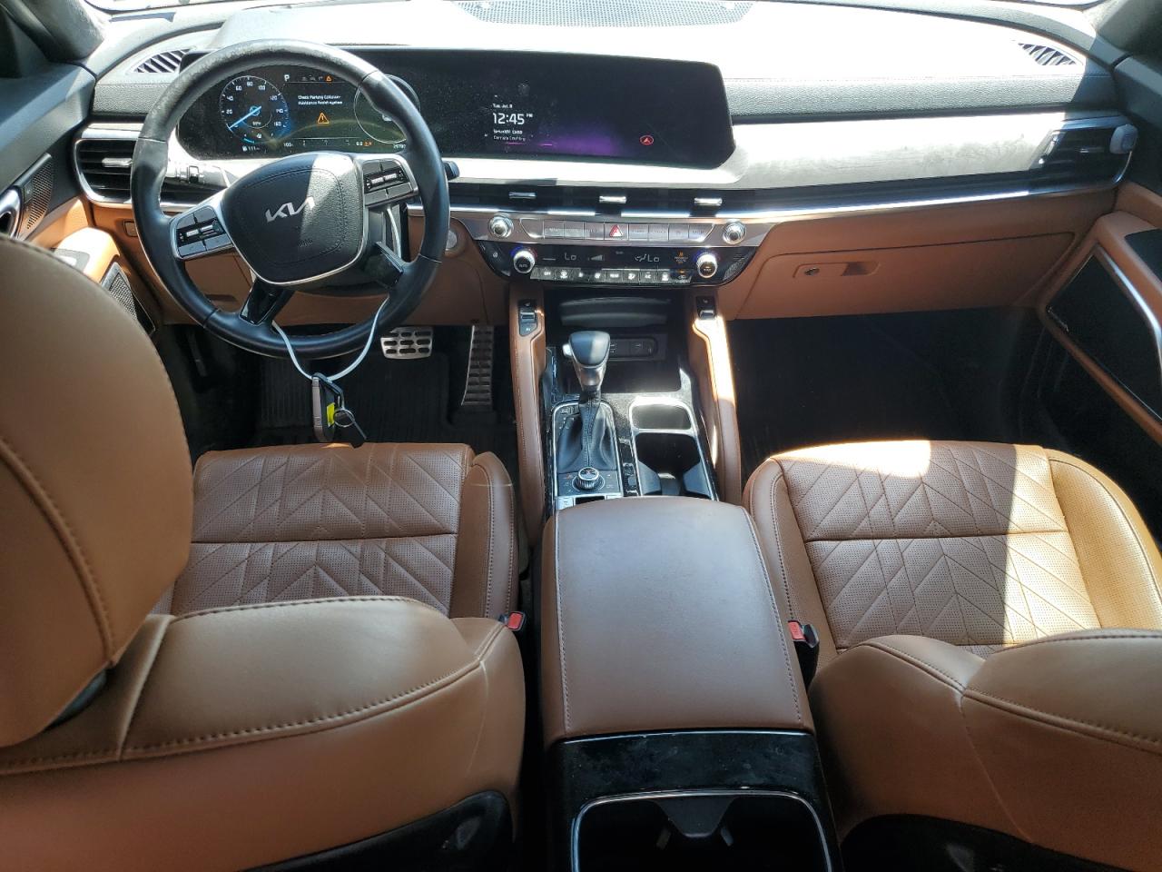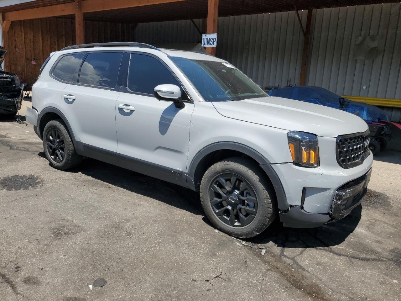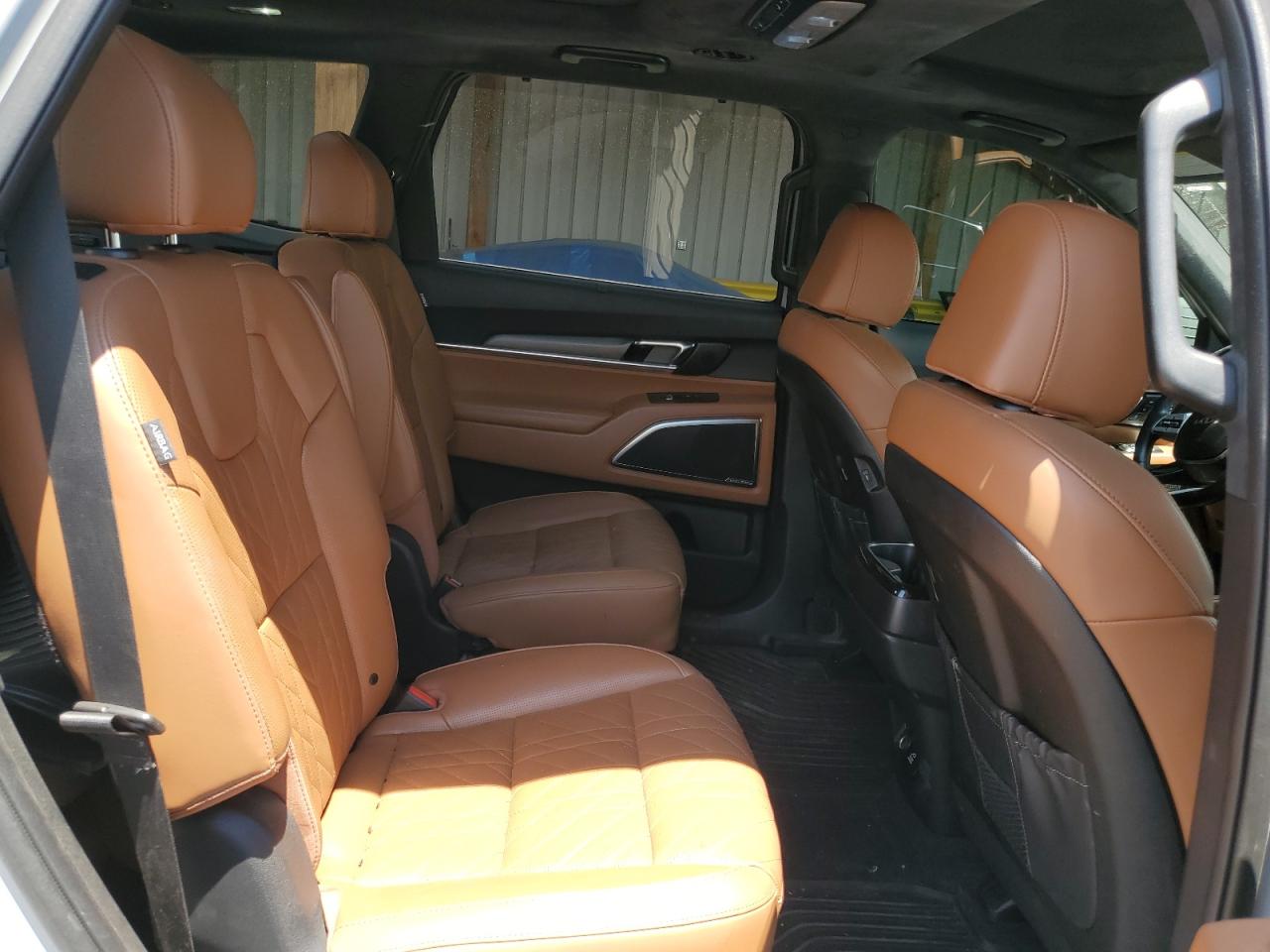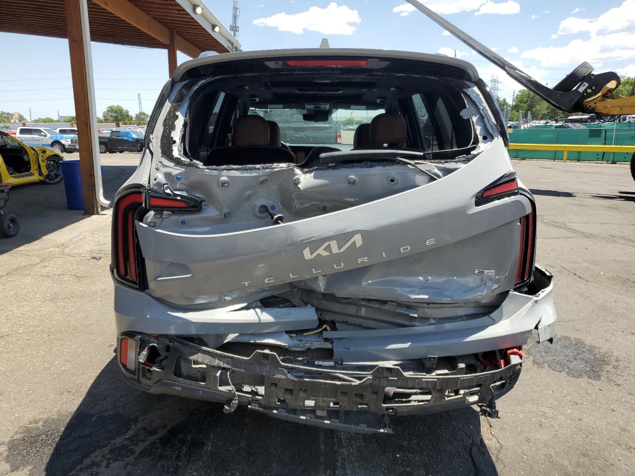 The Kia Telluride has been involved in a rear-end collision, resulting in extensive damage to the rear of the vehicle. The rear bumper, tailgate, and surrounding body panels show significant signs of impact. The rear window is shattered, and the lights may be damaged. The front of the car appears to be in good condition. The interior, while showing signs of use, appears intact.