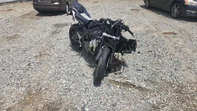 The motorcycle exhibits extensive damage. The front end is severely damaged, including the front fairing, headlight, and handlebars. The frame appears bent, indicating frame damage. The wheels are damaged. Interior damage is present. The motorcycle's overall condition suggests it has been in a significant accident and requires considerable repairs before it is drivable.