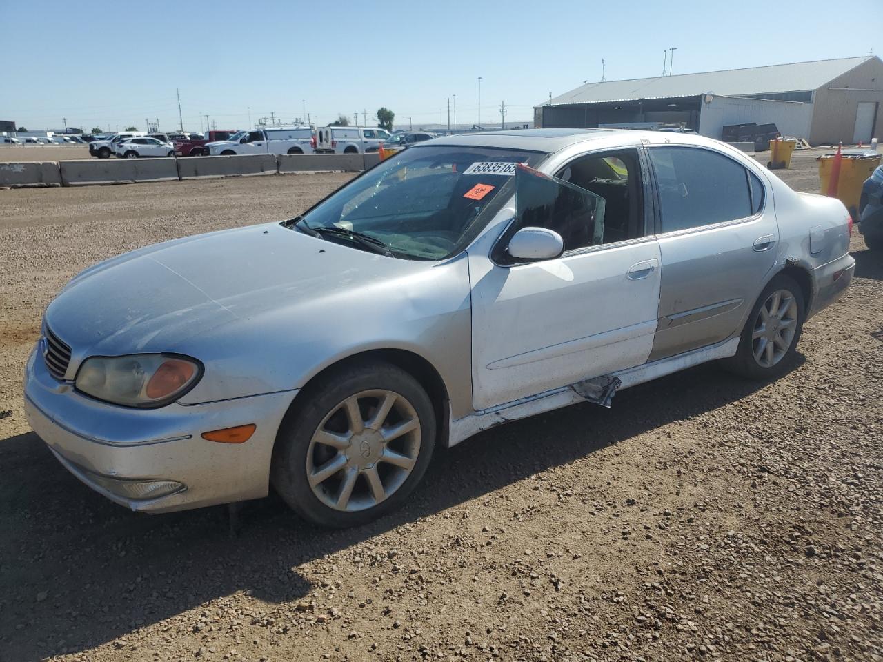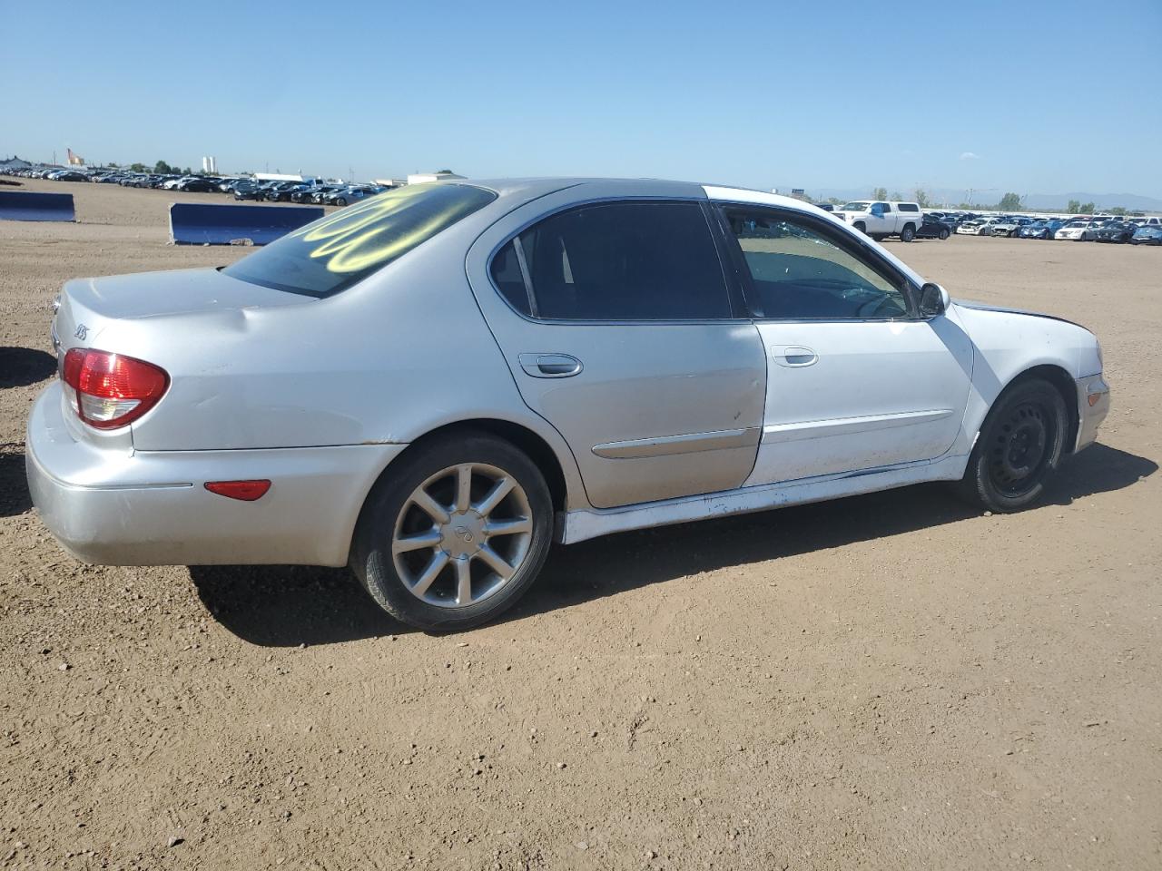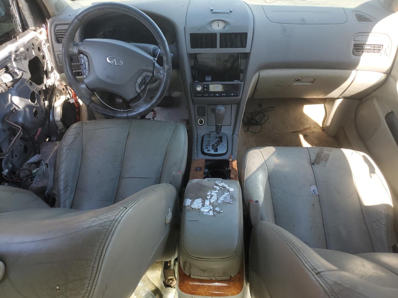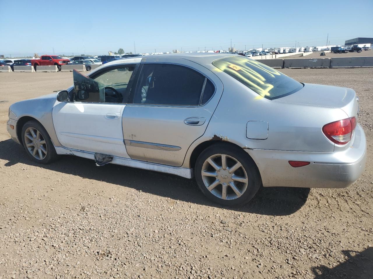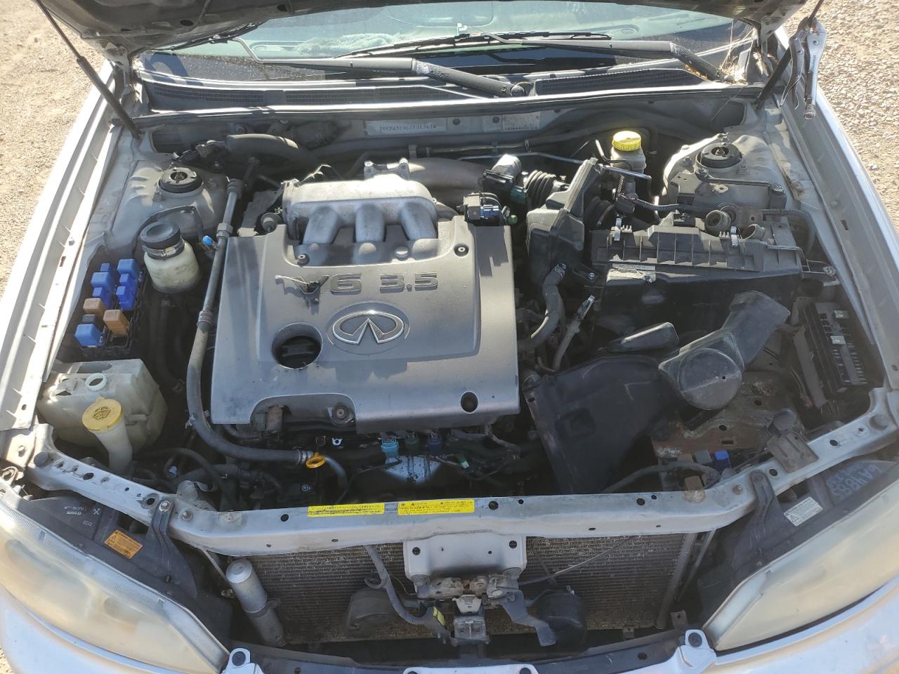FairThis is a silver 2002 INFINITI I35. The vehicle exhibits significant damage, primarily to the body panels. The exterior presents with noticeable cosmetic issues, including paint damage and missing body panels. The interior shows considerable wear and tear, with visible damage throughout. The vehicle's wheels appear to be intact. Lights and glasses show moderate damage. The car has been marked with 'TOW' on the rear windshield. The damage is characterized by BIOHAZARD/CHEMICAL as primary and TOP/ROOF as secondary.