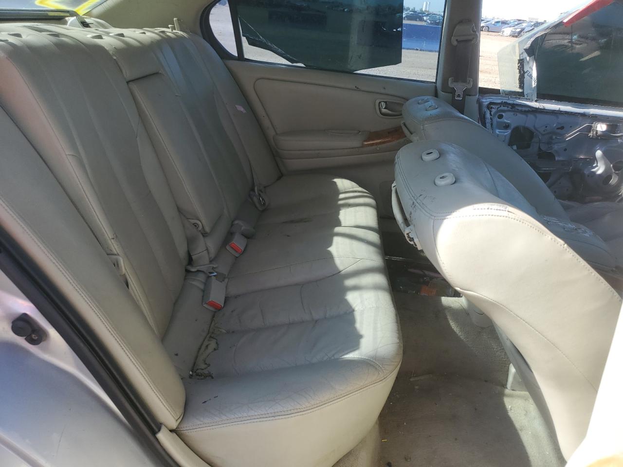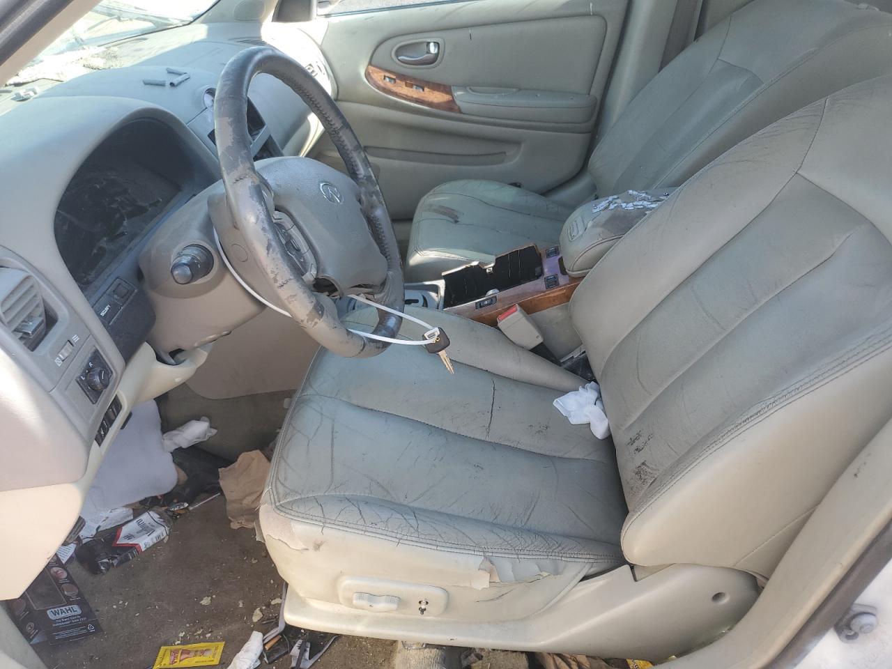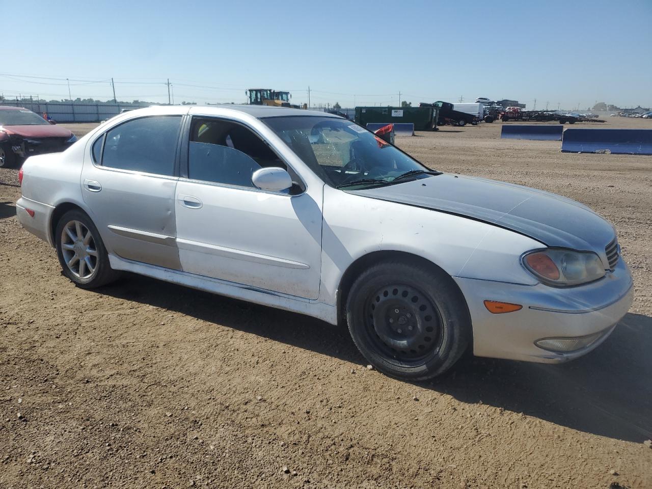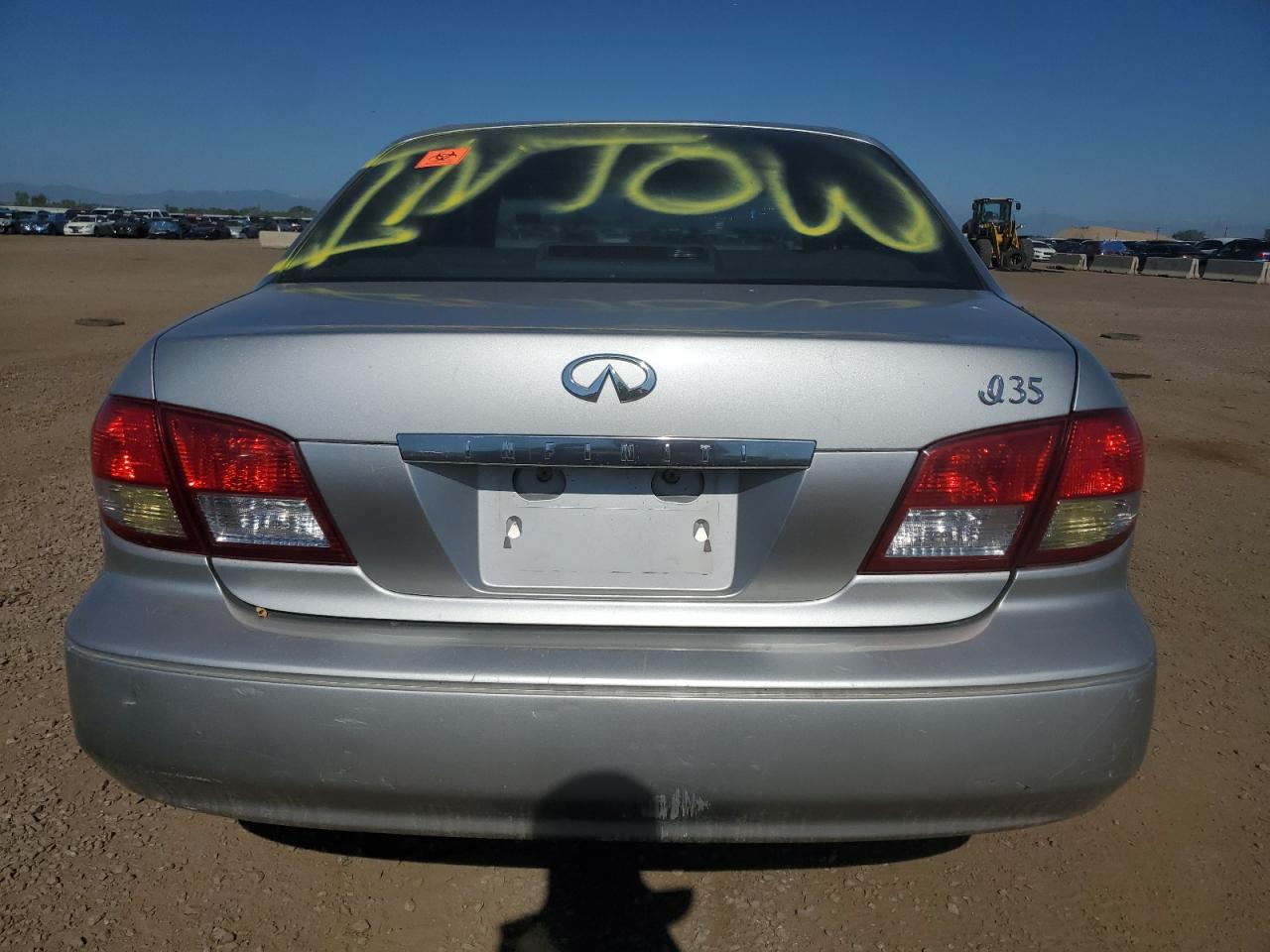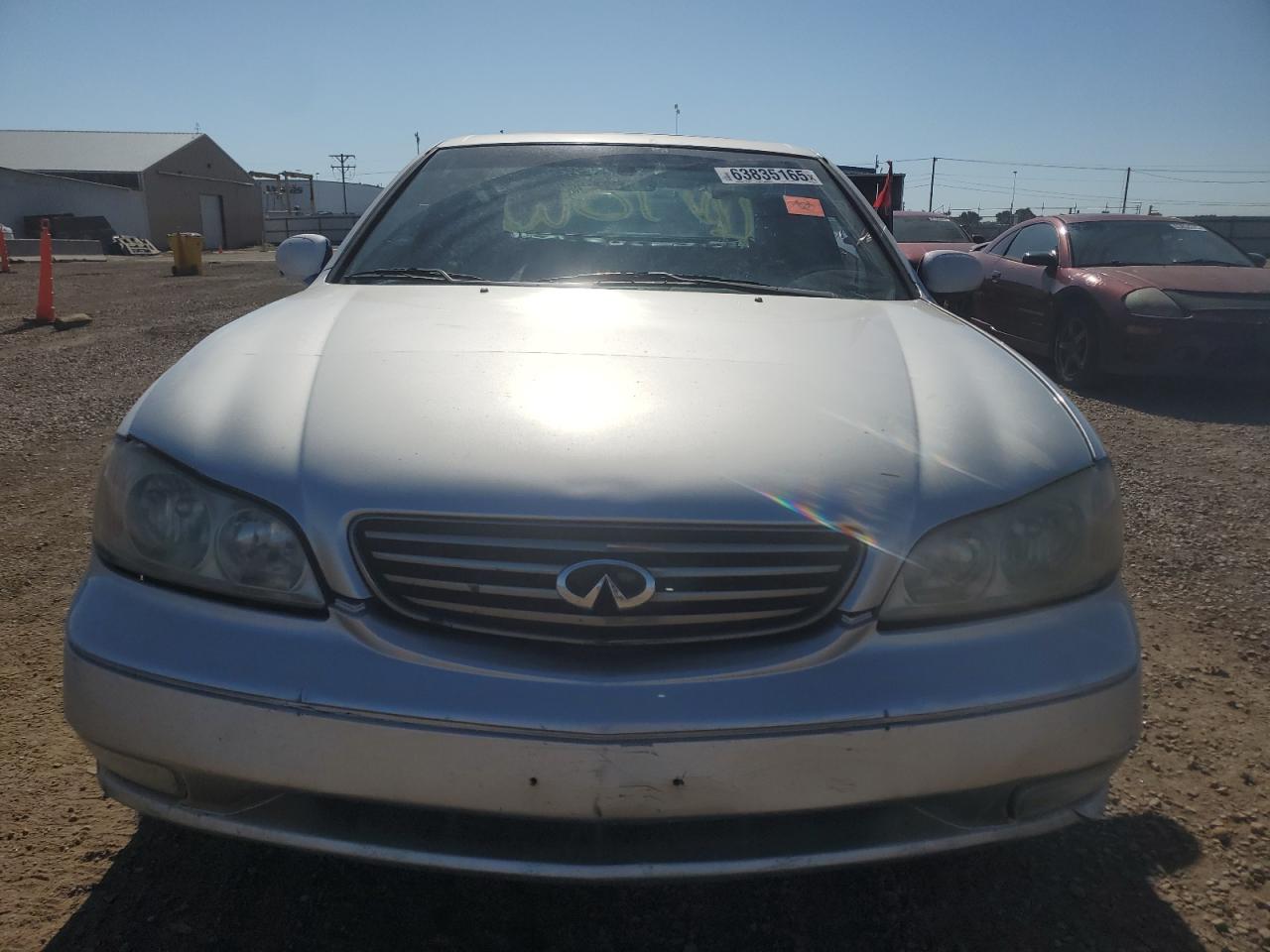 FairThis is a silver 2002 INFINITI I35. The vehicle exhibits significant damage, primarily to the body panels. The exterior presents with noticeable cosmetic issues, including paint damage and missing body panels. The interior shows considerable wear and tear, with visible damage throughout. The vehicle's wheels appear to be intact. Lights and glasses show moderate damage. The car has been marked with 'TOW' on the rear windshield. The damage is characterized by BIOHAZARD/CHEMICAL as primary and TOP/ROOF as secondary.