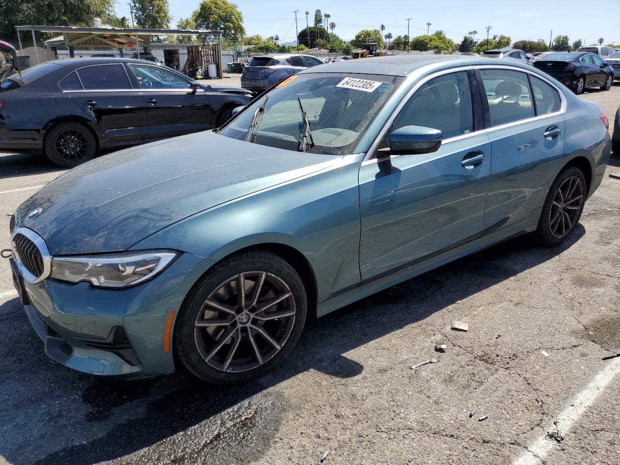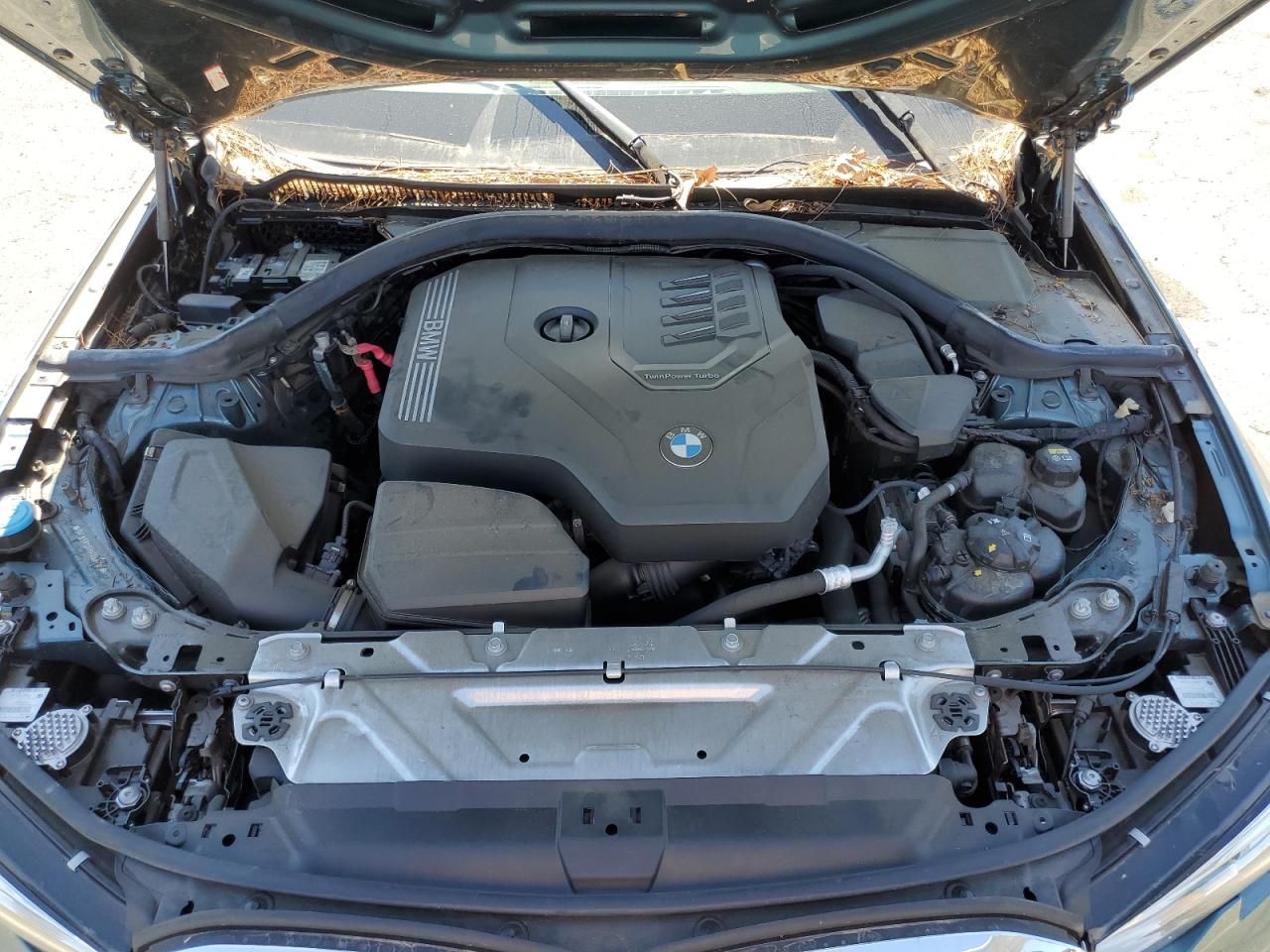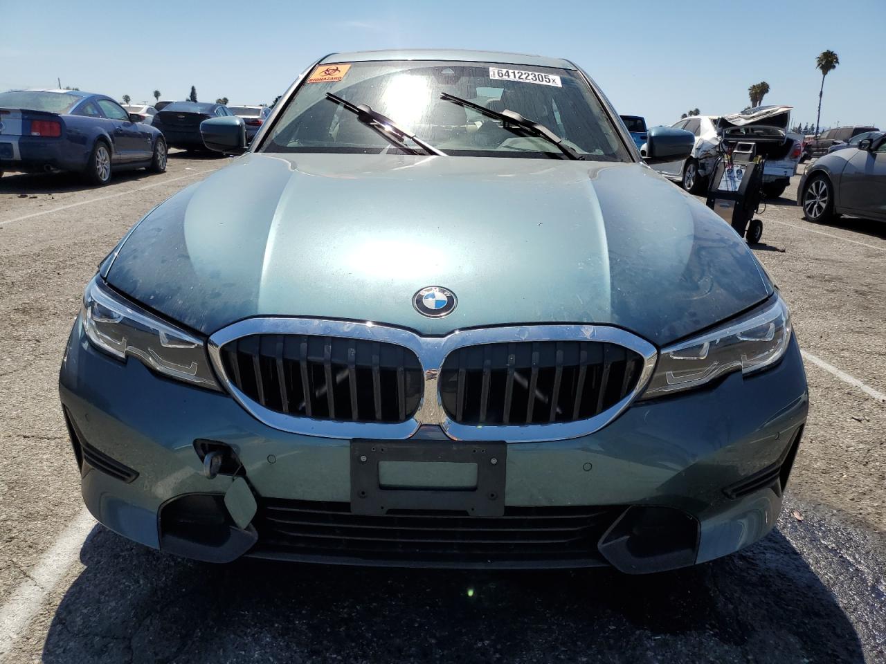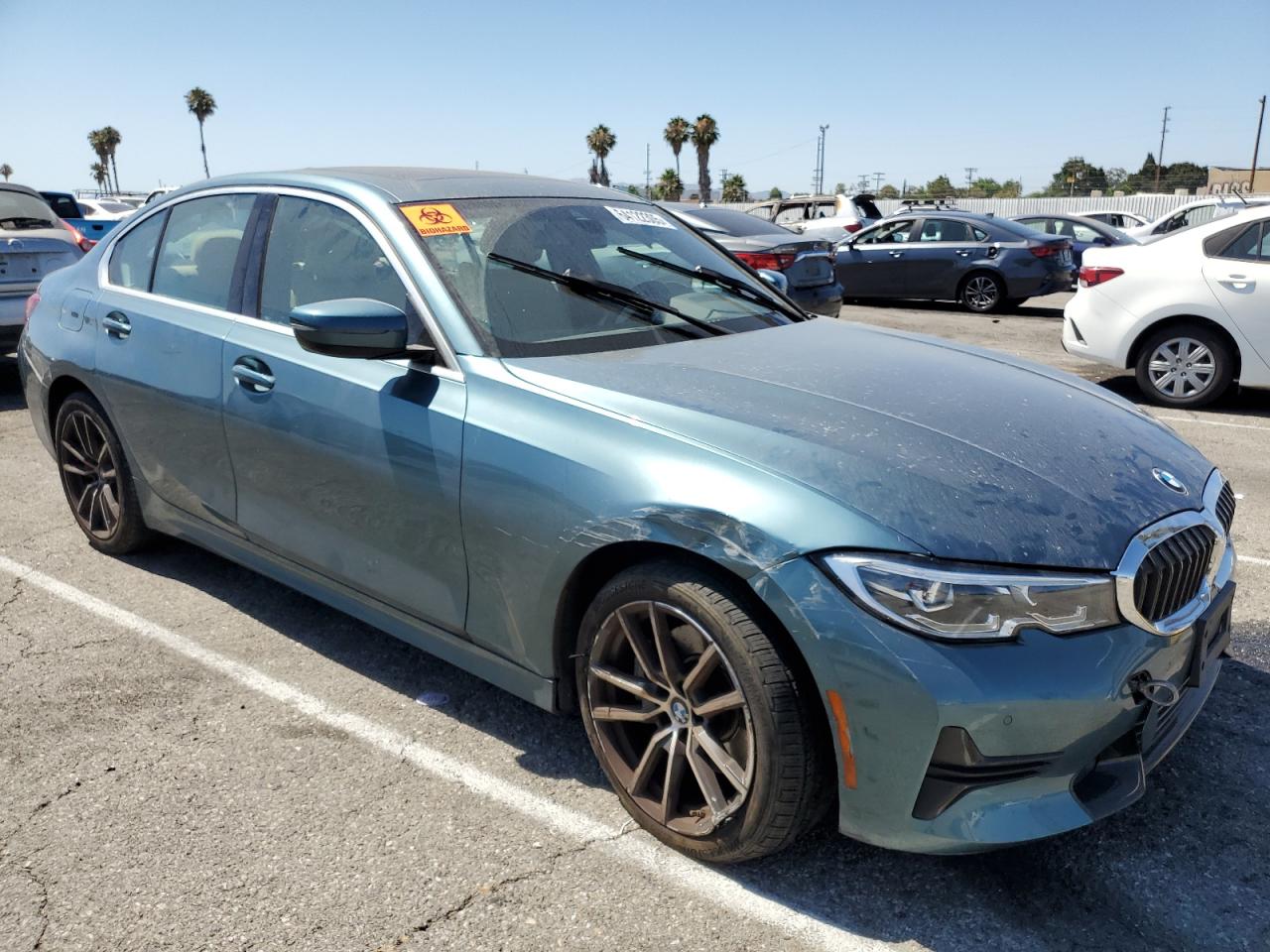 FairThis 2021 BMW 330i, in a striking teal color, presents with significant front-end damage, indicating a collision. The airbags have deployed, and the interior shows considerable damage. The drivetrain malfunction warning suggests potential mechanical issues. Wheels appear to be intact, but the overall condition is significantly impacted.