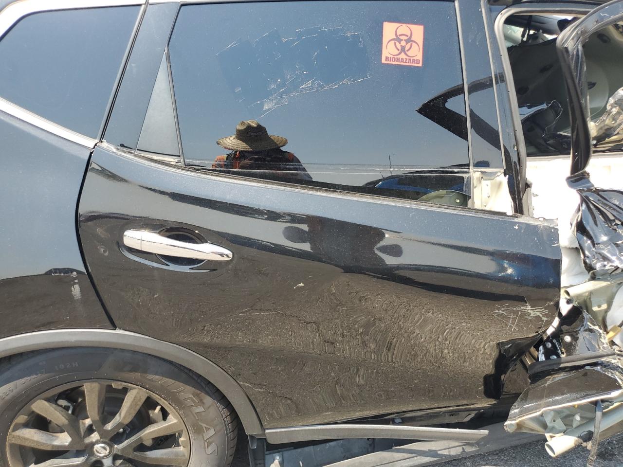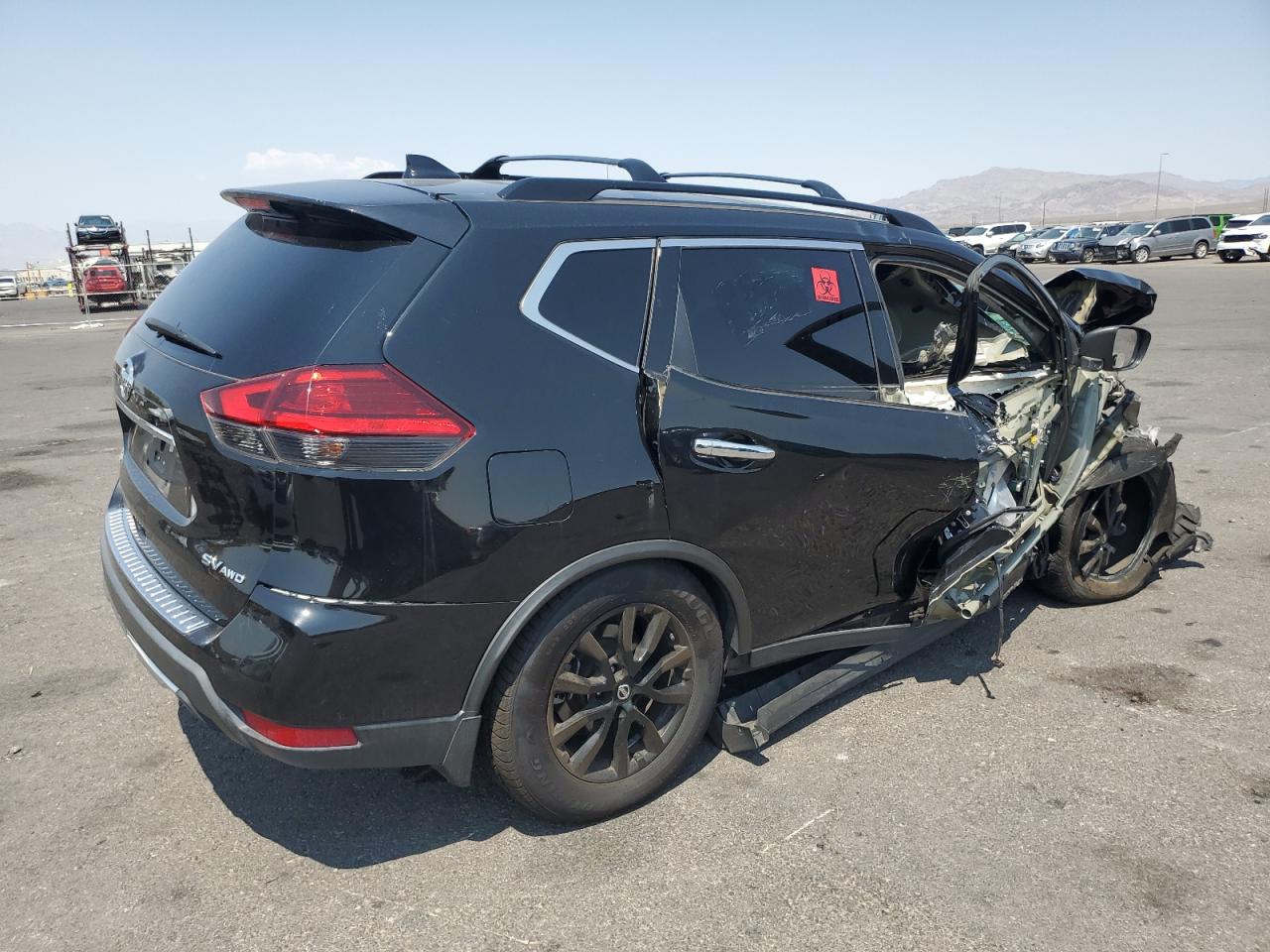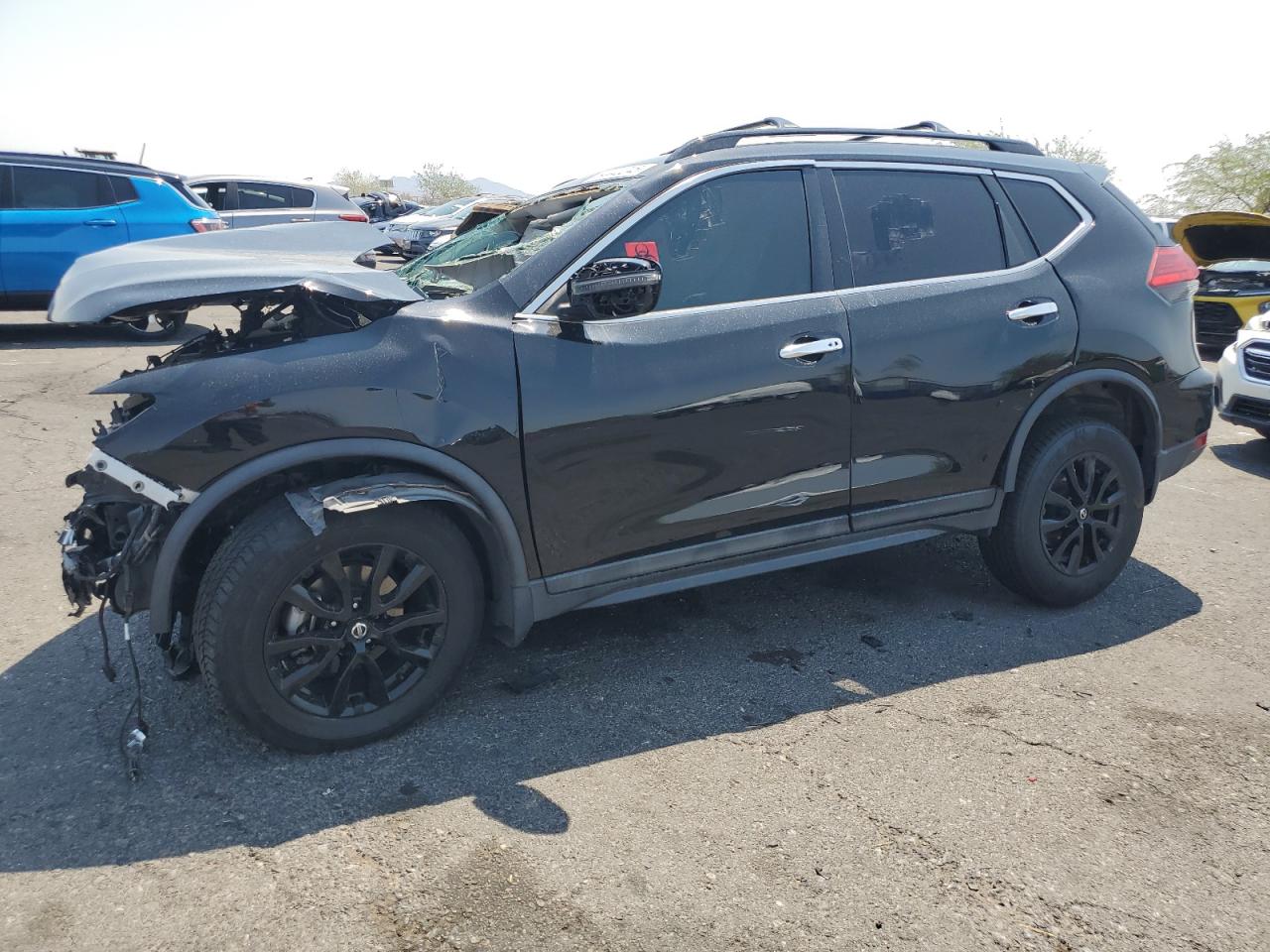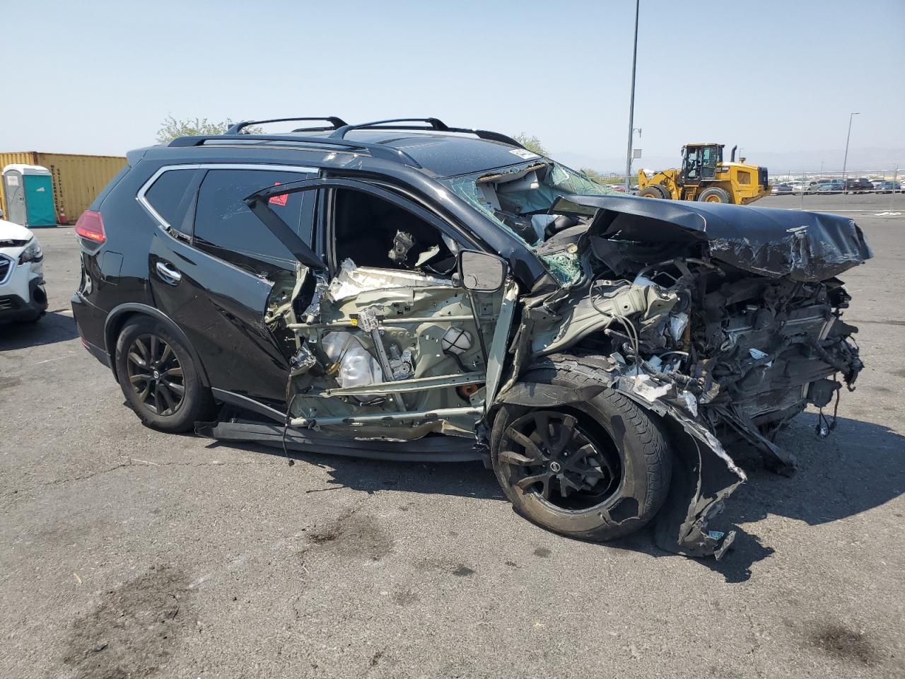 PoorThe 2017 Nissan Rogue SV is severely damaged. The primary damage is to the front end, and secondary damage is on the side. The car is black and has significant damage. The front end is completely crushed. The side has damage, and airbags have been deployed. The wheels appear intact, the lights are damaged, and the windows are broken. The interior shows signs of airbag deployment and significant damage to the dashboard and interior components. The vehicle is in a state of disrepair, indicating a need for extensive repair.