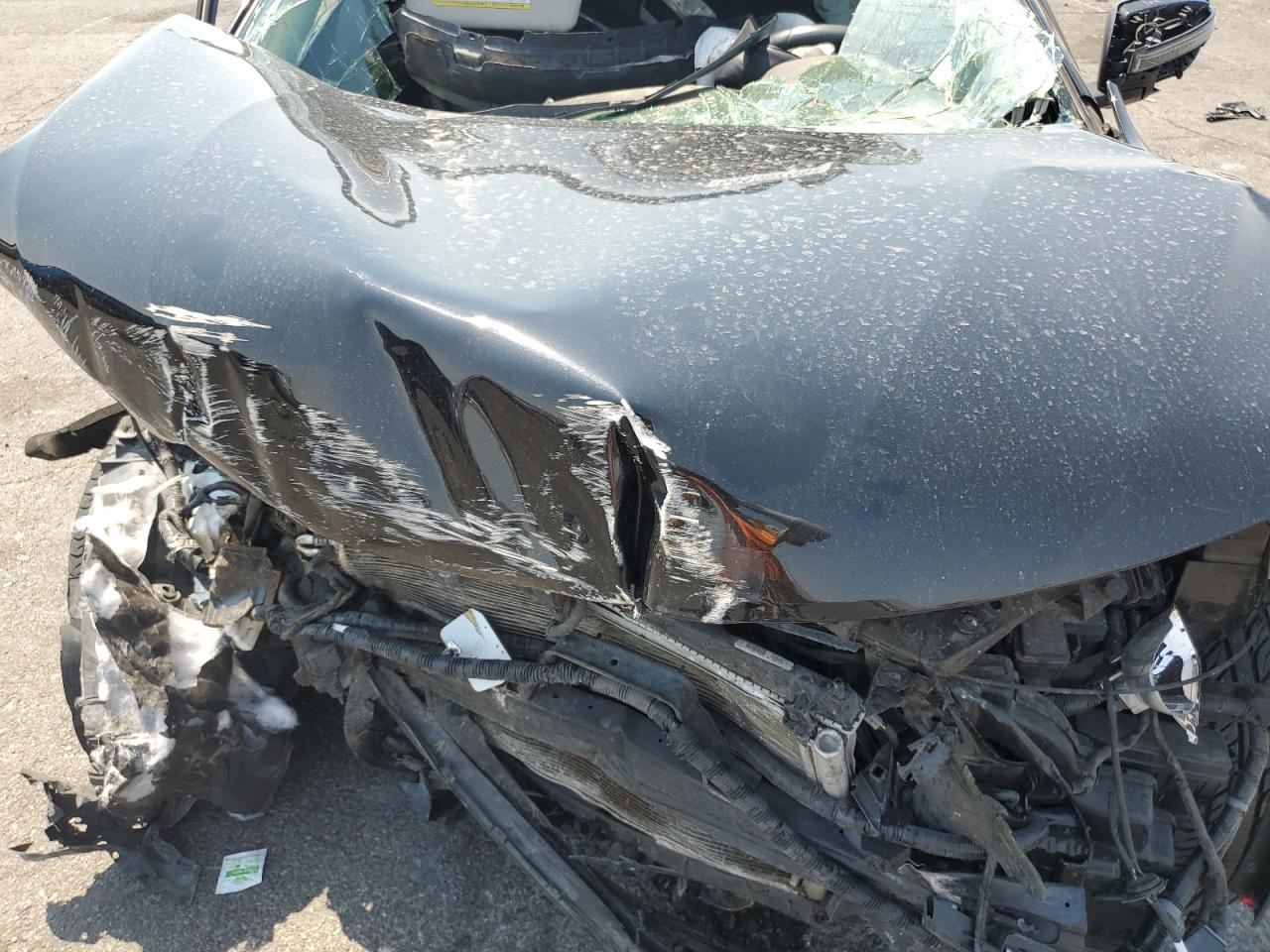 Severe frontal and side impact damage. Crushed front end, side panel damage, deployed airbags, and broken windows.