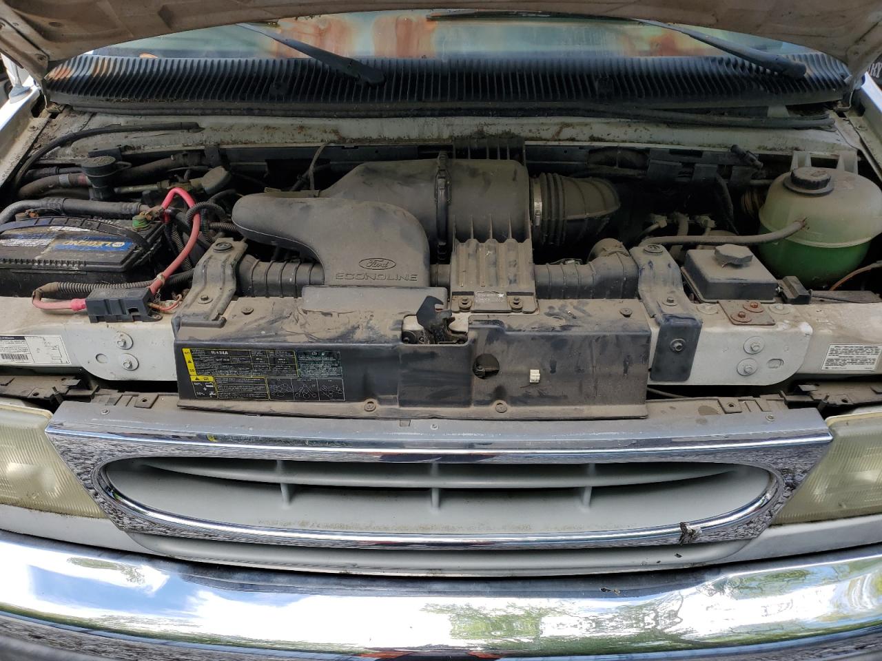The FORD ECONOLINE has suffered significant water damage, primarily affecting the roof and body panels. The interior shows signs of wear and potential water damage. The engine bay is dirty, and the overall condition suggests the vehicle requires considerable repair. The windshield shows some cracks as well. The vehicle is not drivable.