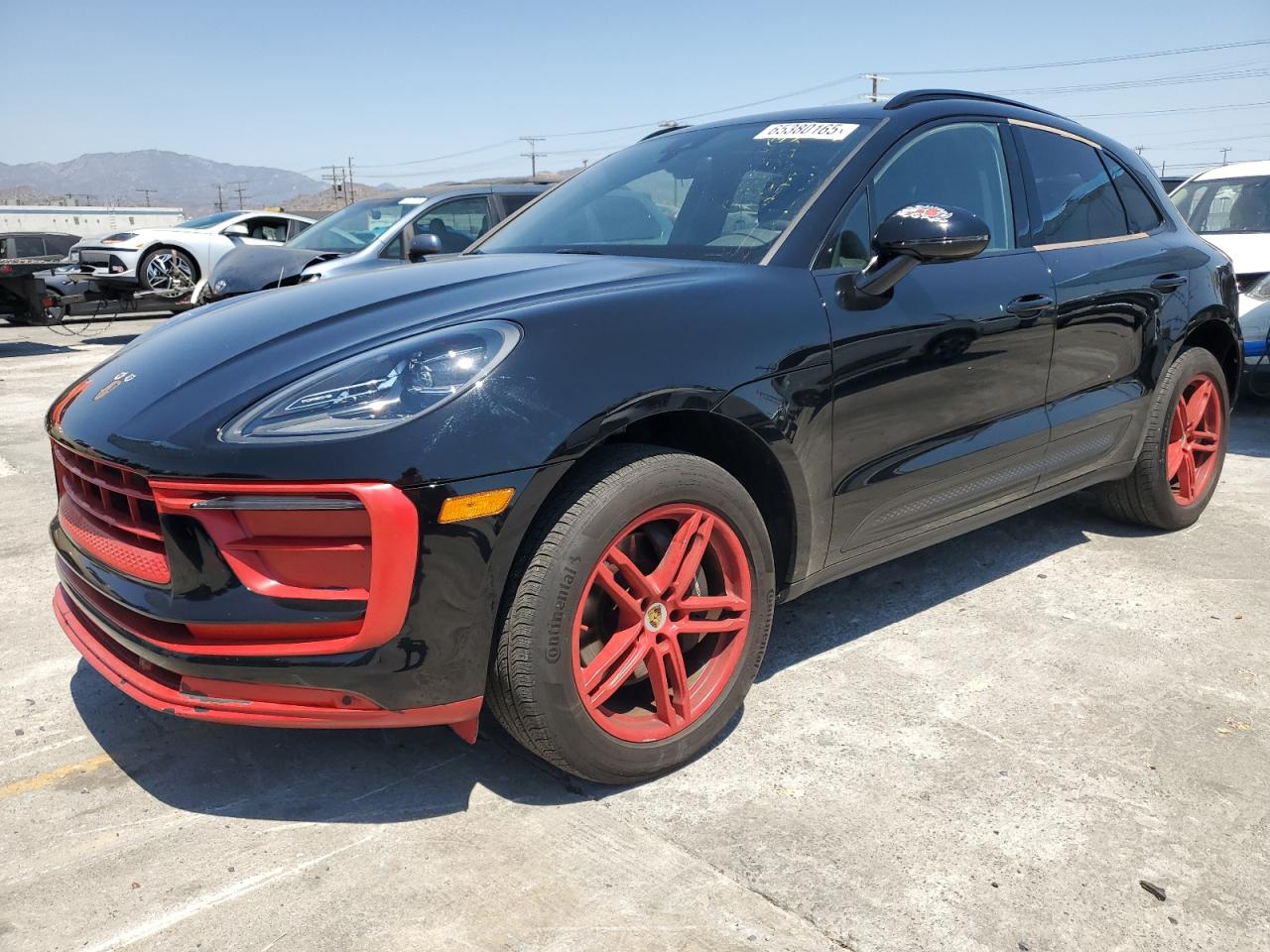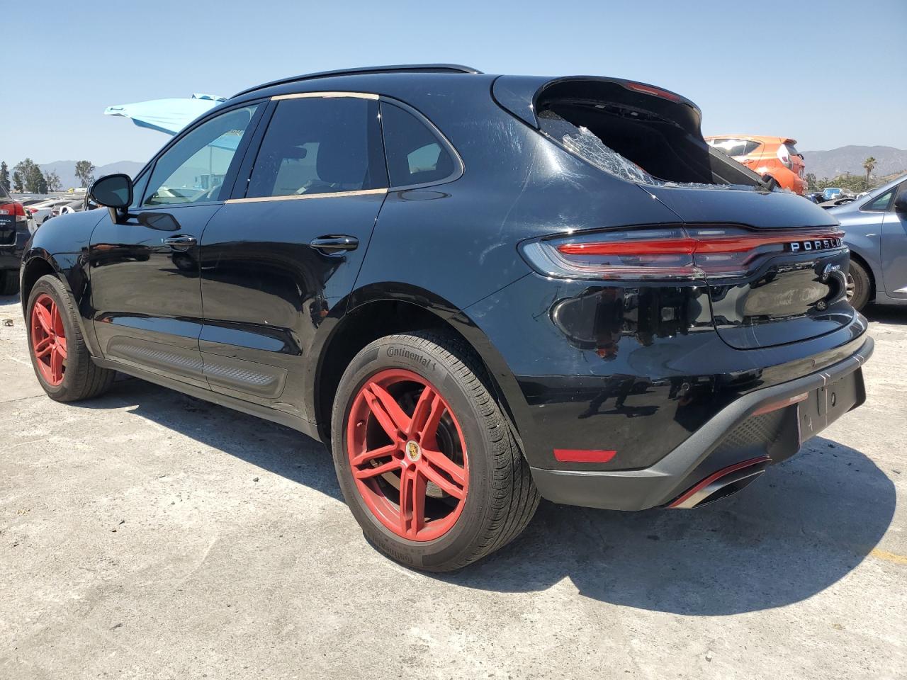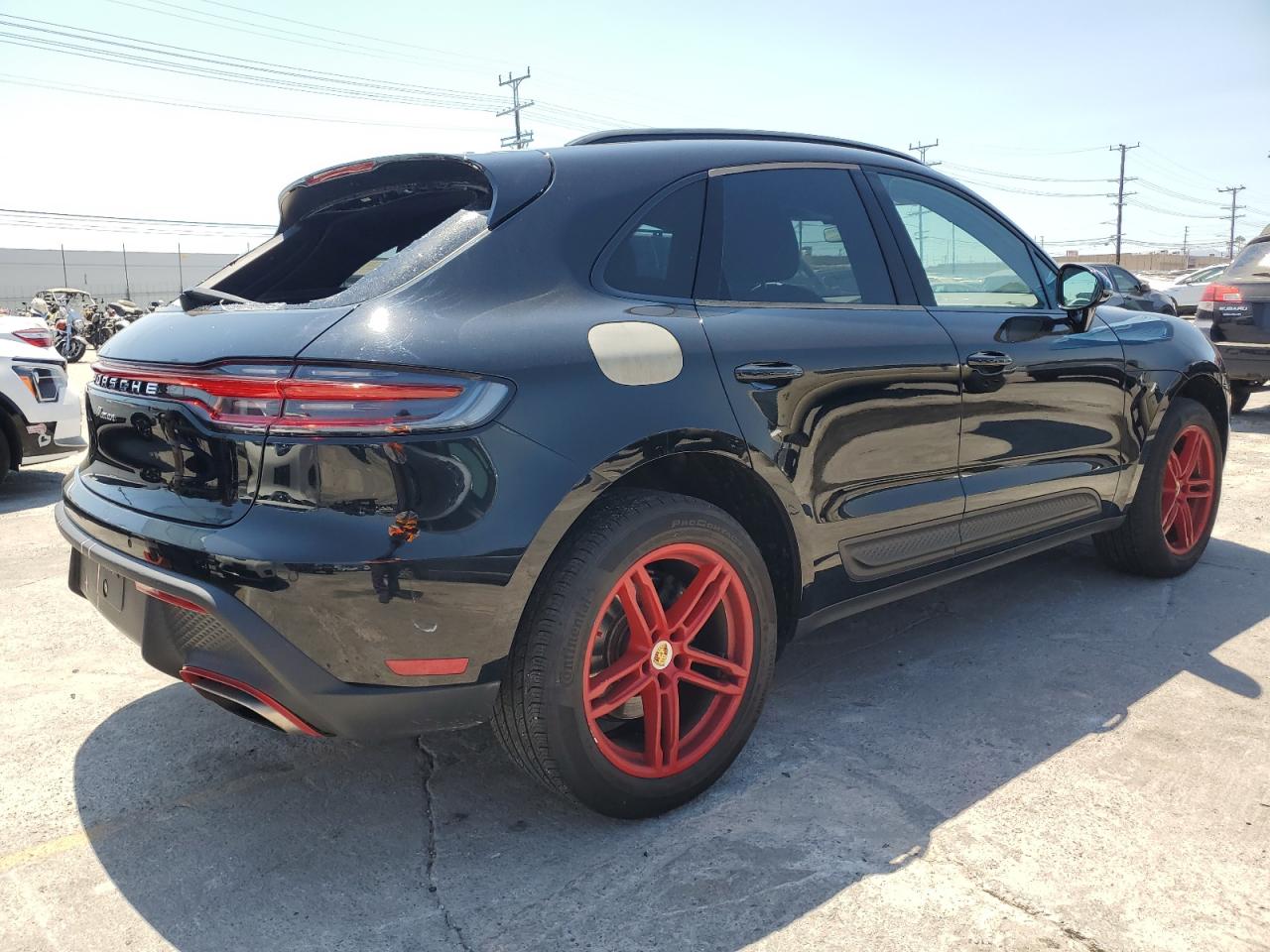 FairThis 2022 Porsche Macan, finished in black, presents with significant rear-end damage, including a shattered rear window. Despite the cosmetic issues, the car is listed as Run & Drive Verified. The red wheels are a striking visual element, contrasting with the black body. Interior appears to be mostly intact, but needs a thorough inspection.