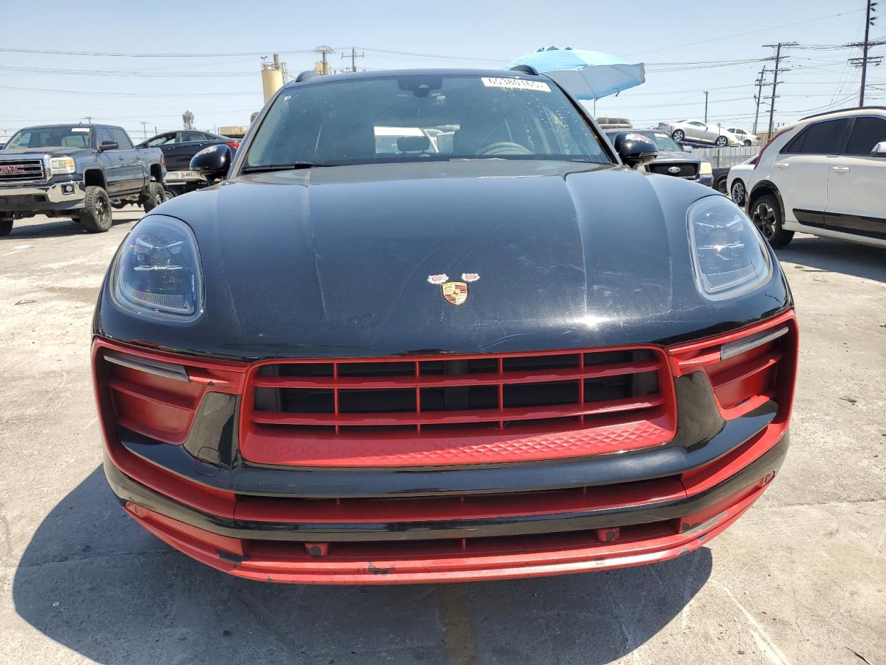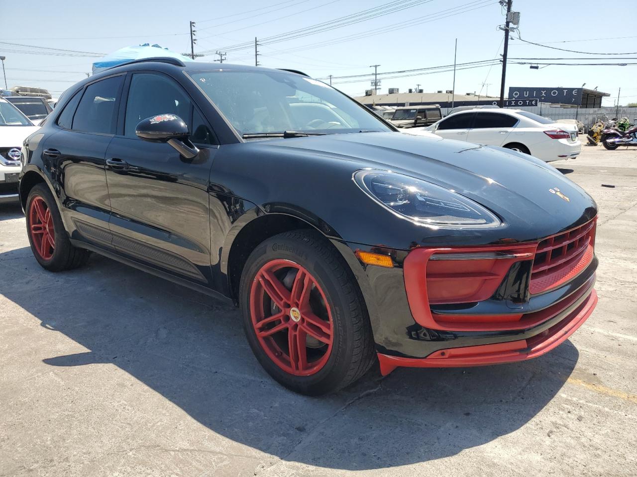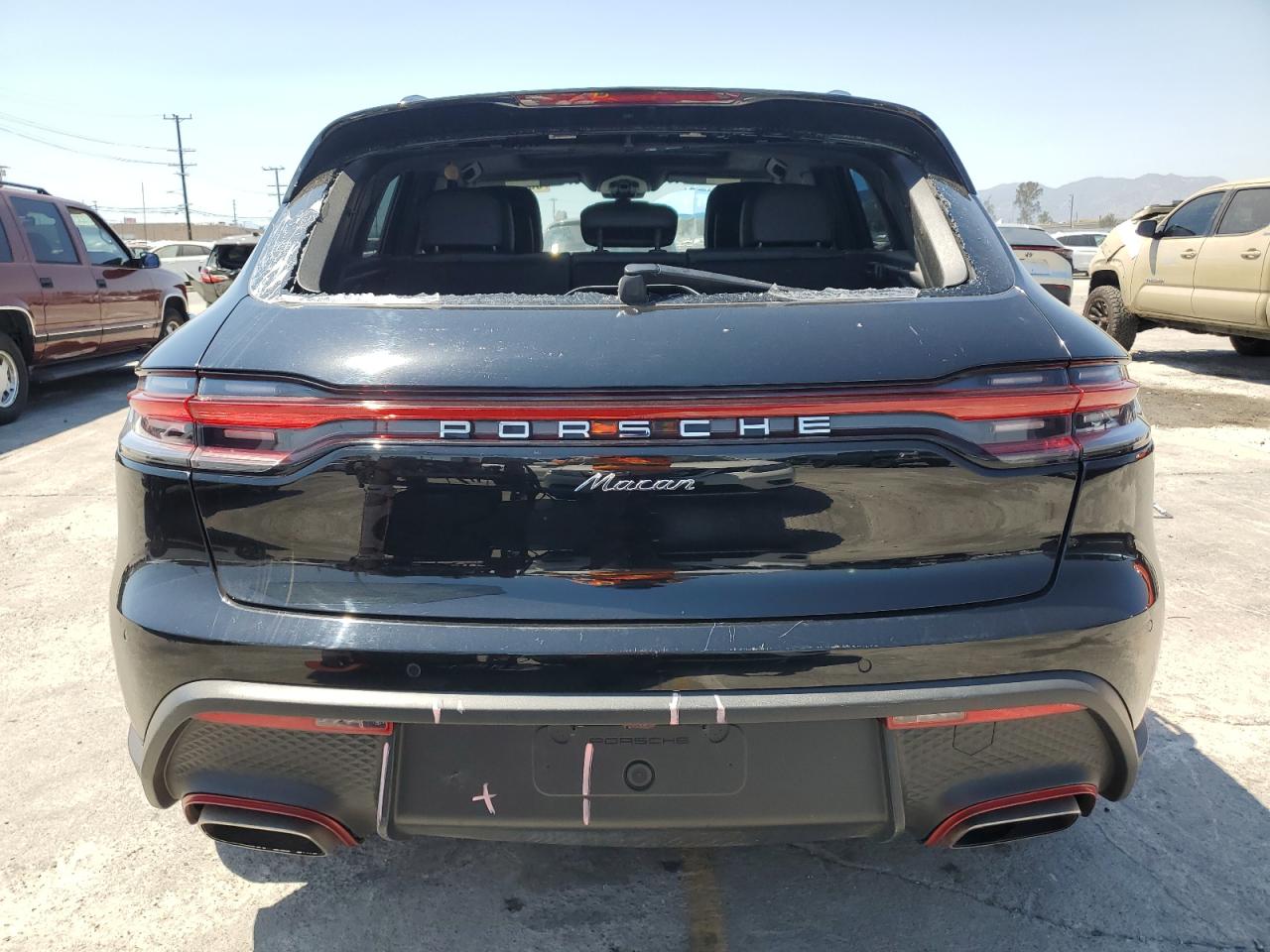 FairThis 2022 Porsche Macan, finished in black, presents with significant rear-end damage, including a shattered rear window. Despite the cosmetic issues, the car is listed as Run & Drive Verified. The red wheels are a striking visual element, contrasting with the black body. Interior appears to be mostly intact, but needs a thorough inspection.