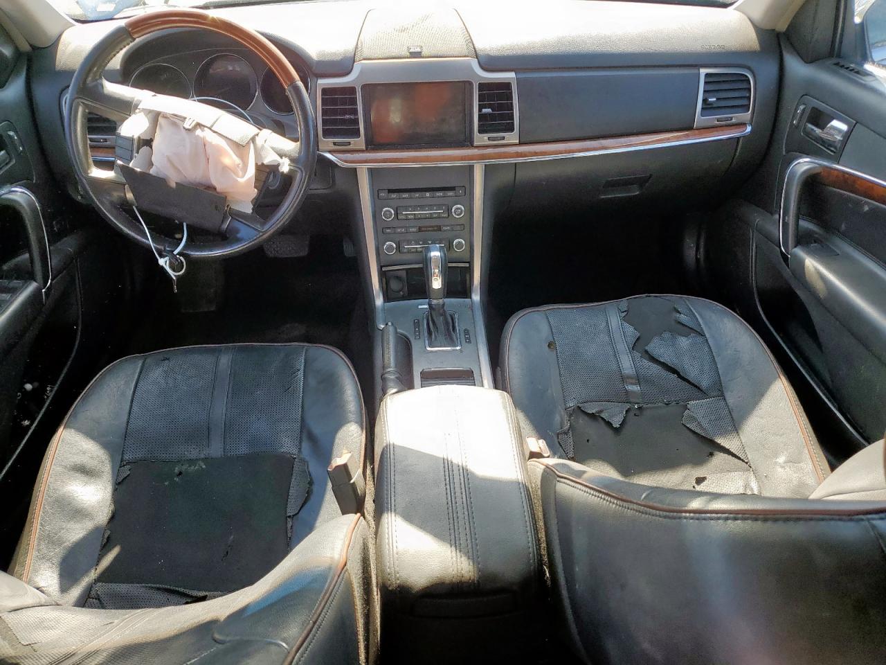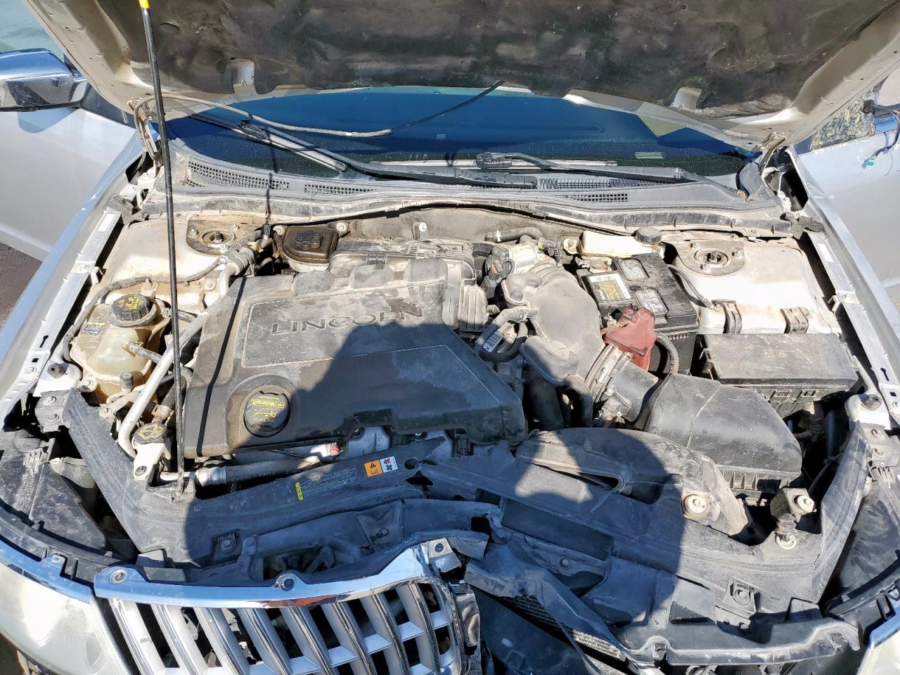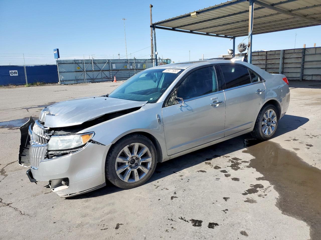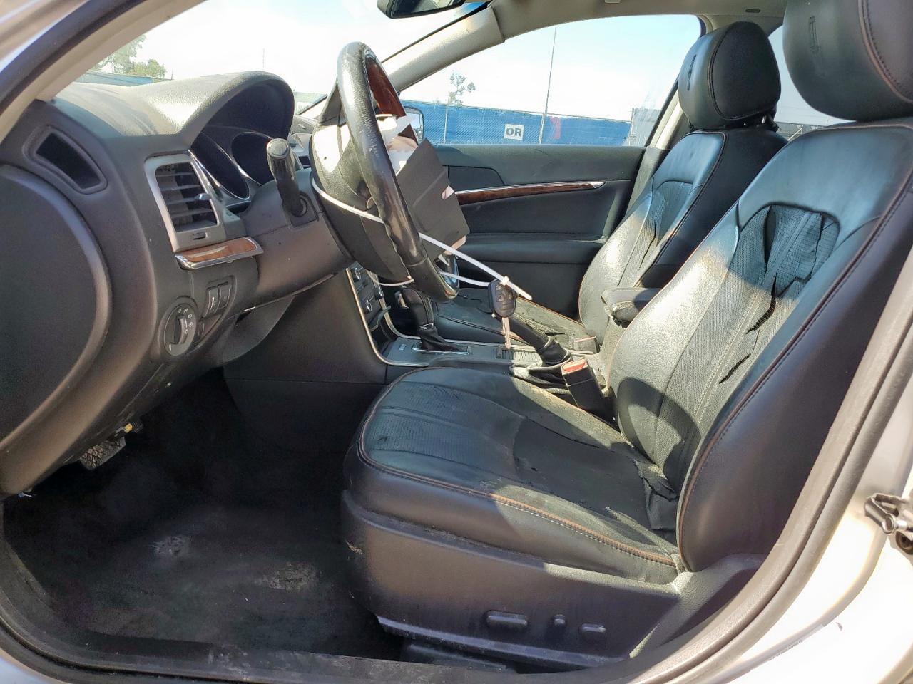 FairThe 2012 Lincoln MKZ, silver in color, exhibits FRONT END damage, with secondary MINOR DENT/SCRATCHES. The damage is concentrated at the front, indicating a collision. The wheels appear intact, while the lights and glasses may have sustained damage. Interior shows signs of wear, including potential airbag deployment. The vehicle's body has damage, and it is likely drivable, so the Overall Exterior Condition is one level higher.