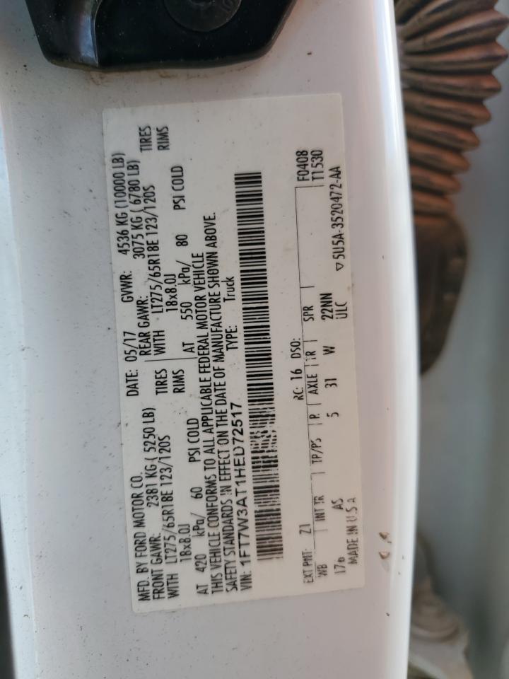 GoodThe 2017 FORD F350 SUPER DUTY is a white pickup truck, showcasing normal wear with no significant secondary damage. This truck, with a 'Run & Drive Verified' status, exhibits minor/moderate visible damage.
