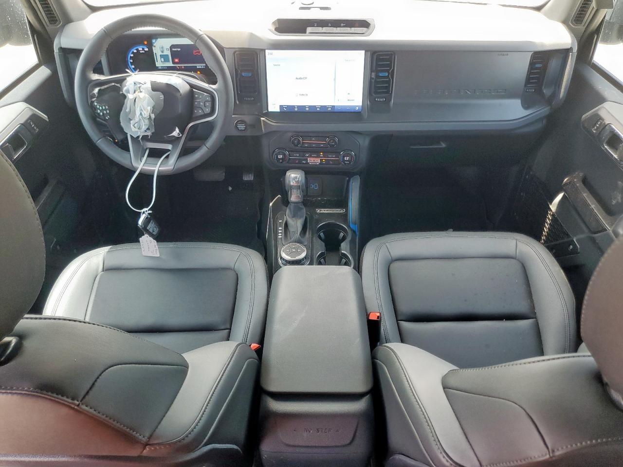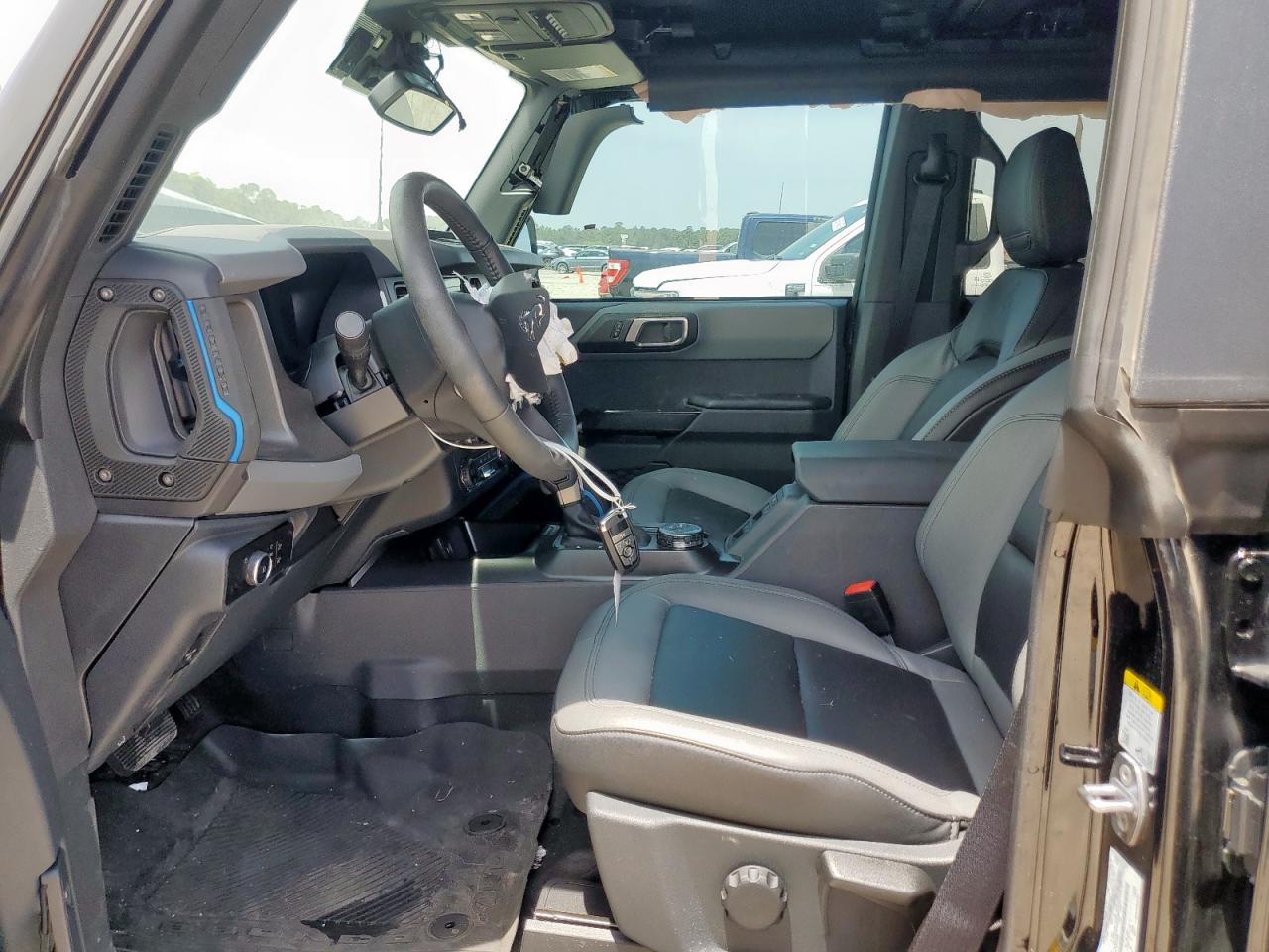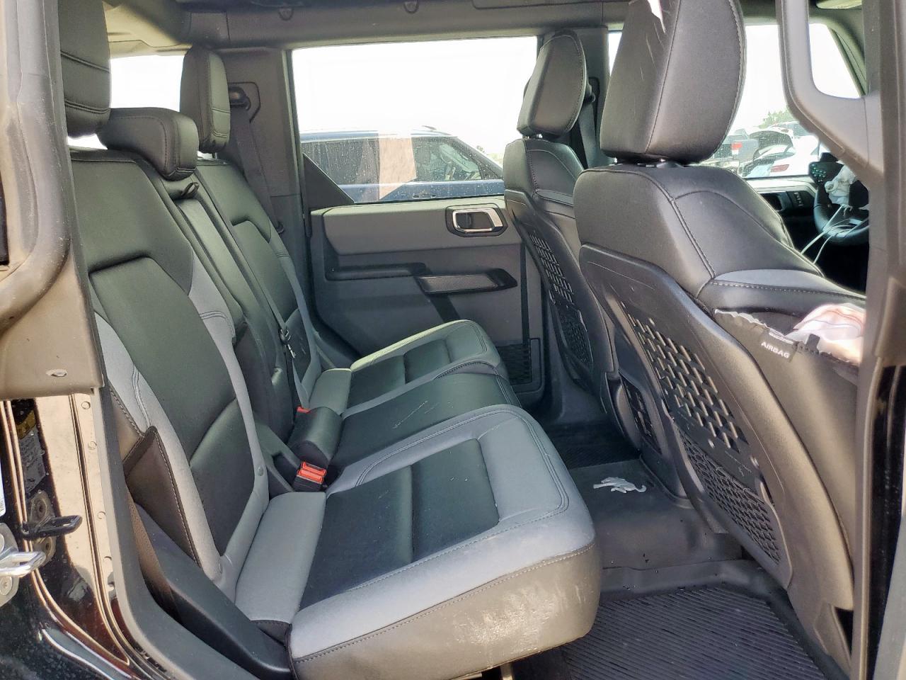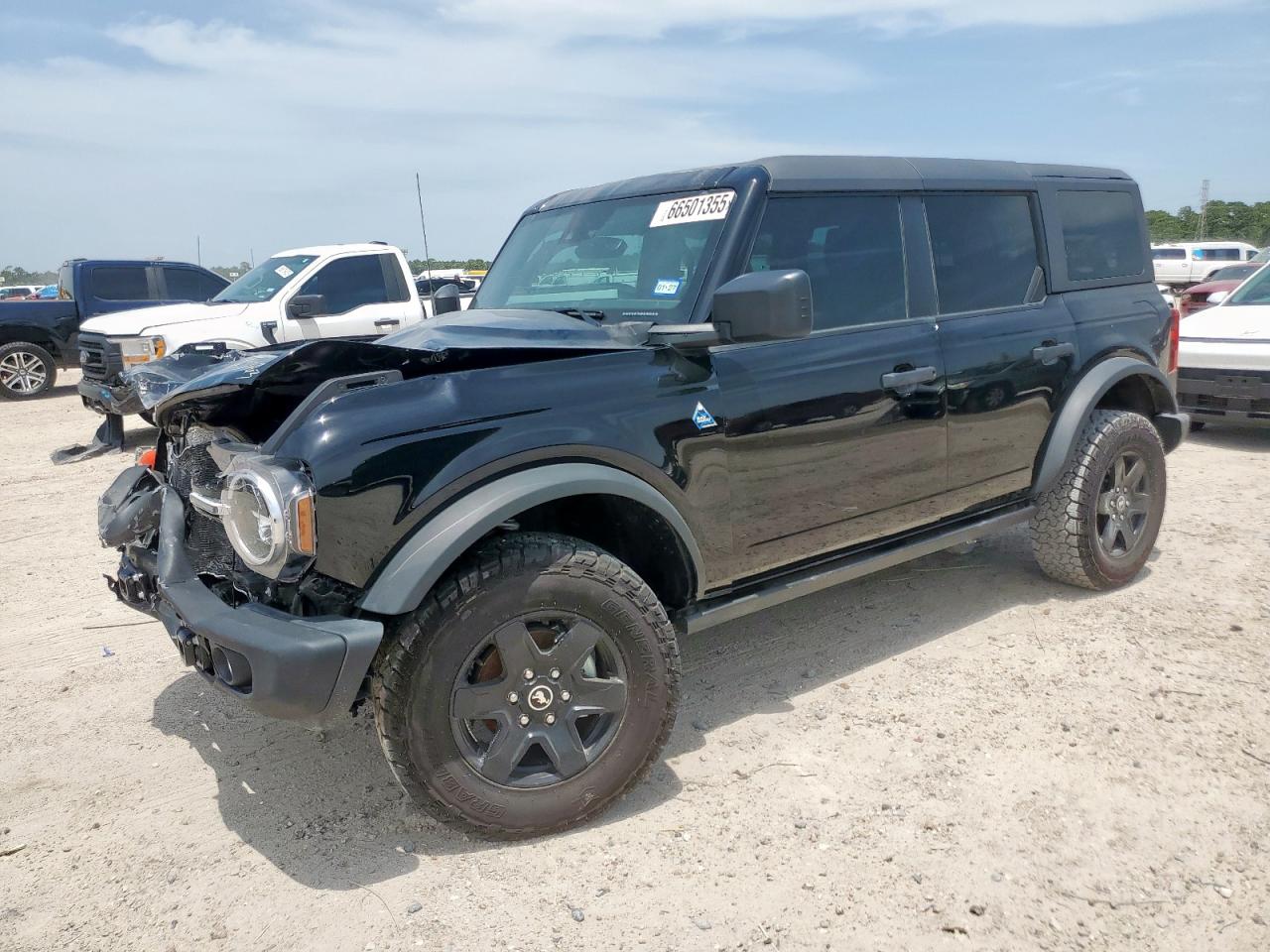FairThe black 2024 Ford Bronco has suffered significant front-end damage, including the front bumper, grill, and potentially the headlights. The rear of the car appears to be intact, with the spare tire mounted. The interior shows signs of wear but is in acceptable condition. There is dashboard damage indication and potentially the deployment of airbags. The vehicle is drivable, but requires significant repairs.