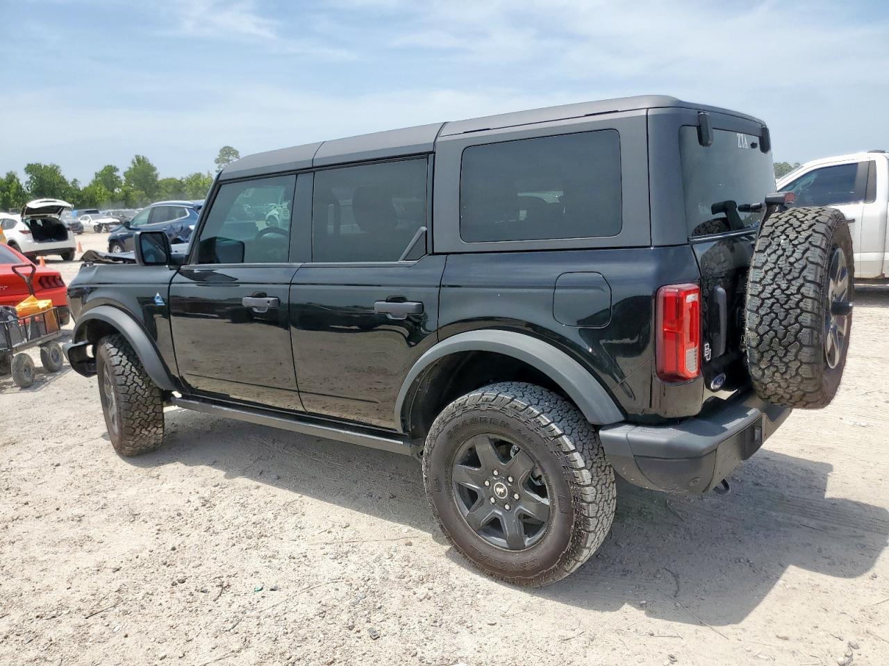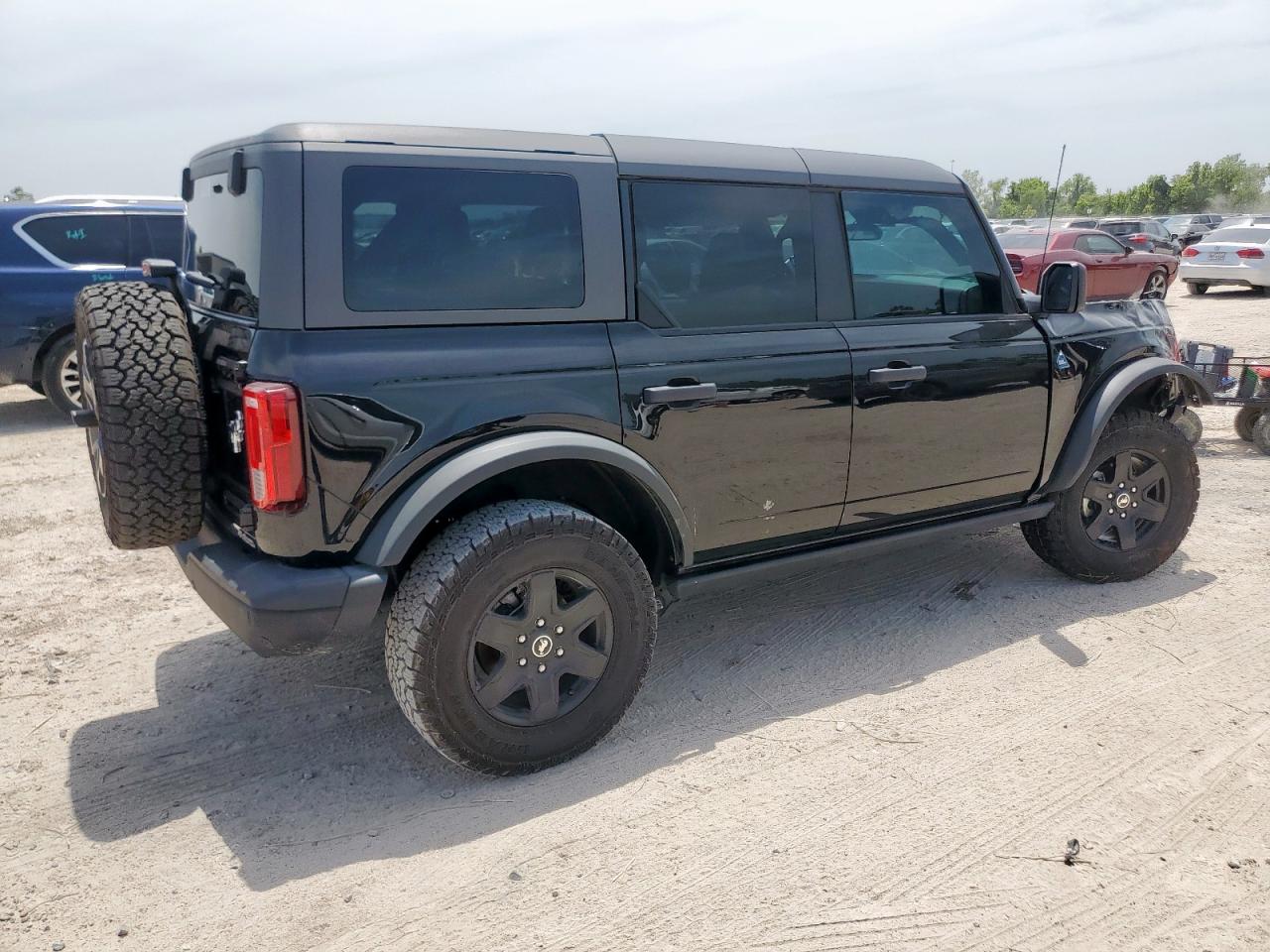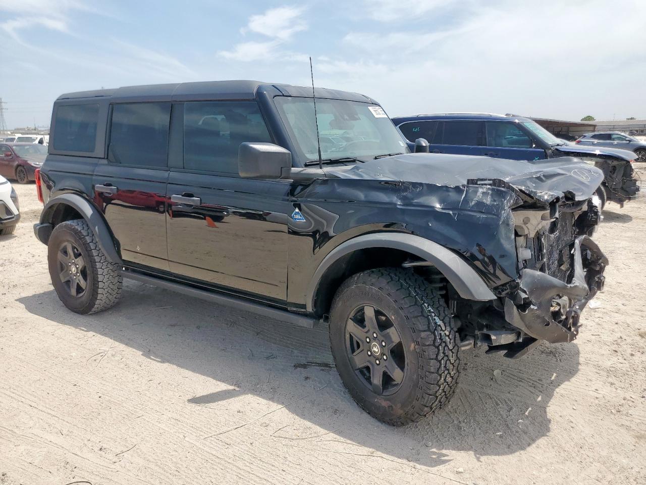 FairThe black 2024 Ford Bronco has suffered significant front-end damage, including the front bumper, grill, and potentially the headlights. The rear of the car appears to be intact, with the spare tire mounted. The interior shows signs of wear but is in acceptable condition. There is dashboard damage indication and potentially the deployment of airbags. The vehicle is drivable, but requires significant repairs.